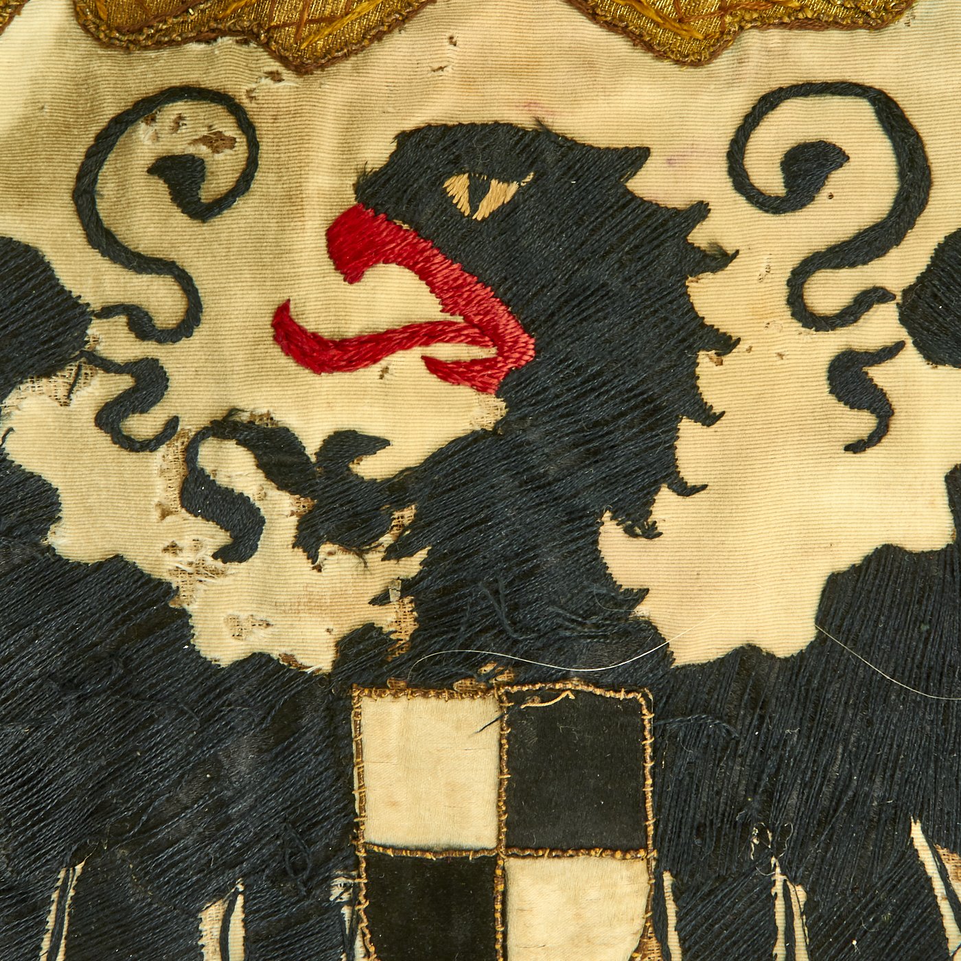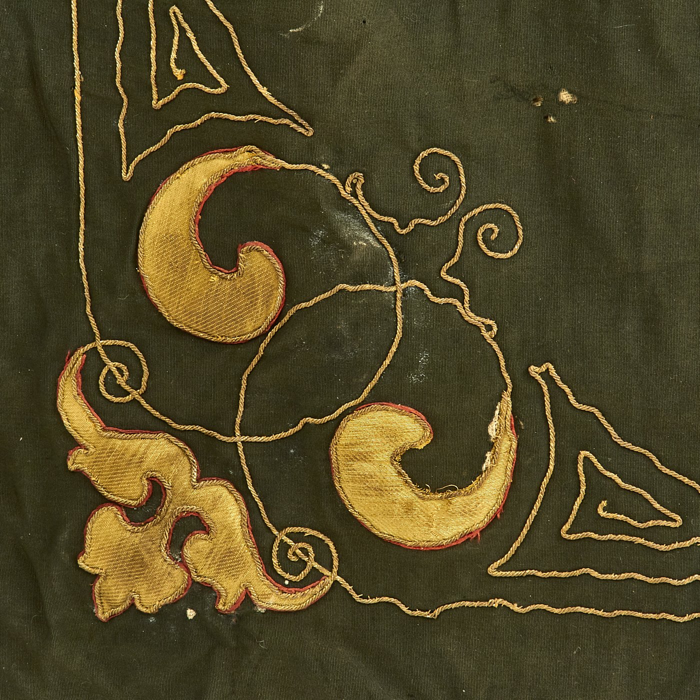 There is of course some damage from age and wear, and it looks like the flag was at some point cut off of its mountings, probably when it as brought back after WWI or WWII by a soldier.