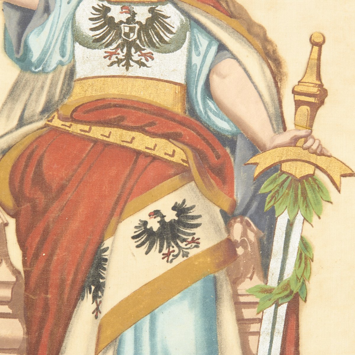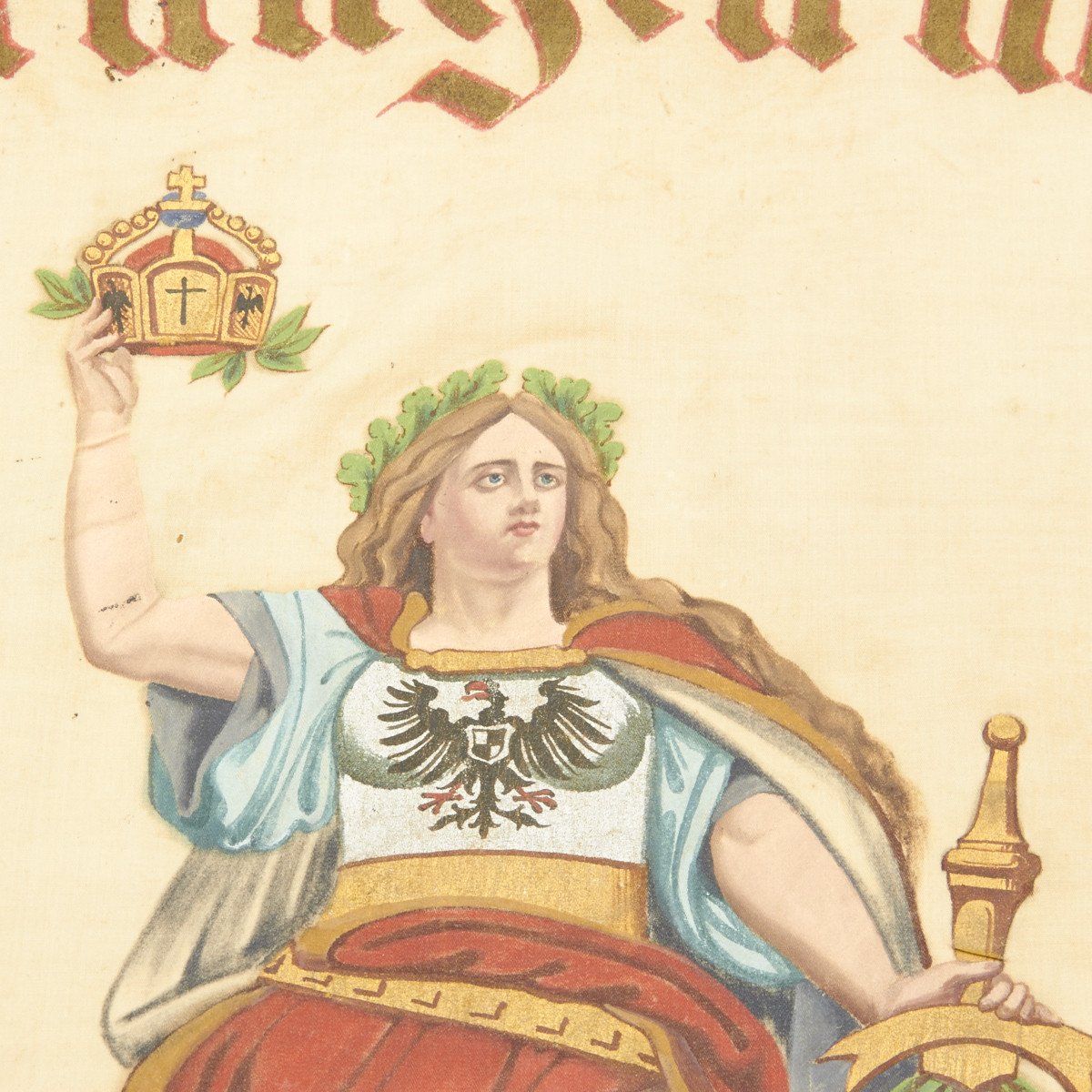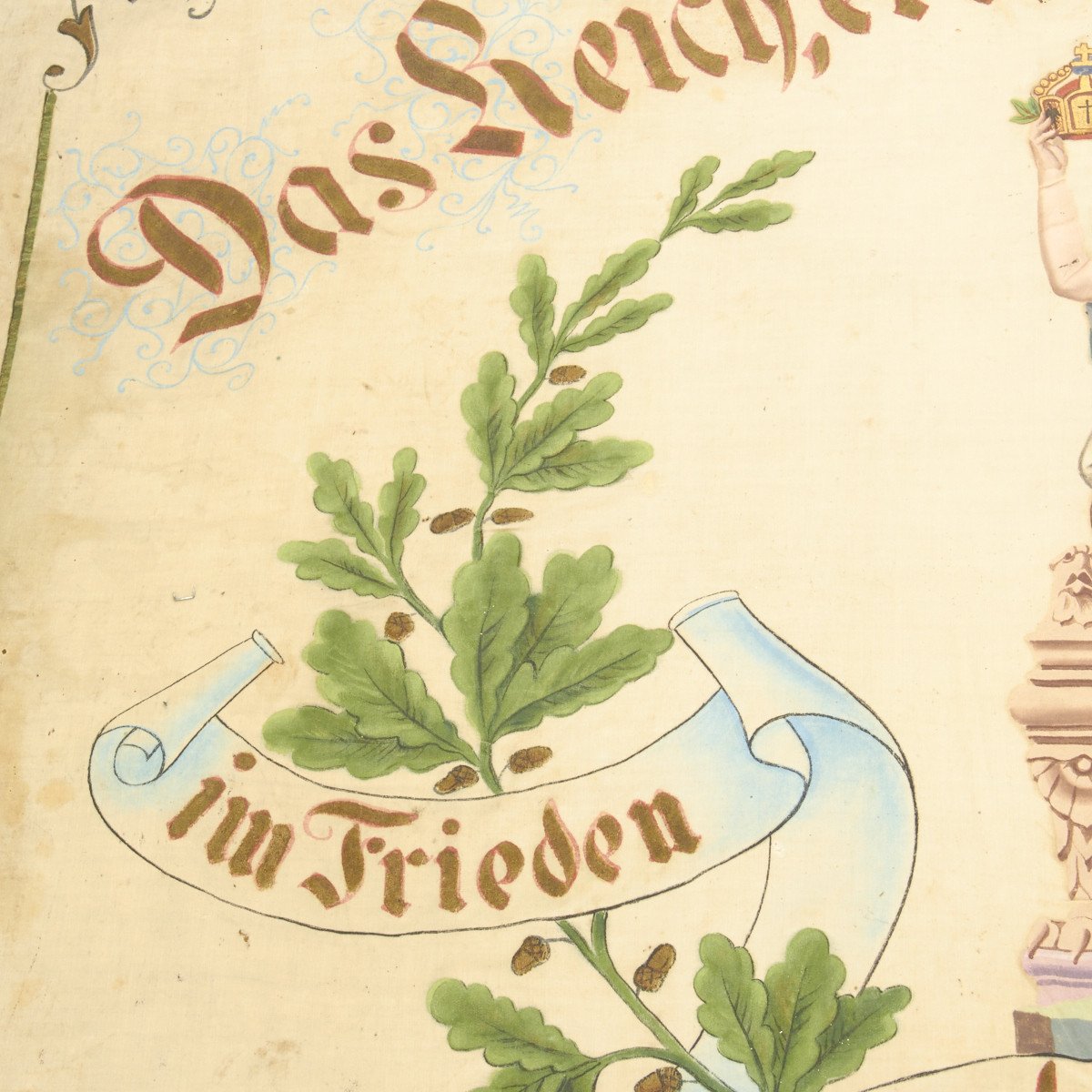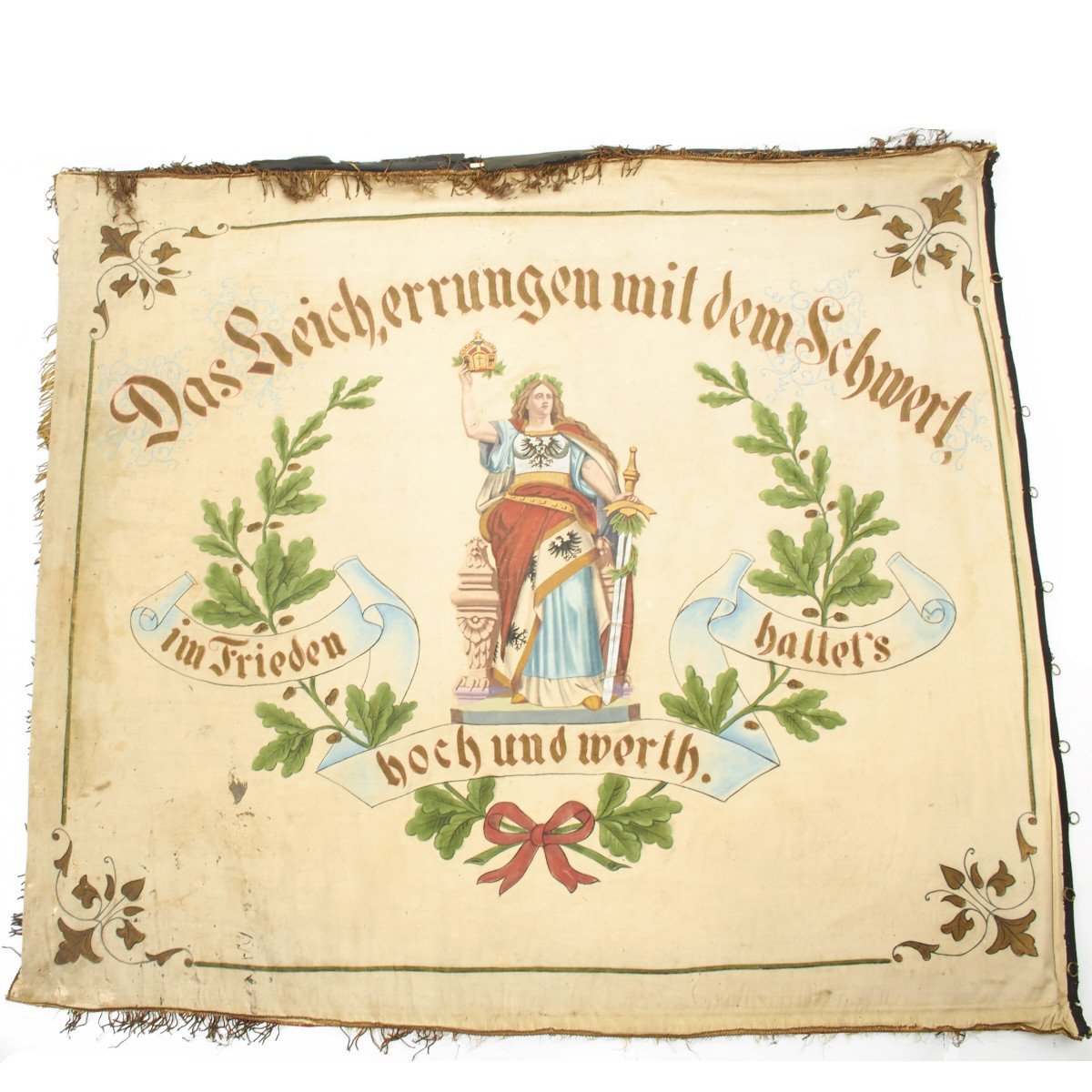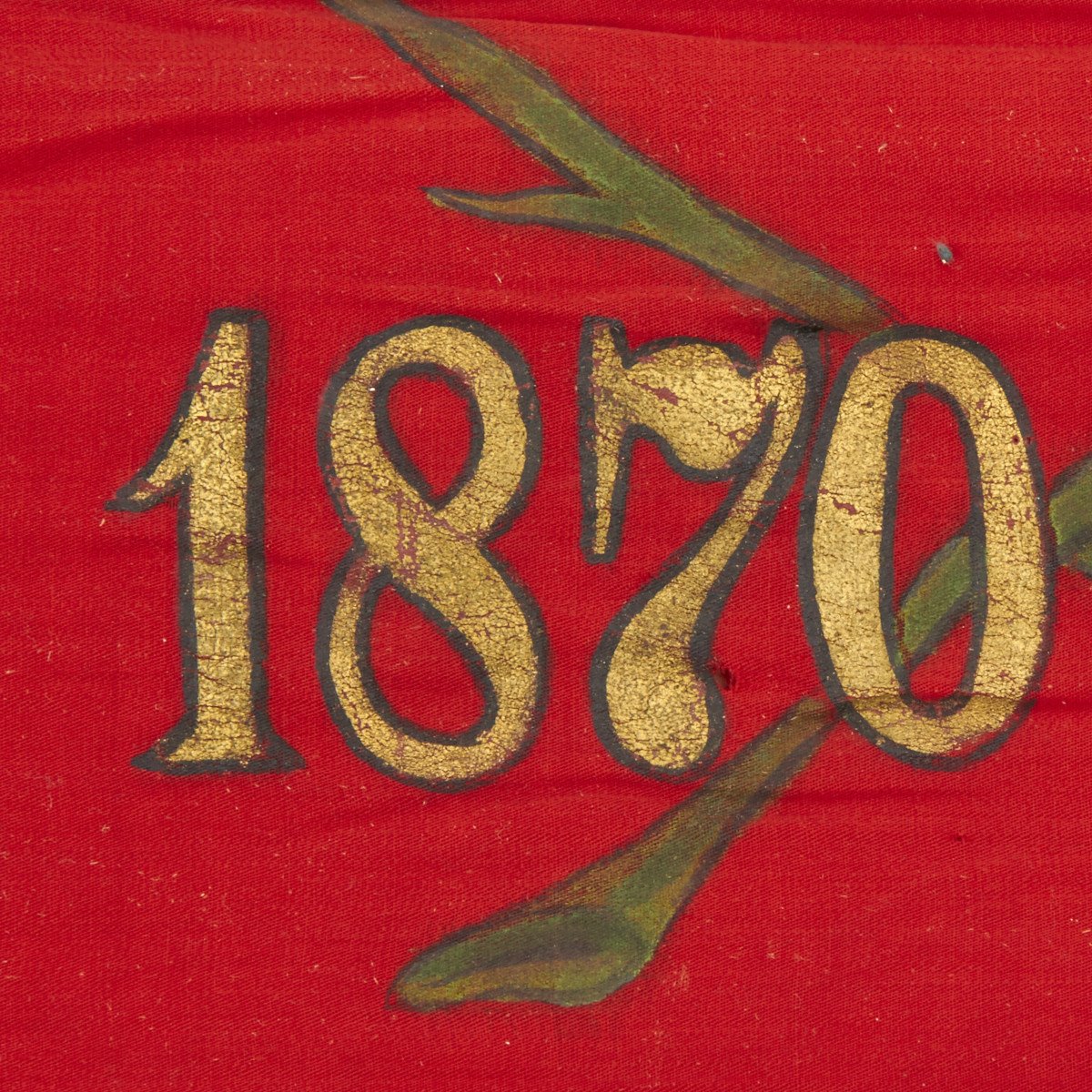 All enclosed by a laurel wreath laid upon a Black, White and Red background of the National Colors. The flag is dated across the bottom in gold numerals "1870-1871".