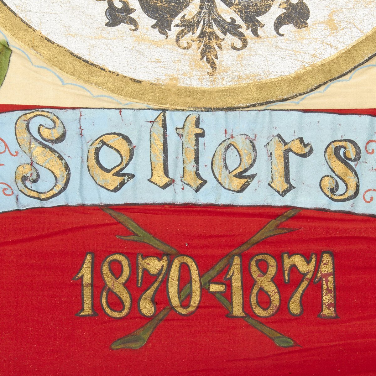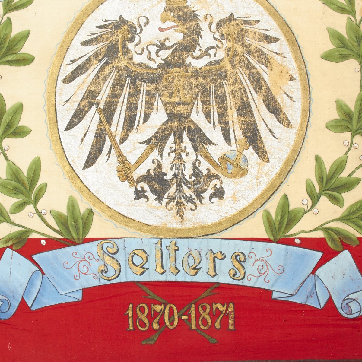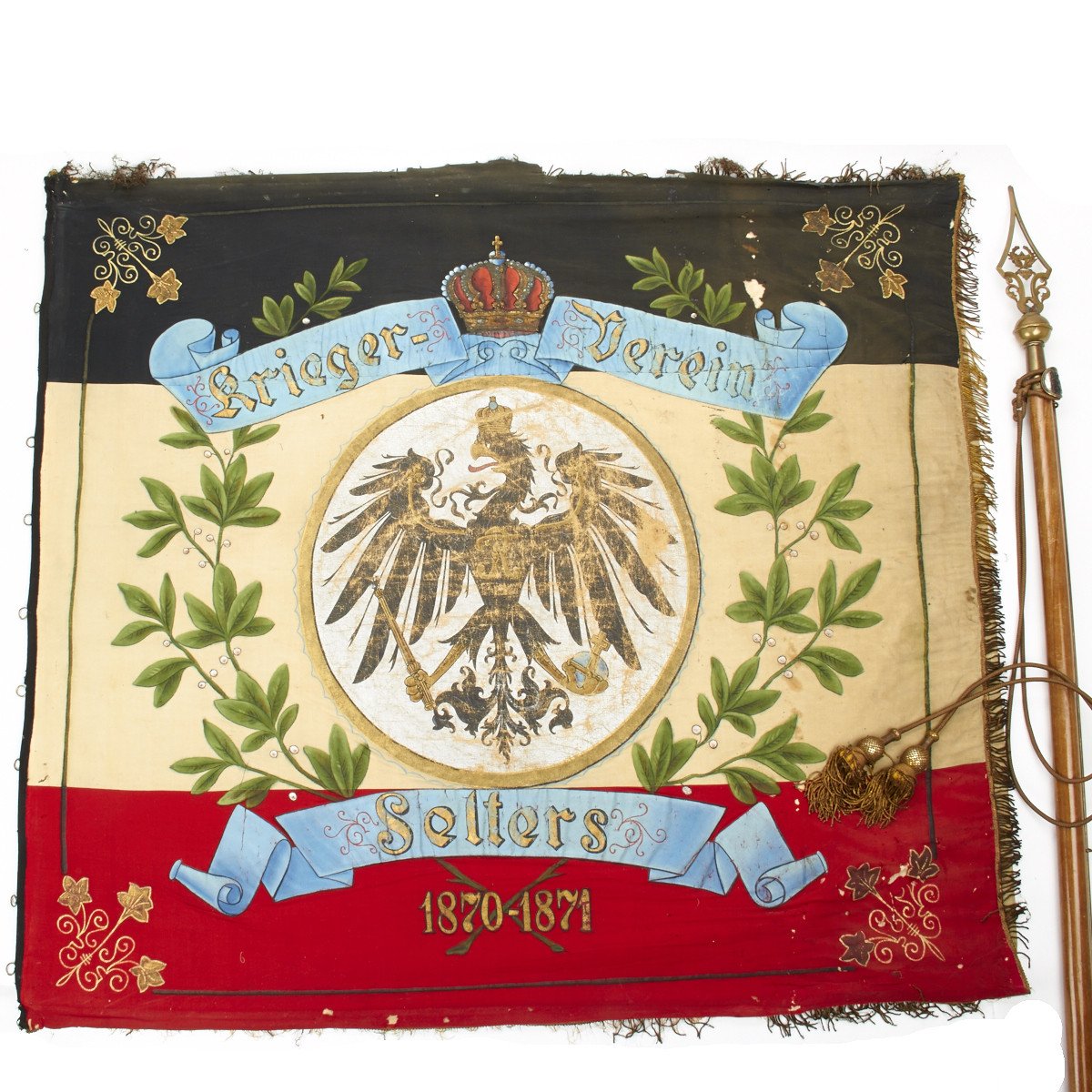 The flag features the Imperial German Spread Eagle in a gold circle under a Crown and blue ribbon stating "Krieger Verein" to the top and "Selters" to the bottom.