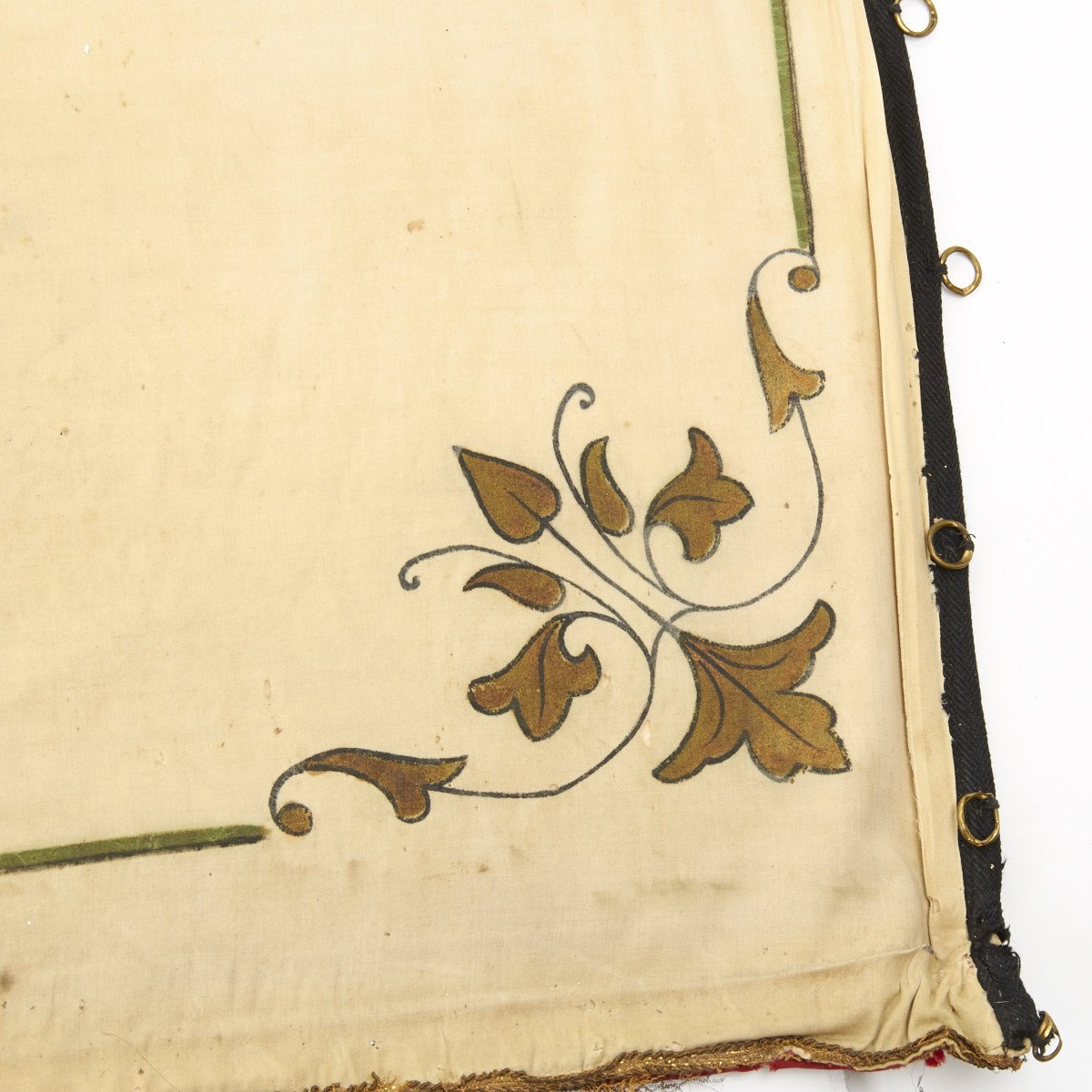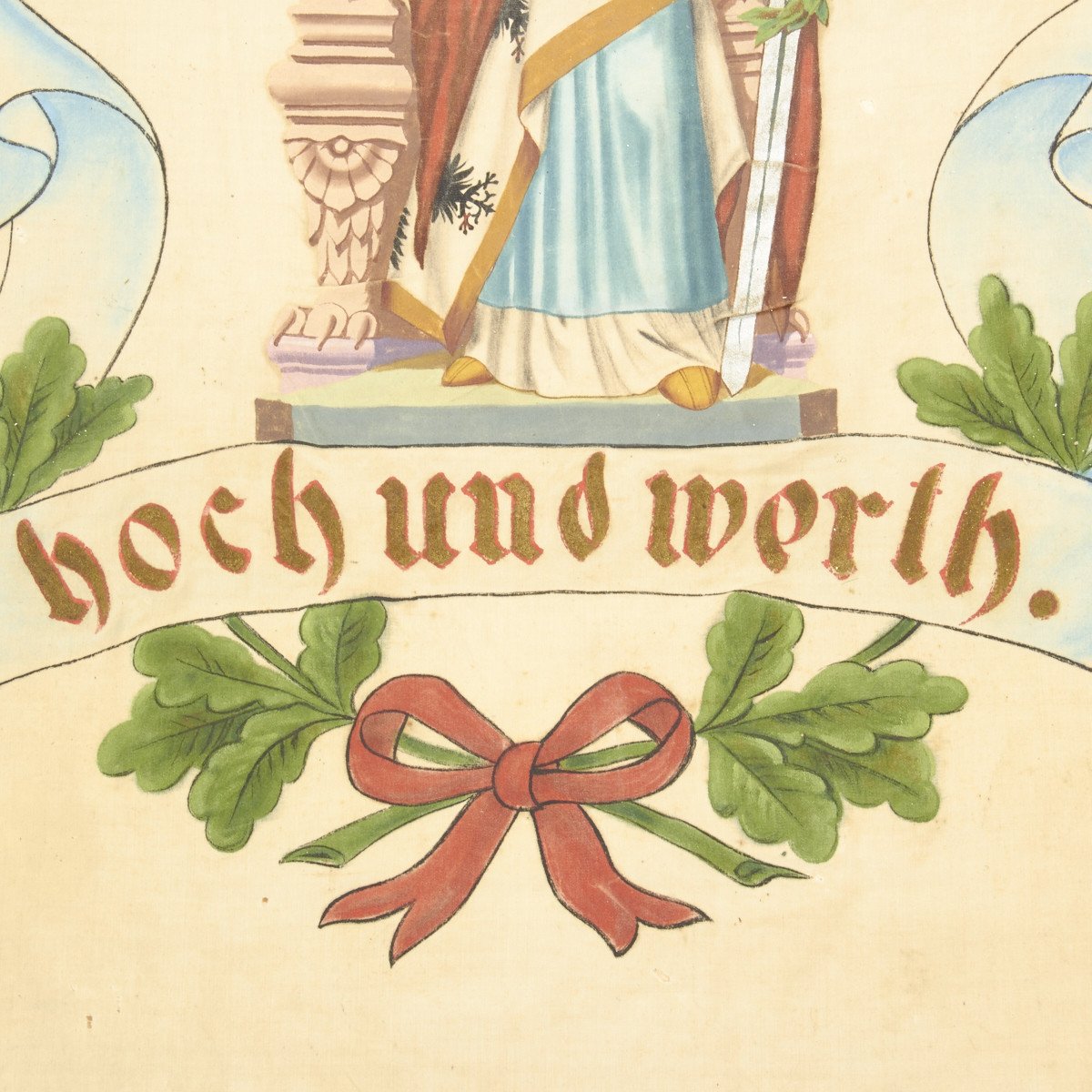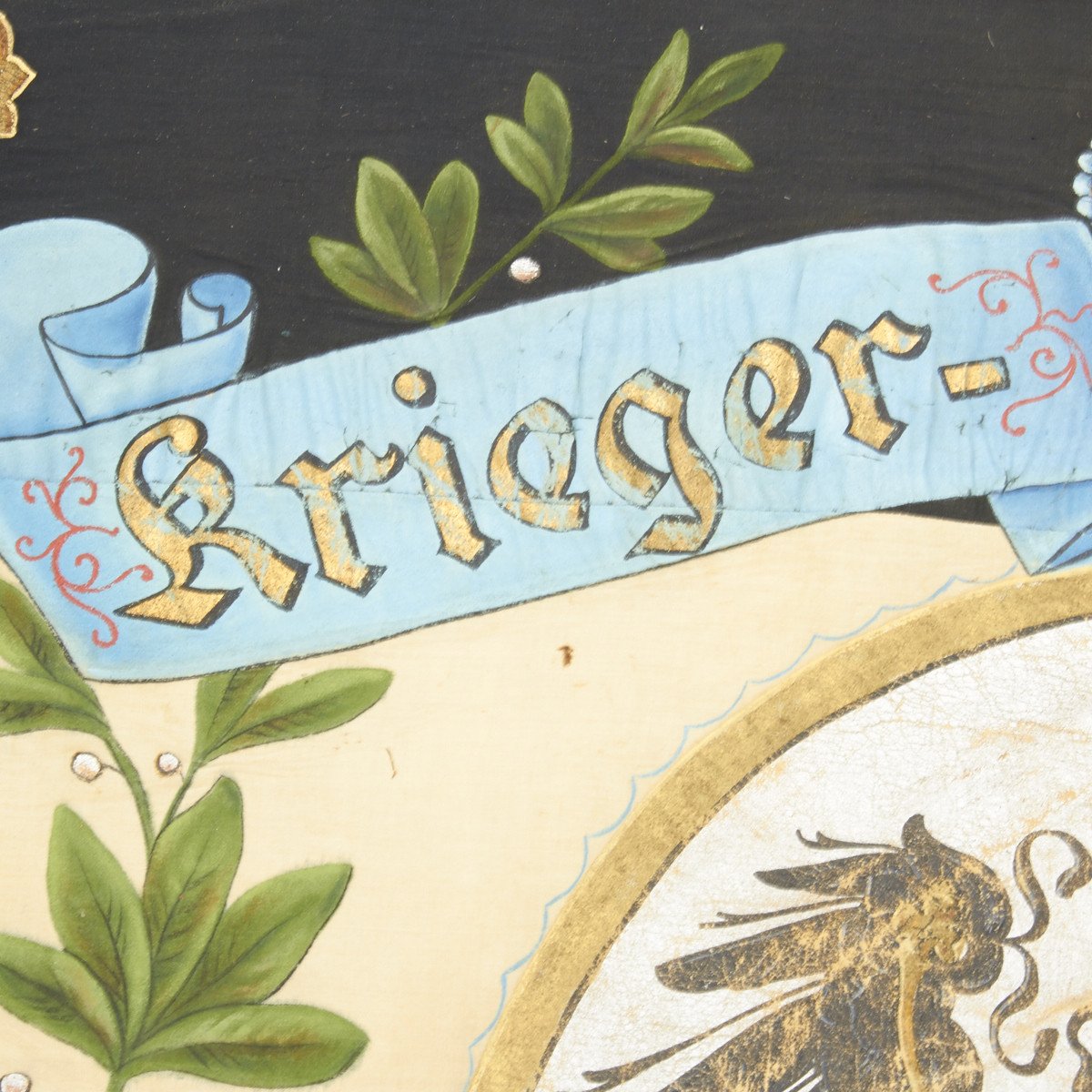 Slight moth damage and evidence of the gold fringe fraying can also be seen. We know from experience that this is a double-sided flag, the other side depicting the famous Lady Liberty style figure of "The Watch over the Rhine" (fans of our TV show Family Guns will remember a second very similar flag we had to this, which was sold in 2011). This flag could certainly benefit from being mounted in a double-sided frame mounting.