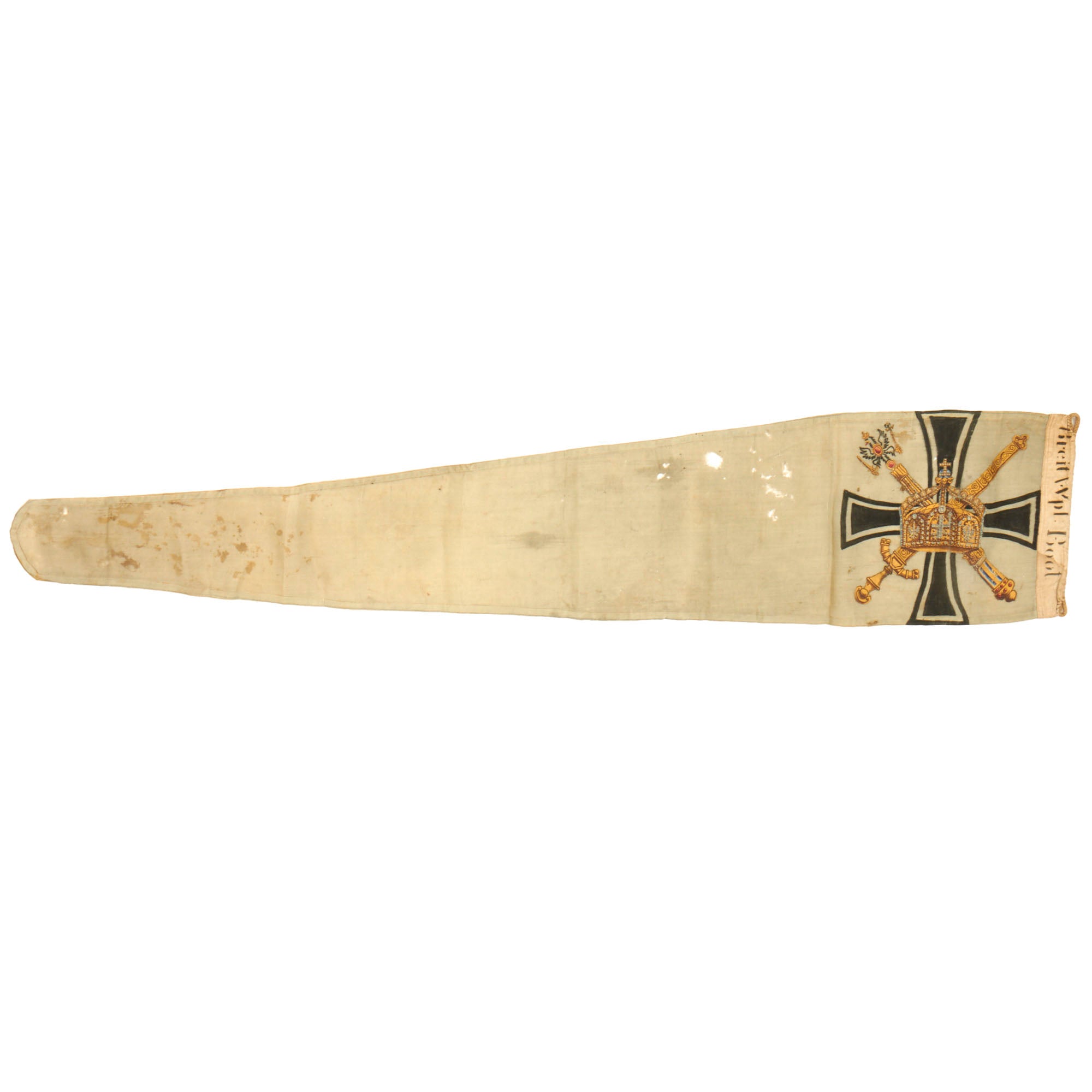 Original Item. One-of-a-Kind. This is one of the scarcest pieces of Kaiserliche Marine militaria we have ever offered, a Breitwimpel des Kaisers, or Emperor’s Broad Pennant. Measuring roughly 69” long by 13½” wide, this pennant is the highest command symbol of the Imperial German Navy, only raised by special command of the Kaiser.