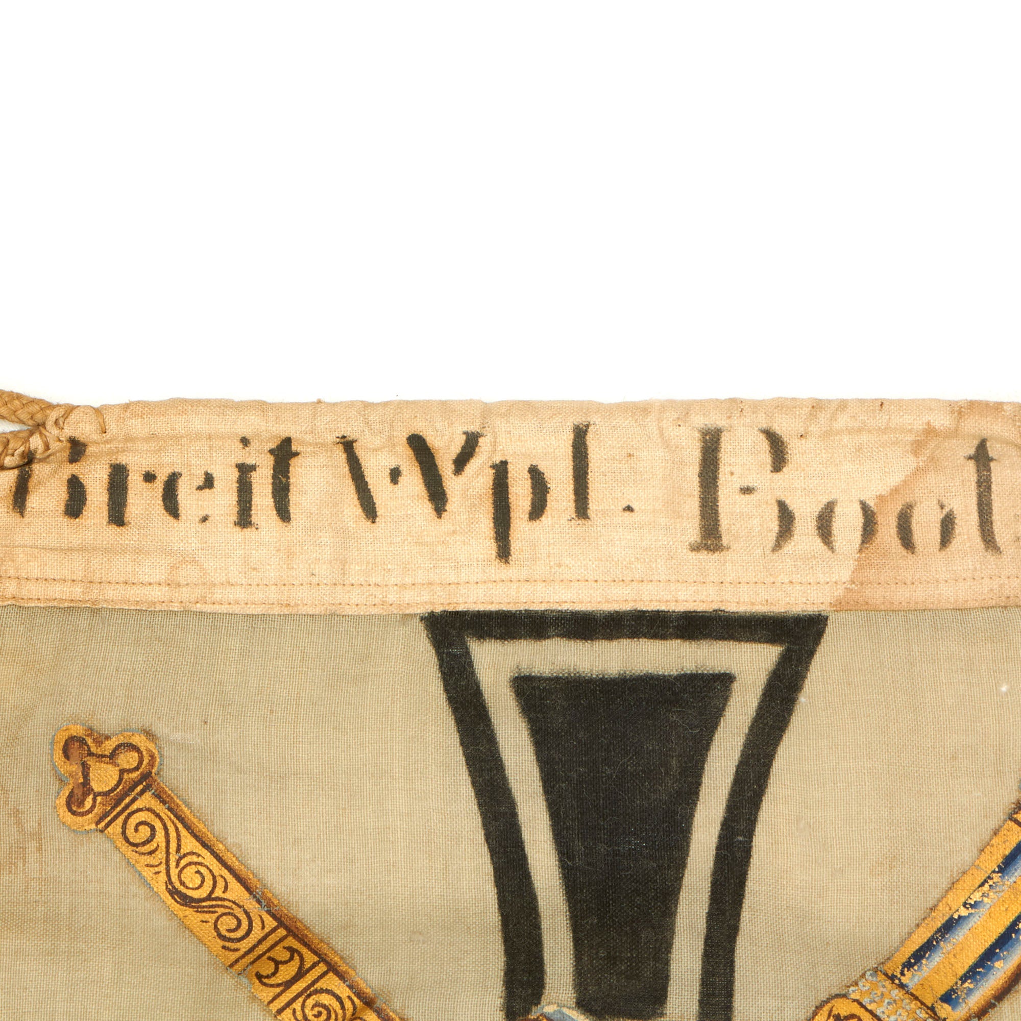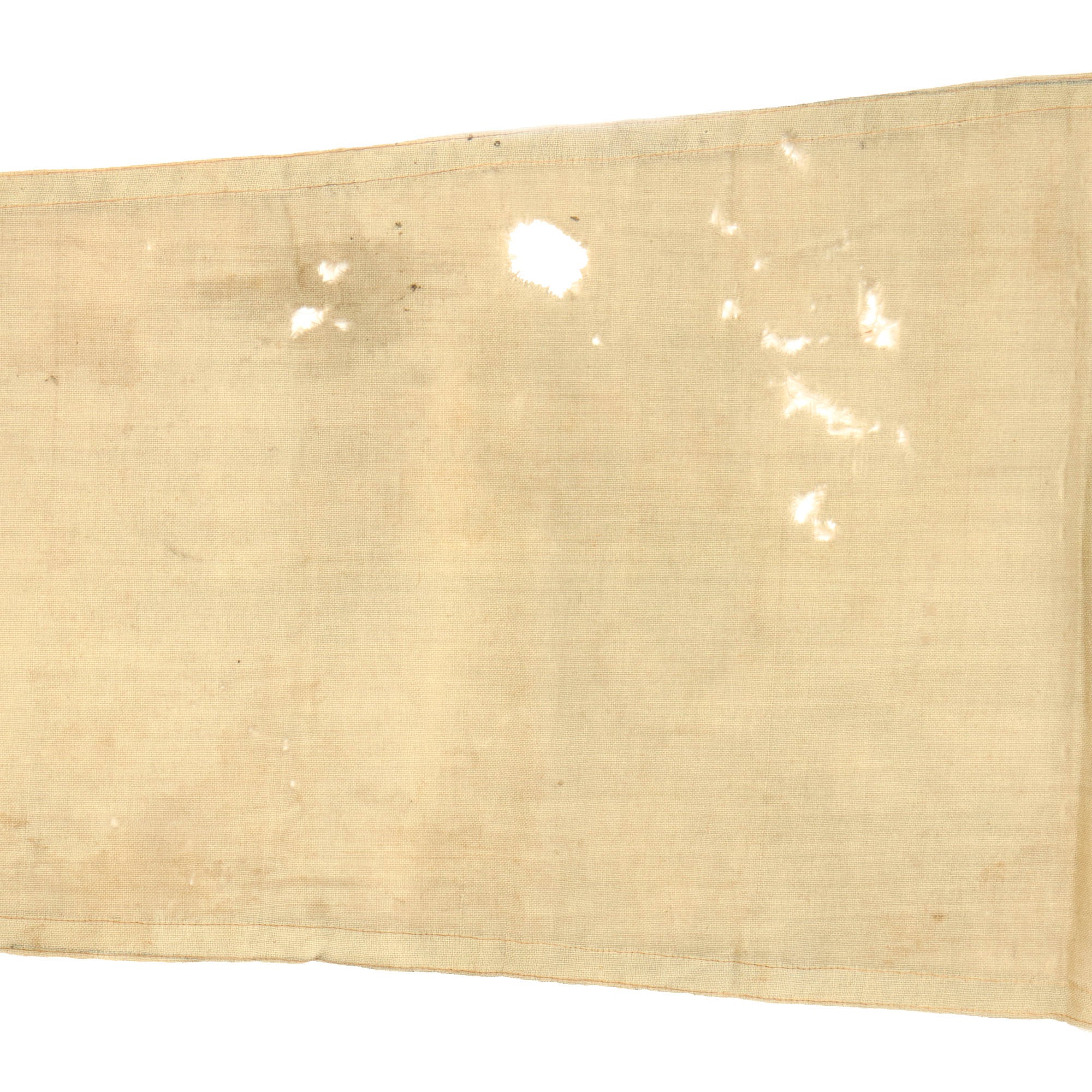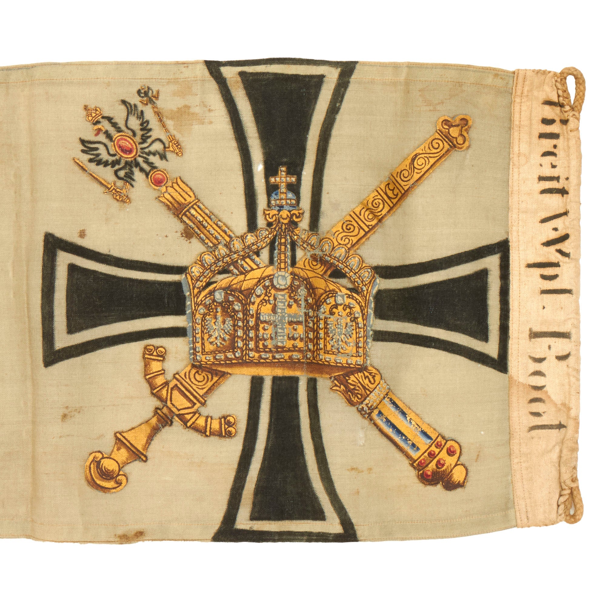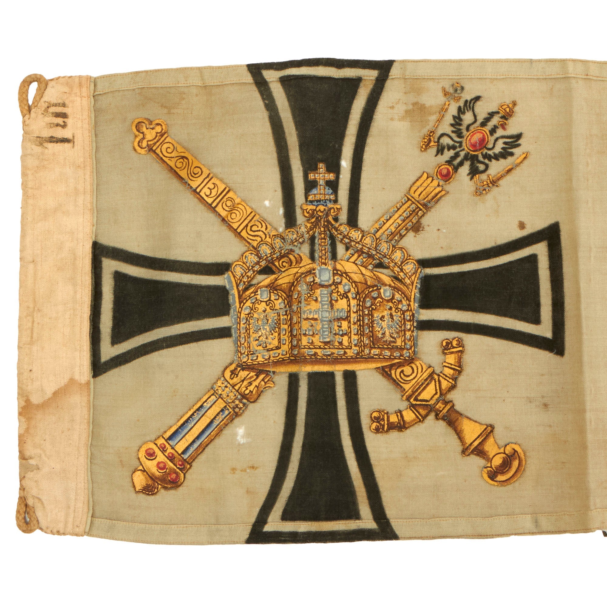 This is a white broad pennant, & hand-painted in the hoist is the Imperial crown on a scepter and sword on an Iron Cross on a white field. The crown, sword, & scepter are all heavily detailed, the crown encrusted with jewels & the scepter topped with the Imperial German Eagle himself holding a sword & scepter. This is painted on both sides of the pennant. On the header, Breit Wpl. Boot is stamped, meaning Broad Pennant, Boat. There is a possible size marking on the back, 1 followed by two letters that we can’t discern.