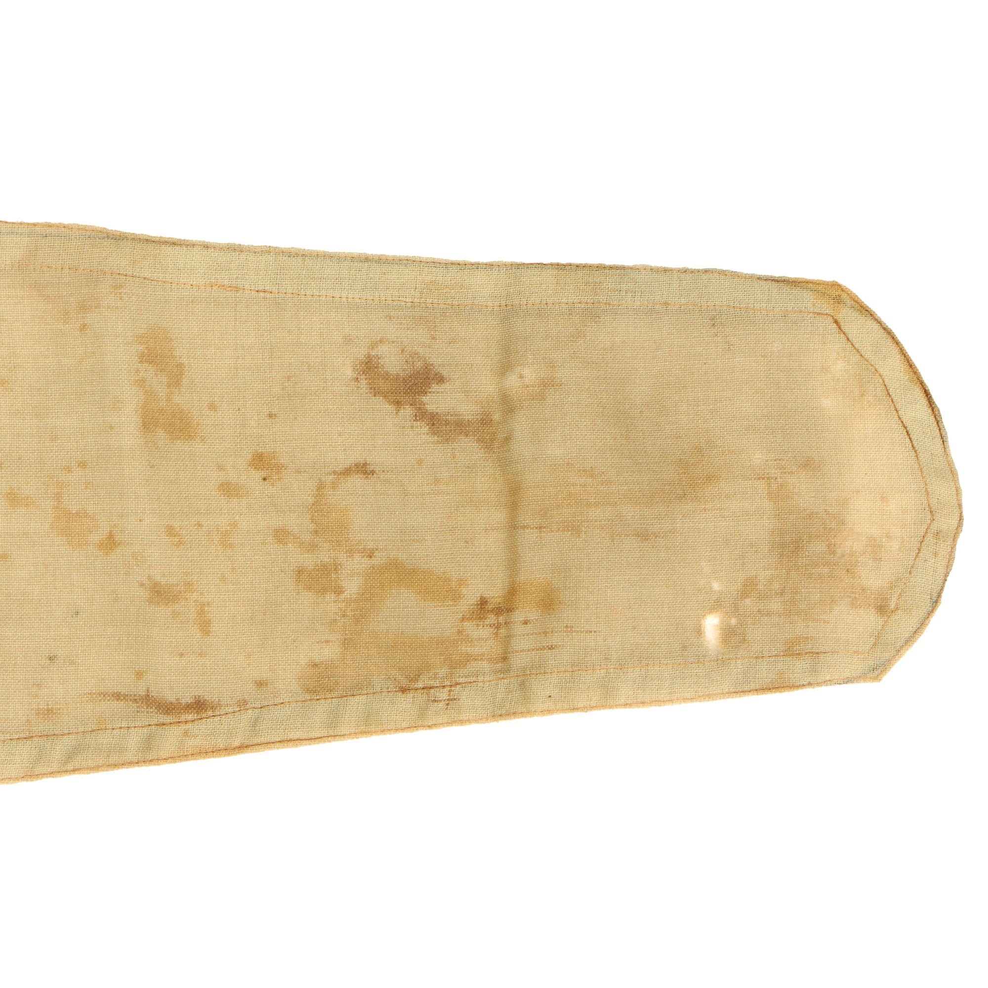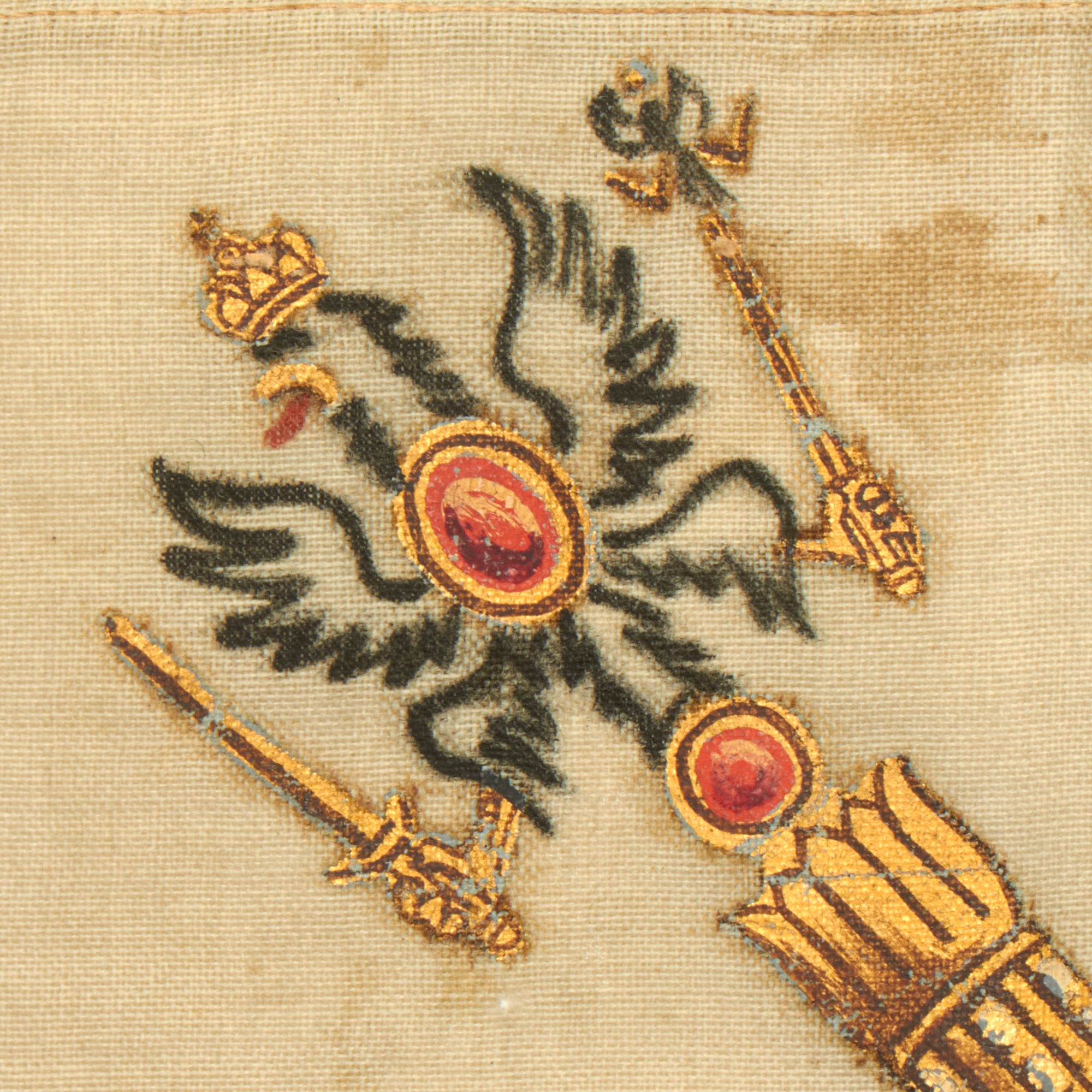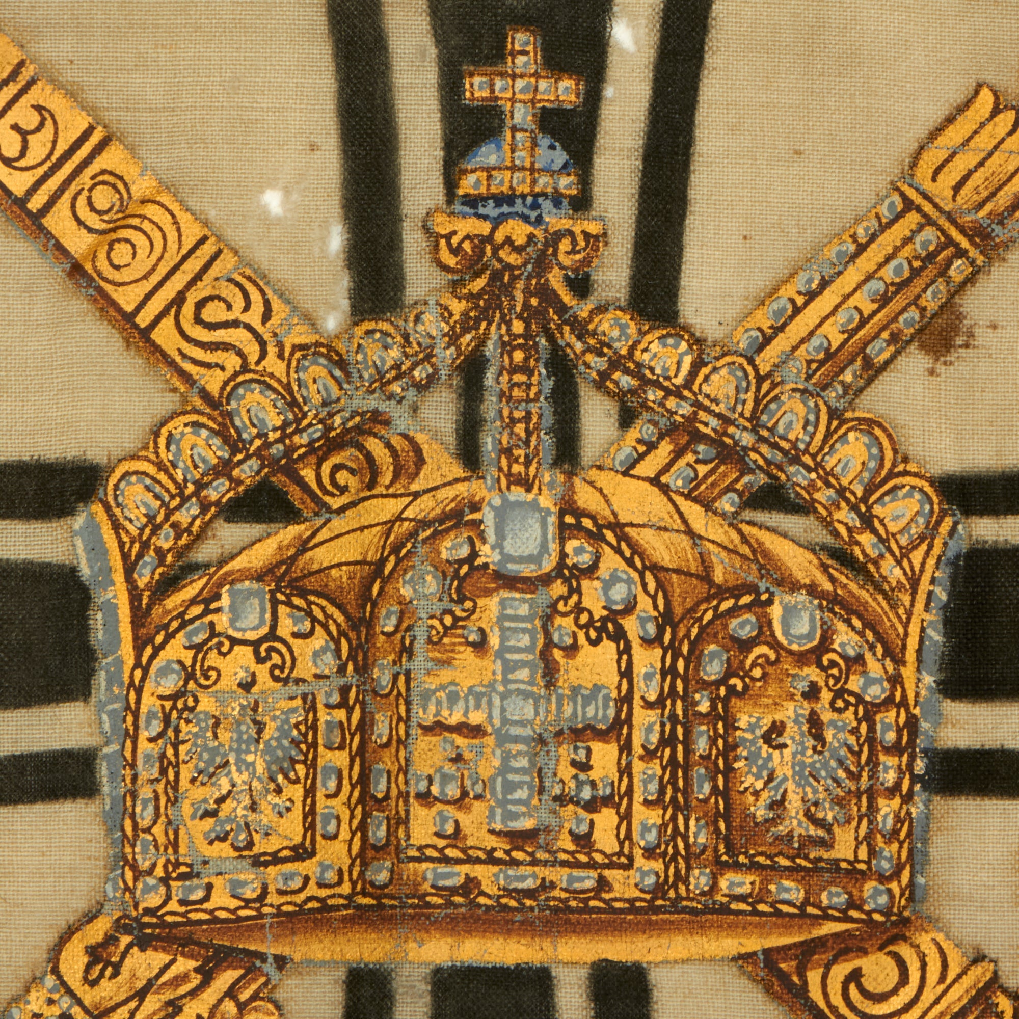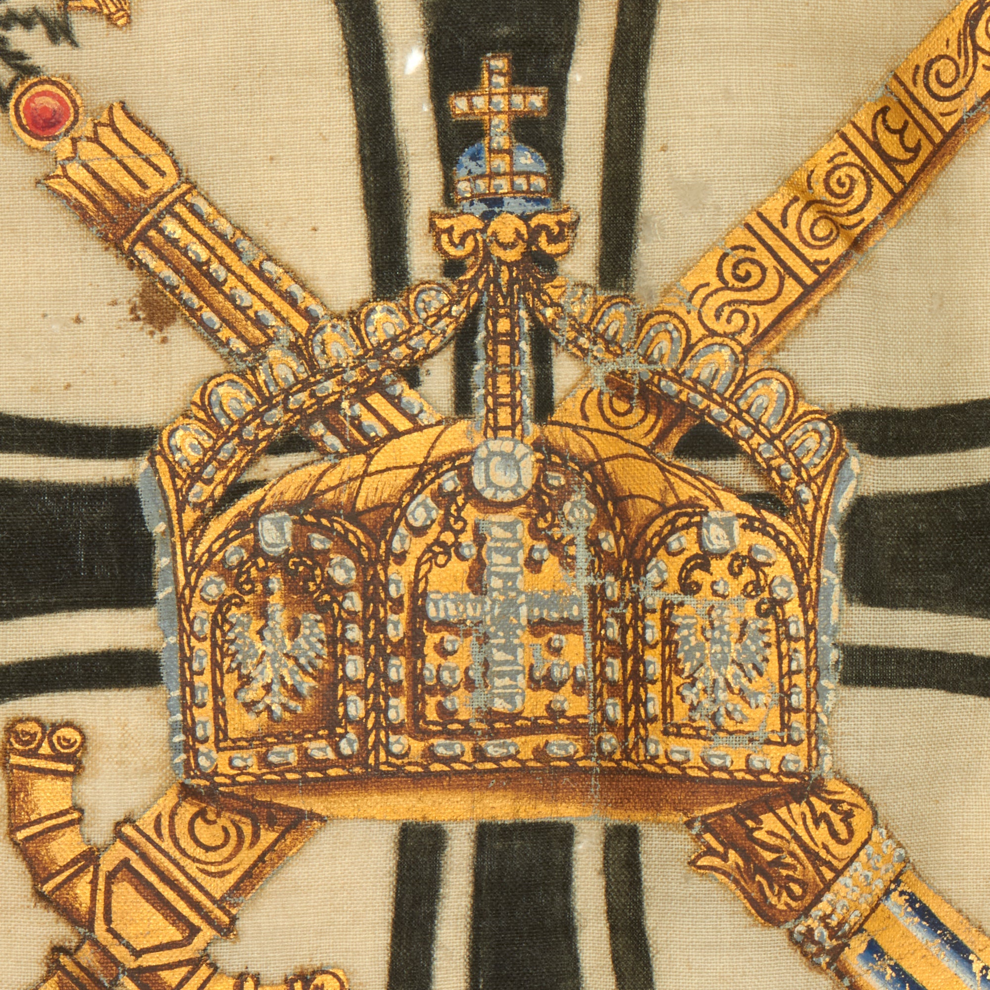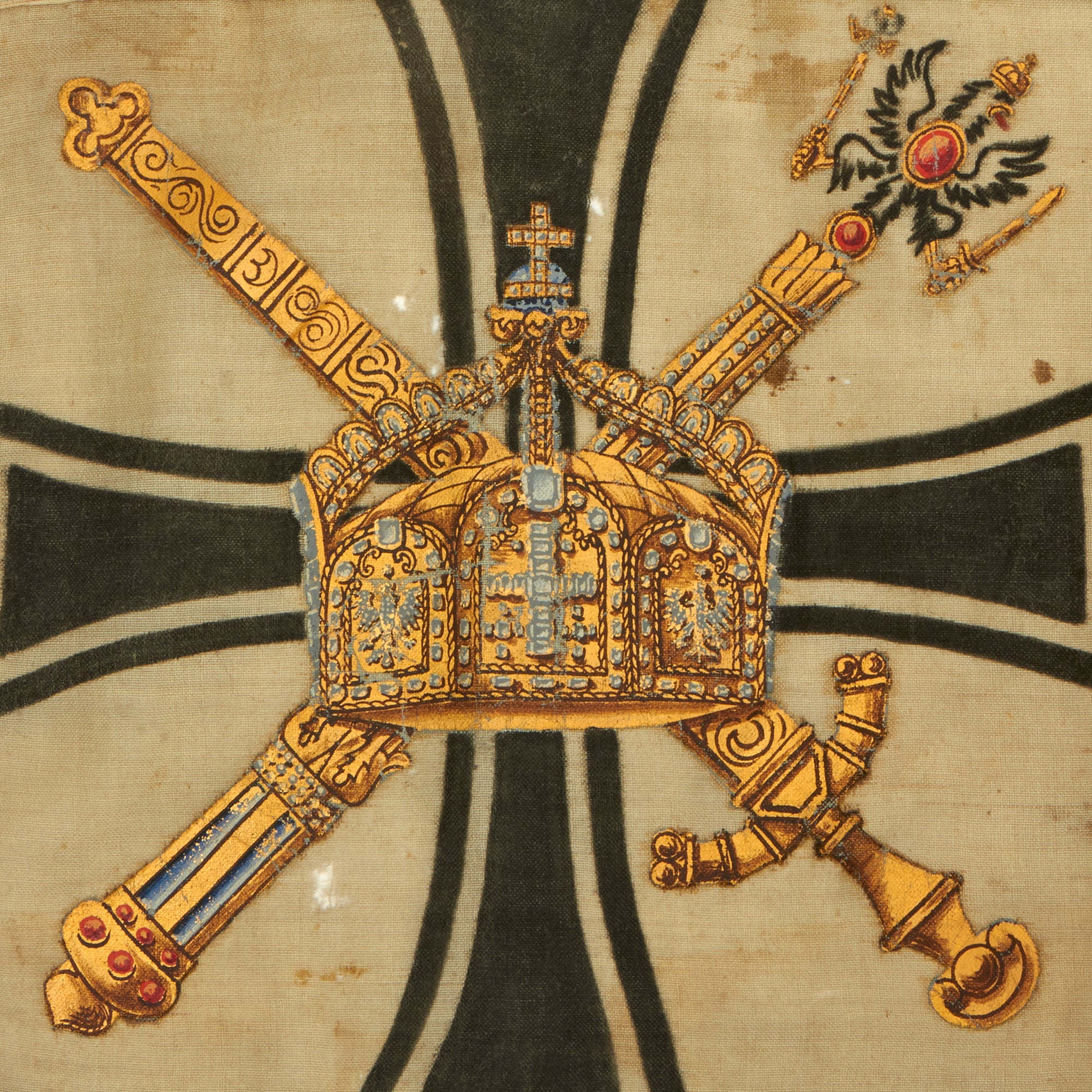 This is a white broad pennant, & hand-painted in the hoist is the Imperial crown on a scepter and sword on an Iron Cross on a white field. The crown, sword, & scepter are all heavily detailed, the crown encrusted with jewels & the scepter topped with the Imperial German Eagle himself holding a sword & scepter. This is painted on both sides of the pennant. On the header, Breit Wpl. Boot is stamped, meaning Broad Pennant, Boat. There is a possible size marking on the back, 1 followed by two letters that we can’t discern.