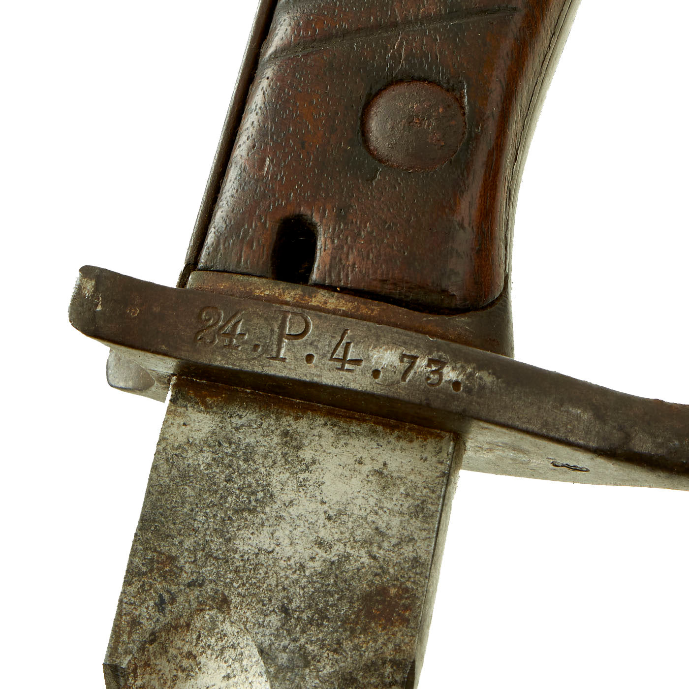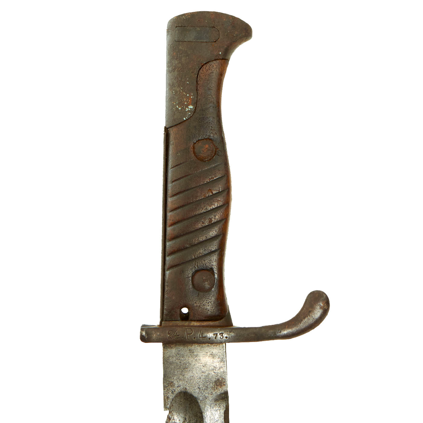 The crossguard has been marked with a unit marking, 24. P. 4. 73., which most likely this refers to the 24th Pioneer Battalion, 4th squadron, 73rd weapon. This is exactly the type of unit that would have been armed with these bayonets.