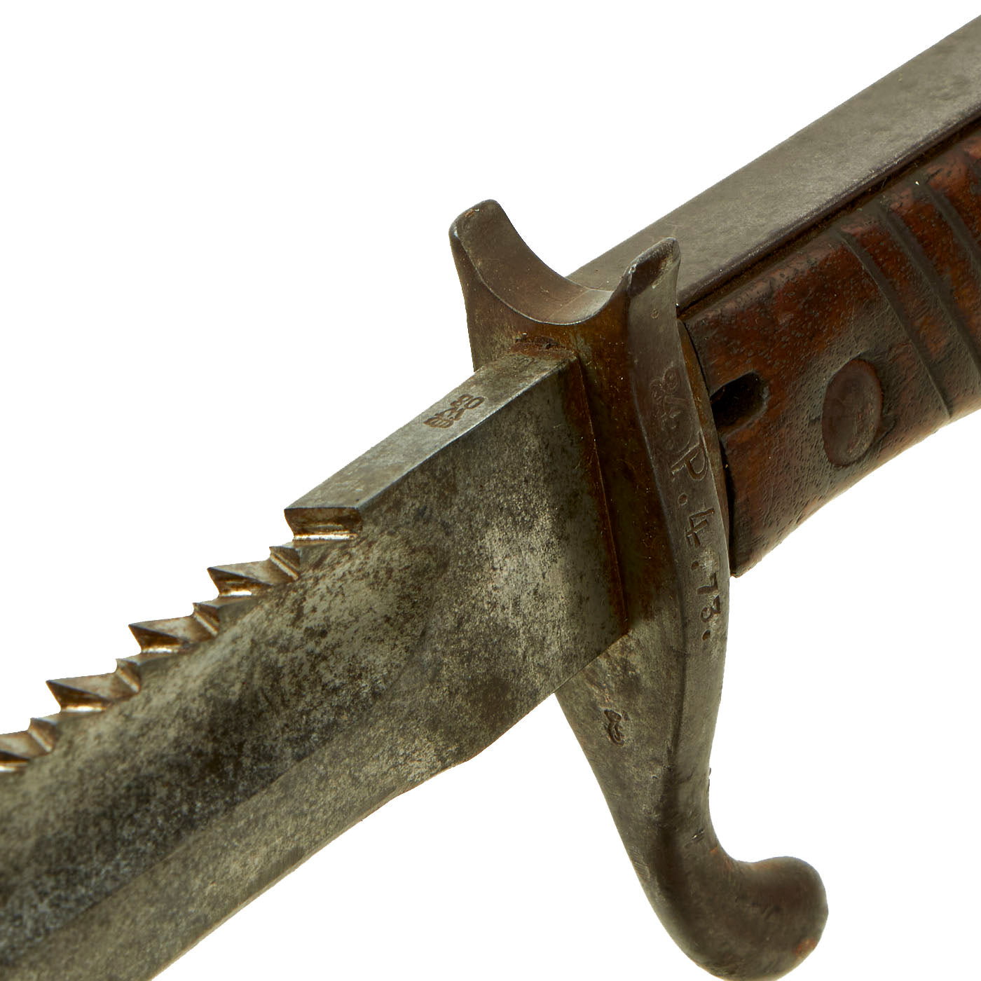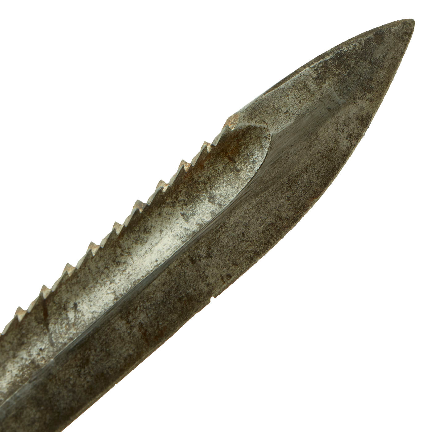 This example has a very desirable "sawback" blade, which was intended for use by pioneers to saw through brush and obstacles. Unfortunately a rumor got out that it was intended to inflict grievous harm on enemies, so a lot of the sawback bayonets had this feature removed, making them hard to find. This example has a blade in very good condition, with some staining and light peppering from age and use. It has definitely been sharpened several times and has seen real use in the field. The sawback is is still sharp, and does not look to have seen extensive use.