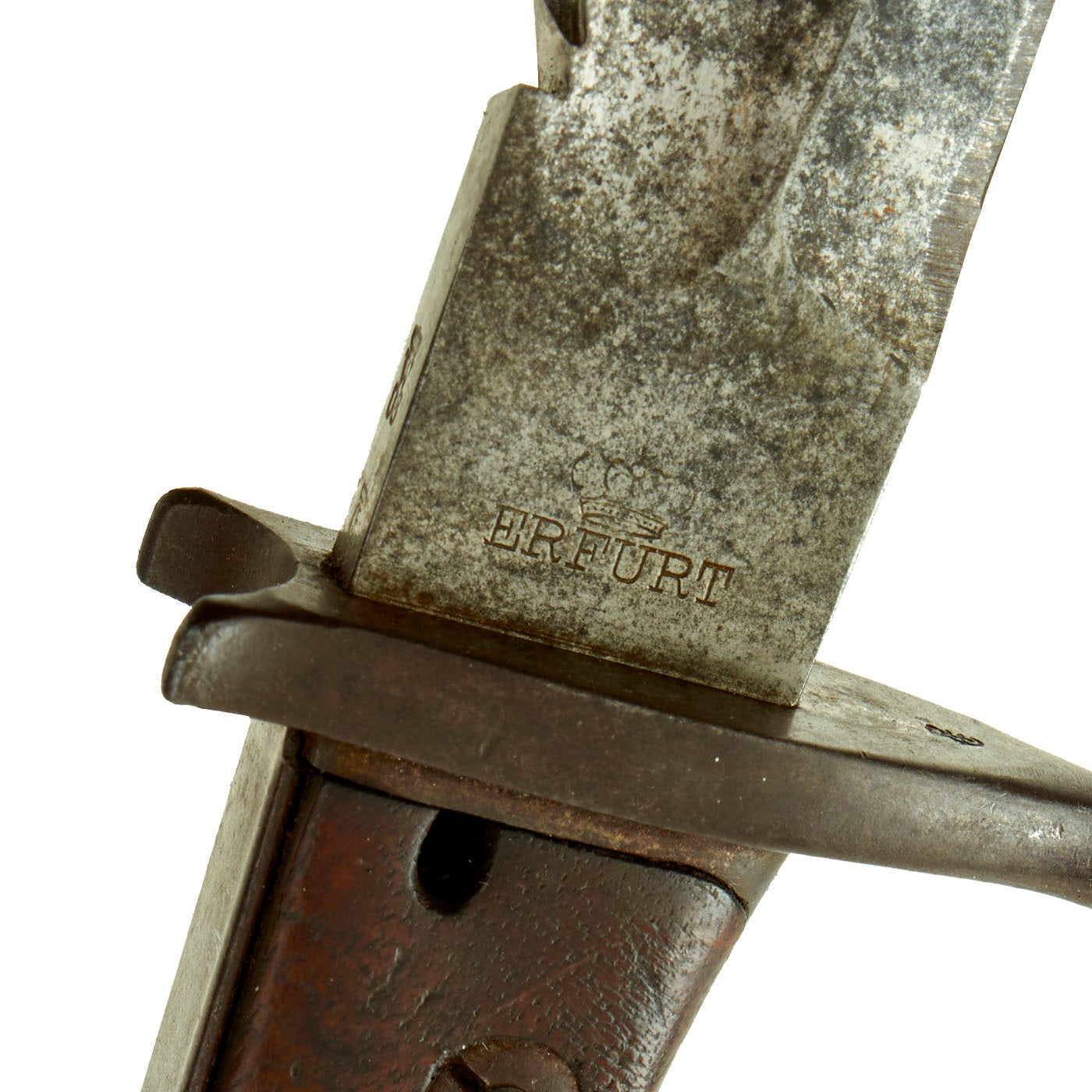The blade ricasso is maker marked Crown / ERFURT, indicating manufacture at the Royal Erfurt Arsenal, located in Thuringia. The spine is proof marked Crown / W directly in front of the cross guard, for Kaiser Wilhelm II, the German Emperor. Under this is 08, indicating production in 1908. This example has a very nice set of original grooved wood grips, which do show some wear and small chips. The hilt has a lovely overall oxidized patina, and the bayonet lock is fully functional.