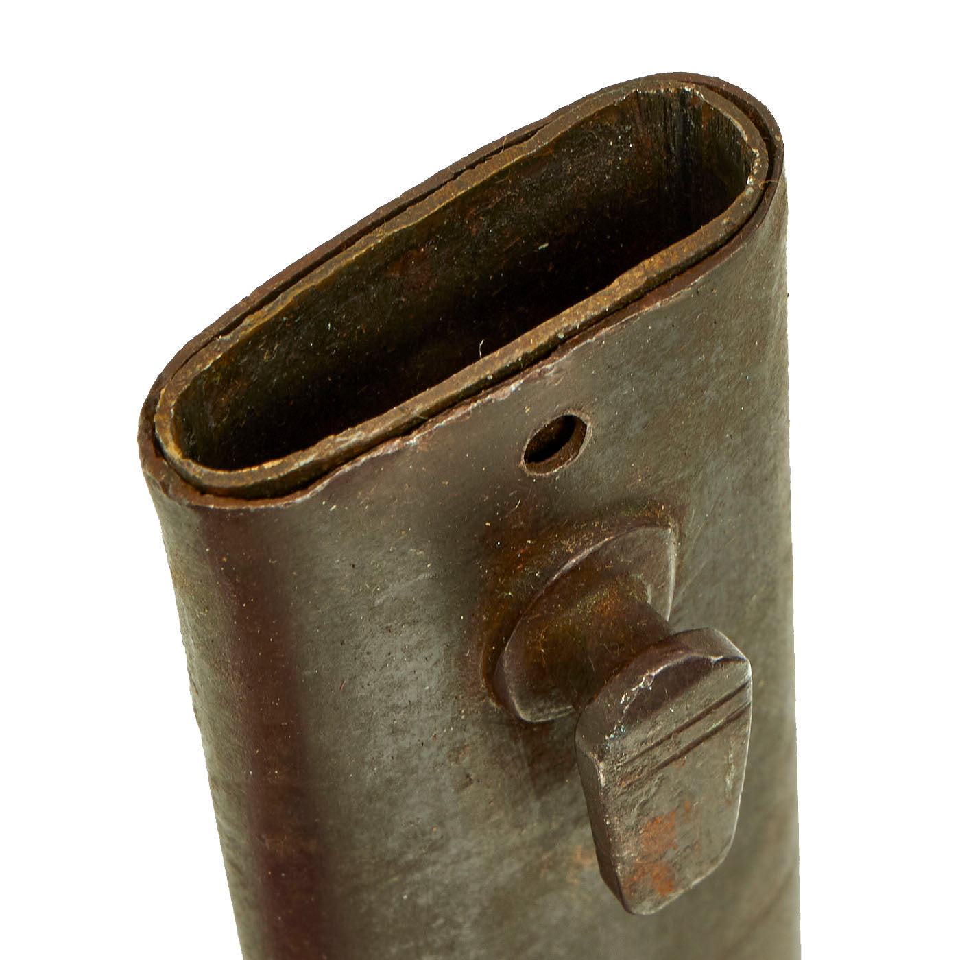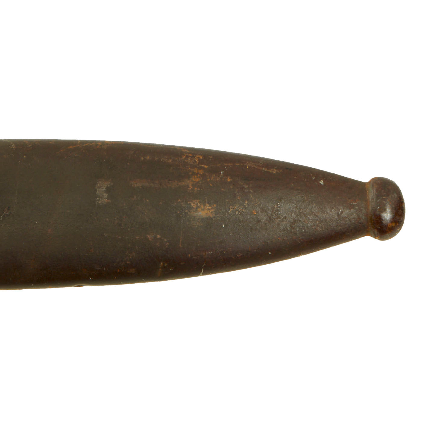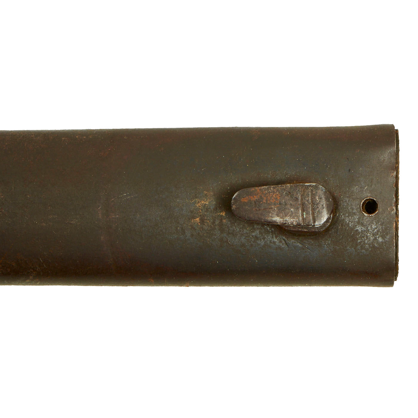 The included steel scabbard is in good condition, showing an overall oxidized patina, having faded from the original blued finish. It does not show any major oxidation or rust, and the frog button is still intact and unbent. The only issue of note is that the retaining screw for the throat is missing.