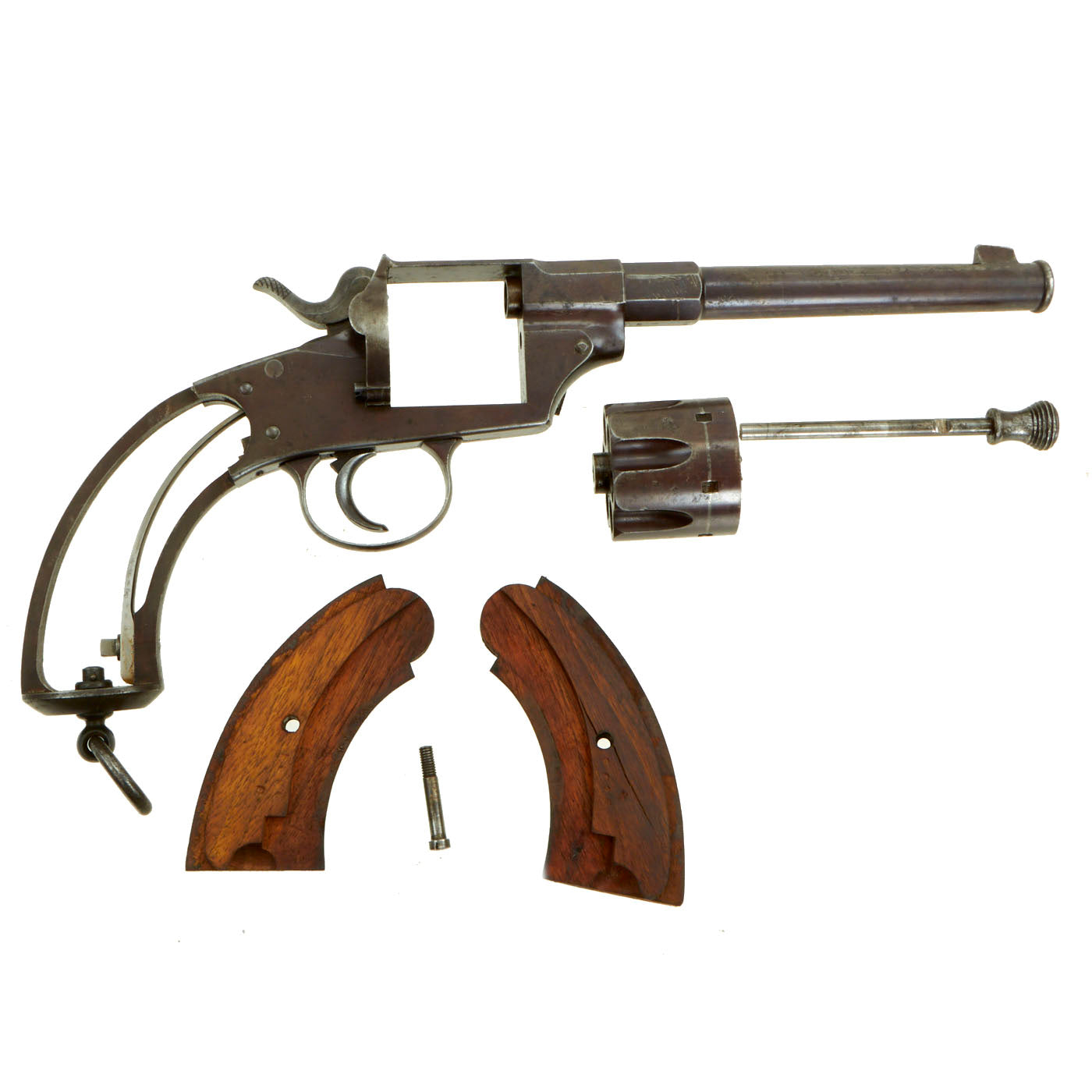 These revolvers were single action only and were fitted with a robust safety lever on the left hand side of the frame, which functions differently depending on hammer position. If the hammer is in the fire position, the safety locks the hammer completely. If in the half-cock position, it locks the hammer there, facilitating reloading of the revolver or removal of the cylinder. They also have a very robust ring on the bottom of the grip, for securing the revolver to the uniform.