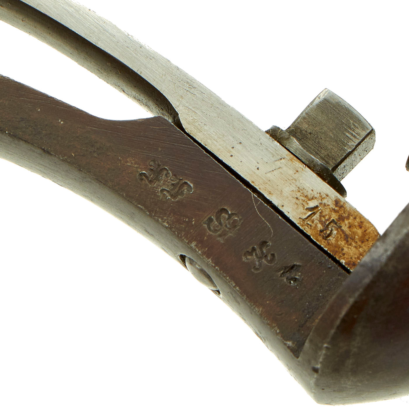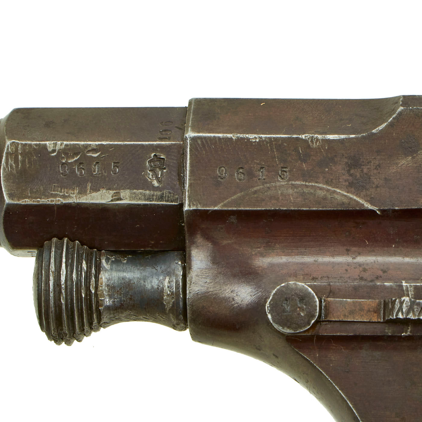 The revolver bears serial number 9615 on the barrel, frame, and on the underside of both grip scales, with shortened number 15 on many of the smaller parts. The cylinder is not matching, marked with serial 6264 on the rear, and the cylinder arbor pin is also a replacement, marked 8212. We would surmise that the revolver had the cylinder and arbor pin removed for some reason, and then lost. Parts on hand were then used. Perhaps the maker marking was also removed at this time. There are various proof marks on most parts, was was standard for German issued weapons.
