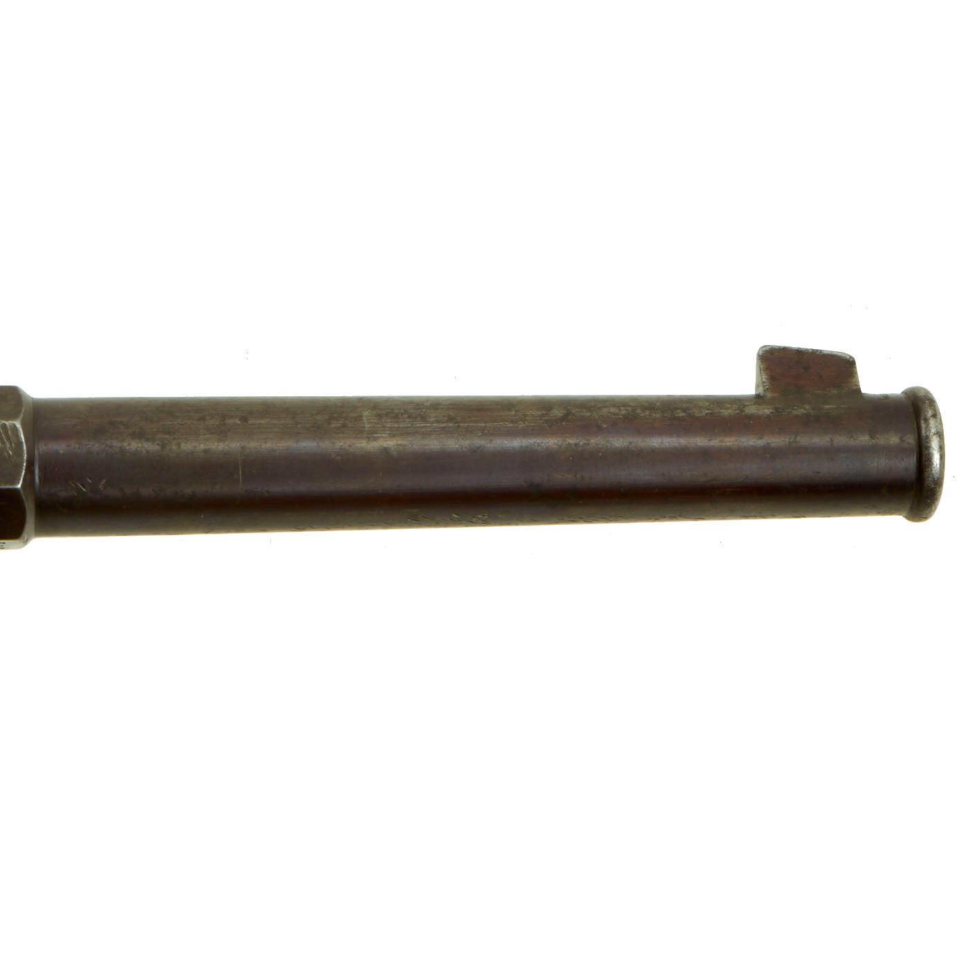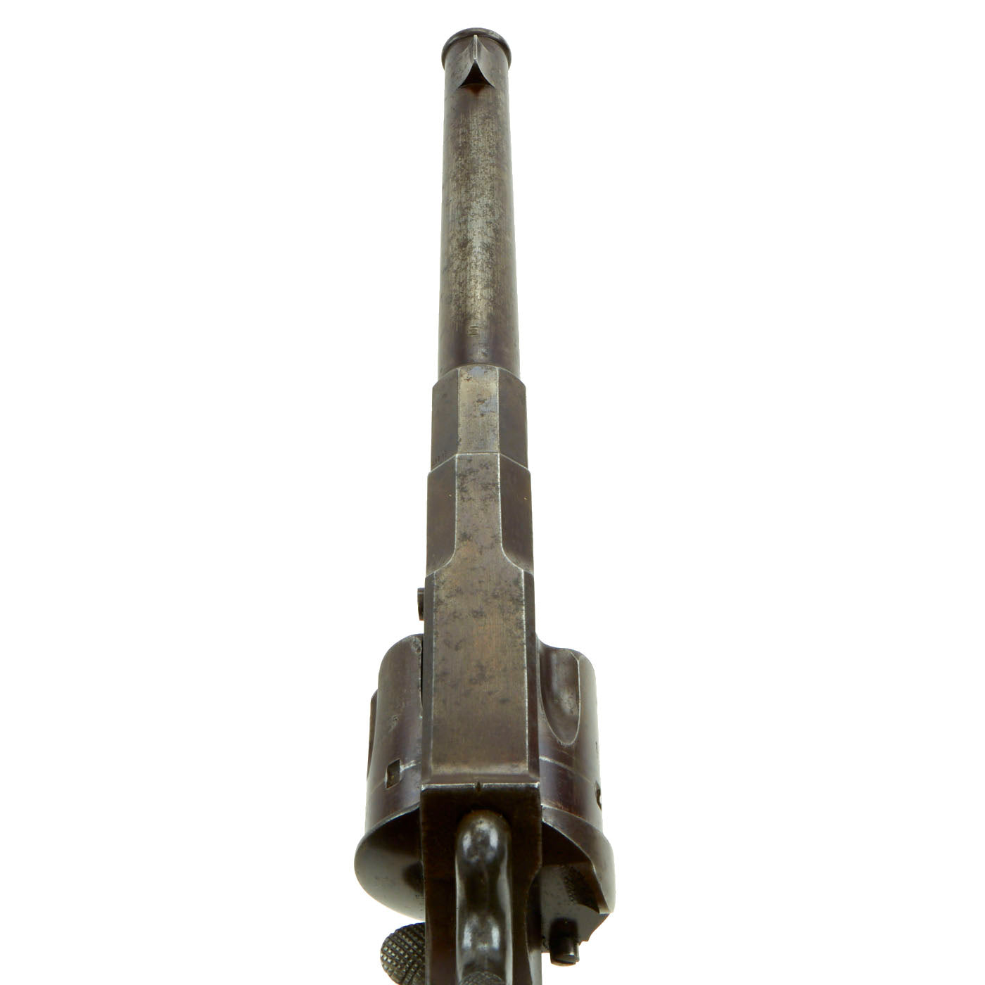 The grips are in very good condition, and the metalwork has a lovely plum patina, showing some light denting and wear on the exterior. The bore shows clear lands and grooves, with a partly bright finish. There is some fouling and possibly grease and dirt in the grooves. The loading gate is intact and fully functional. The revolver cycles correctly, and we did not notice any timing or indexing issues.