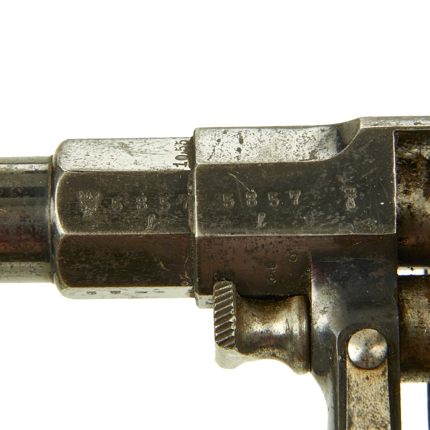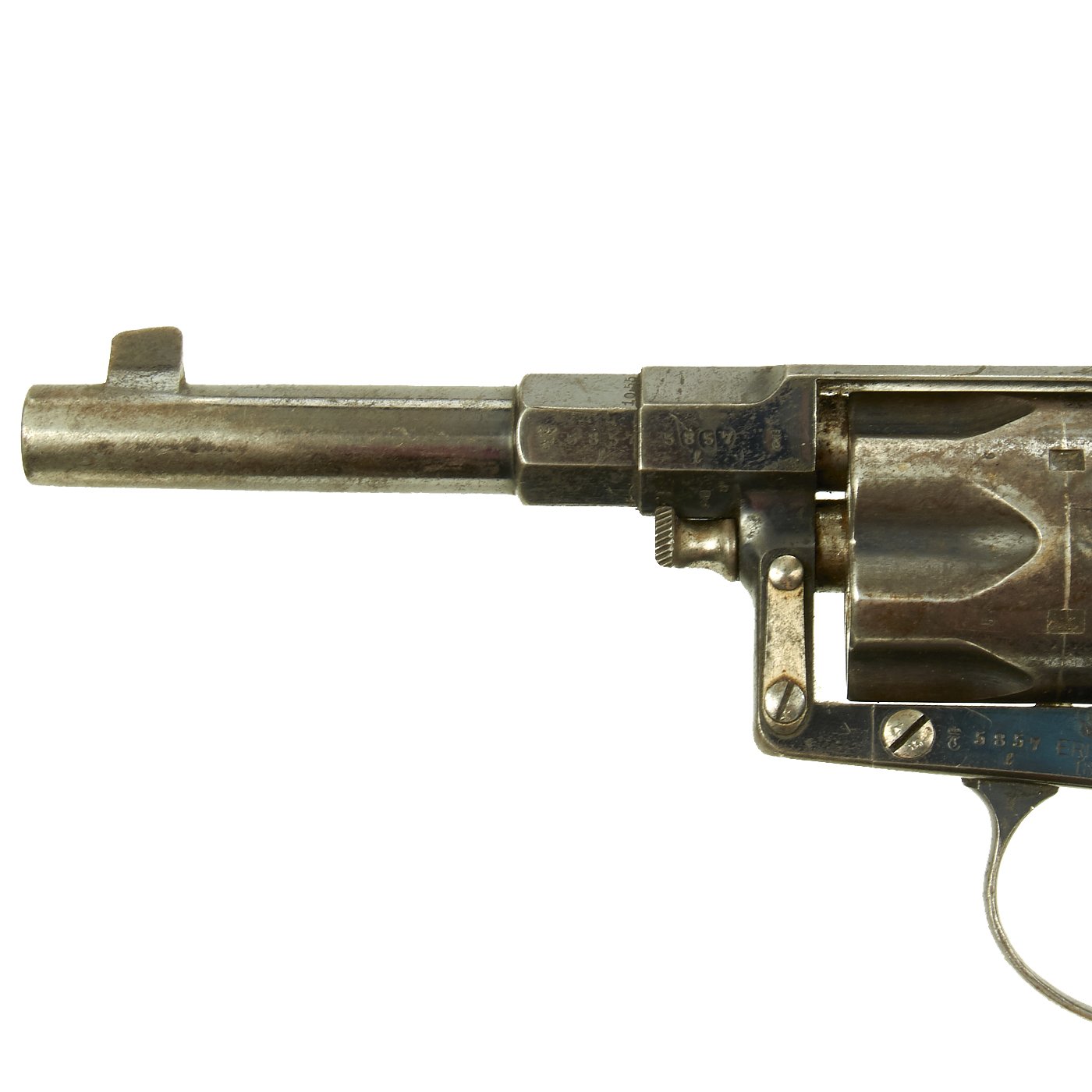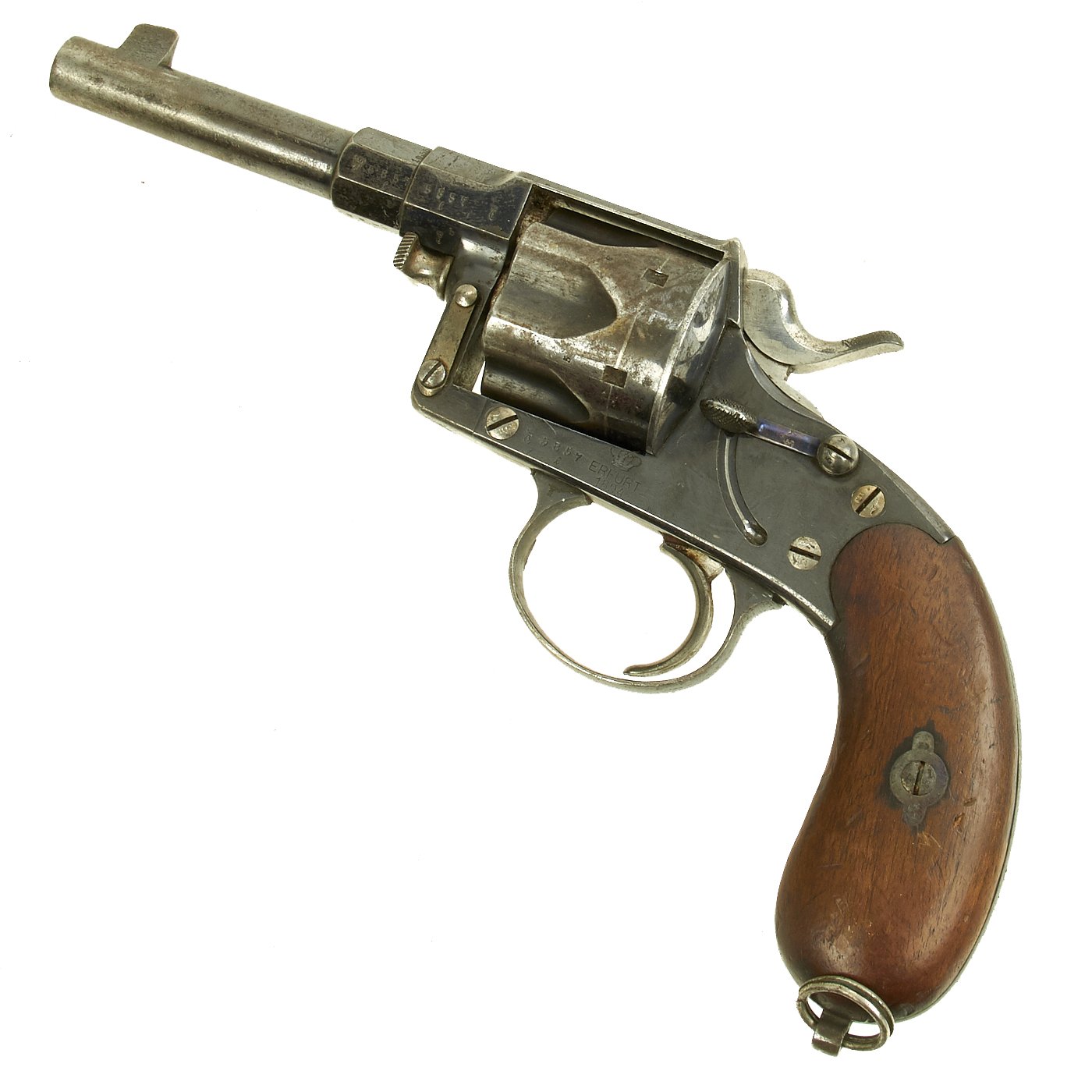 There were made by various different makers, and this example is marked CROWN / ERFURT / 1894, indicating manufacture at the Imperial Arsenel in Erfurt Germany in 1894. Our Revolver also bears all matching serial number 5857 / l, even on the inside of the grip scales (857) and the small screws (57). There are various proof marks on the different parts of the gun. The pommel plate is is marked with the Crown / FW proof on the butt, for German Emperor Wilhelm II, I, who used the F.W. monogram, just as his grandfather Wilhelm I had.