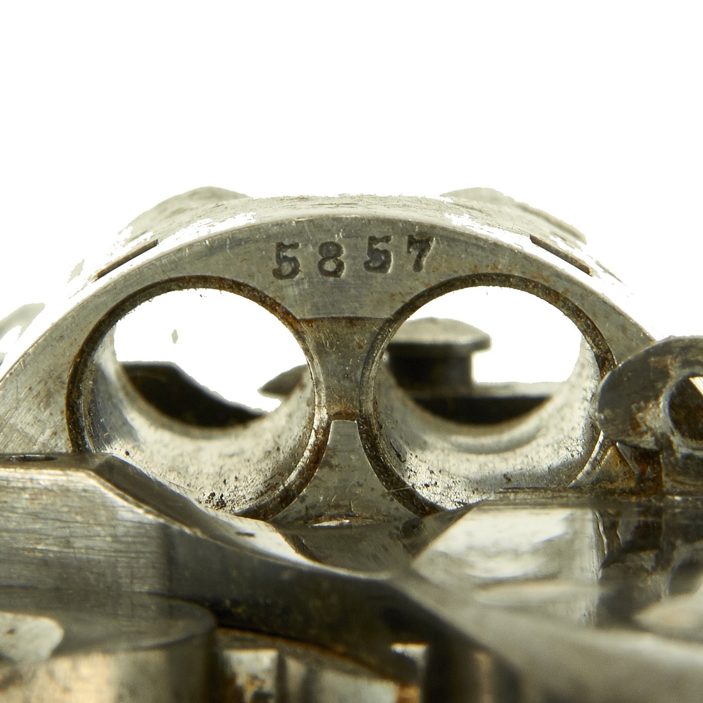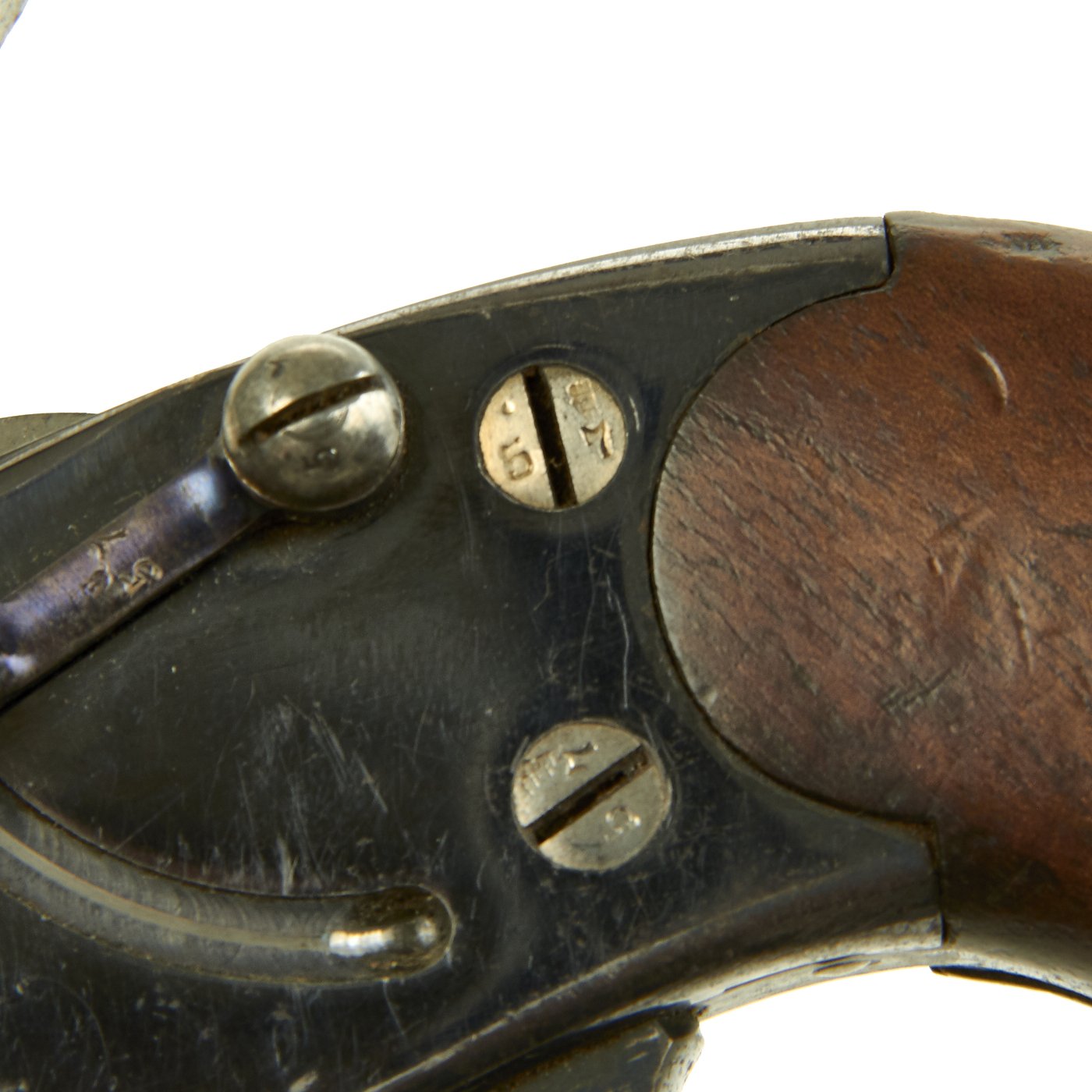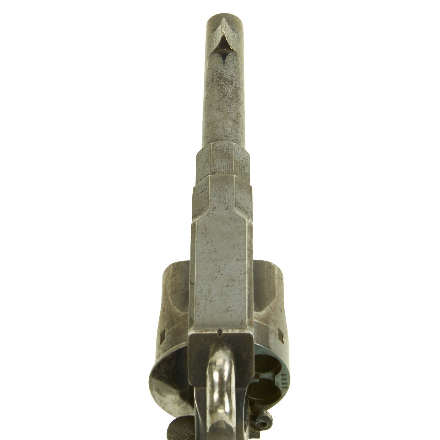 There were made by various different makers, and this example is marked CROWN / ERFURT / 1894, indicating manufacture at the Imperial Arsenel in Erfurt Germany in 1894. Our Revolver also bears all matching serial number 5857 / l, even on the inside of the grip scales (857) and the small screws (57). There are various proof marks on the different parts of the gun. The pommel plate is is marked with the Crown / FW proof on the butt, for German Emperor Wilhelm II, I, who used the F.W. monogram, just as his grandfather Wilhelm I had.