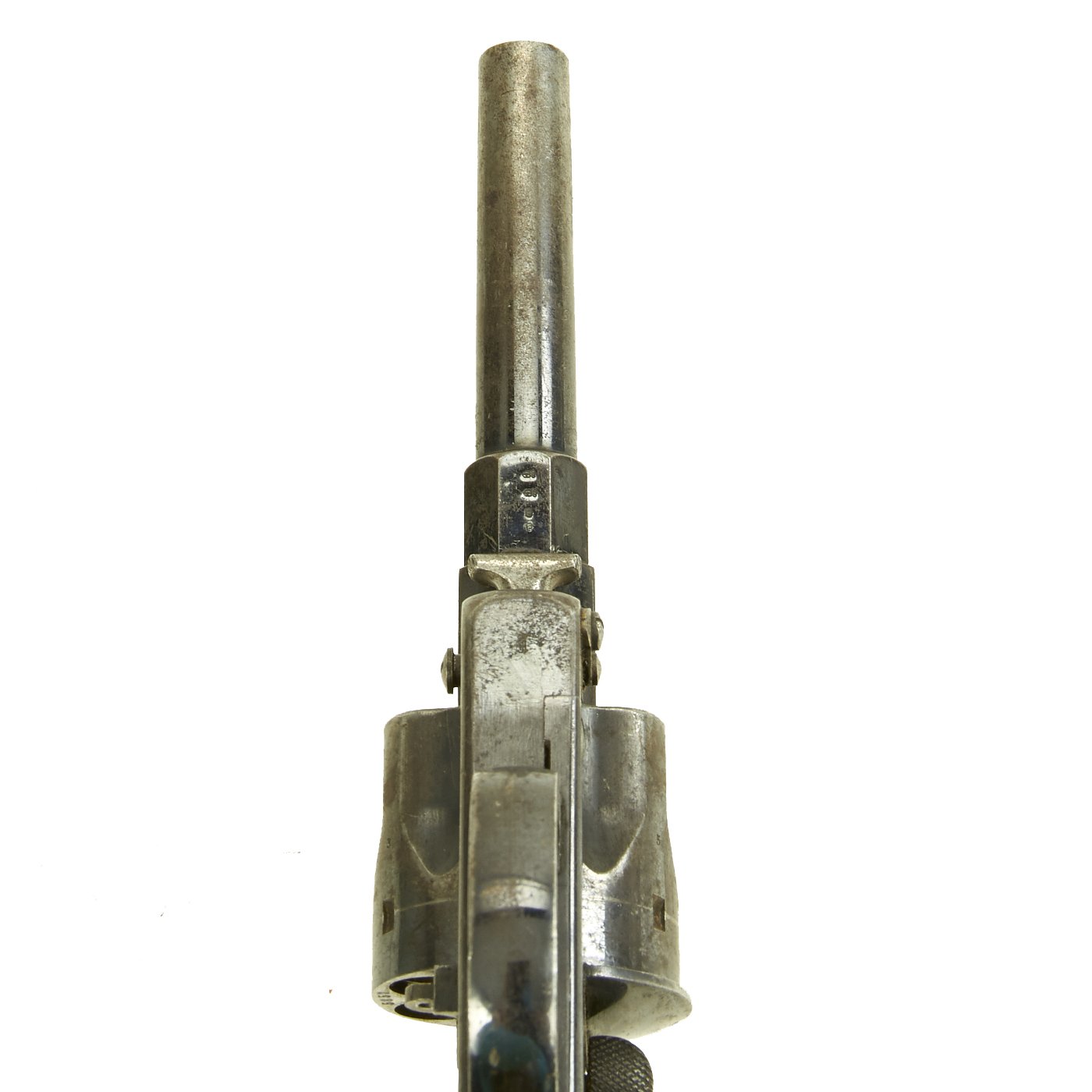 The revolver is in very good condition, and still has a lot of the original polished blue finish, with other components being bright steel. Bore is bright with clear lands and grooves, with very little sign of wear. The action is tight and works well, though unfortunately the loading gate on this revolver is missing. Also it looks as though the lanyard ring is a "split ring" style like on a keychain, so it is most likely a replacement.