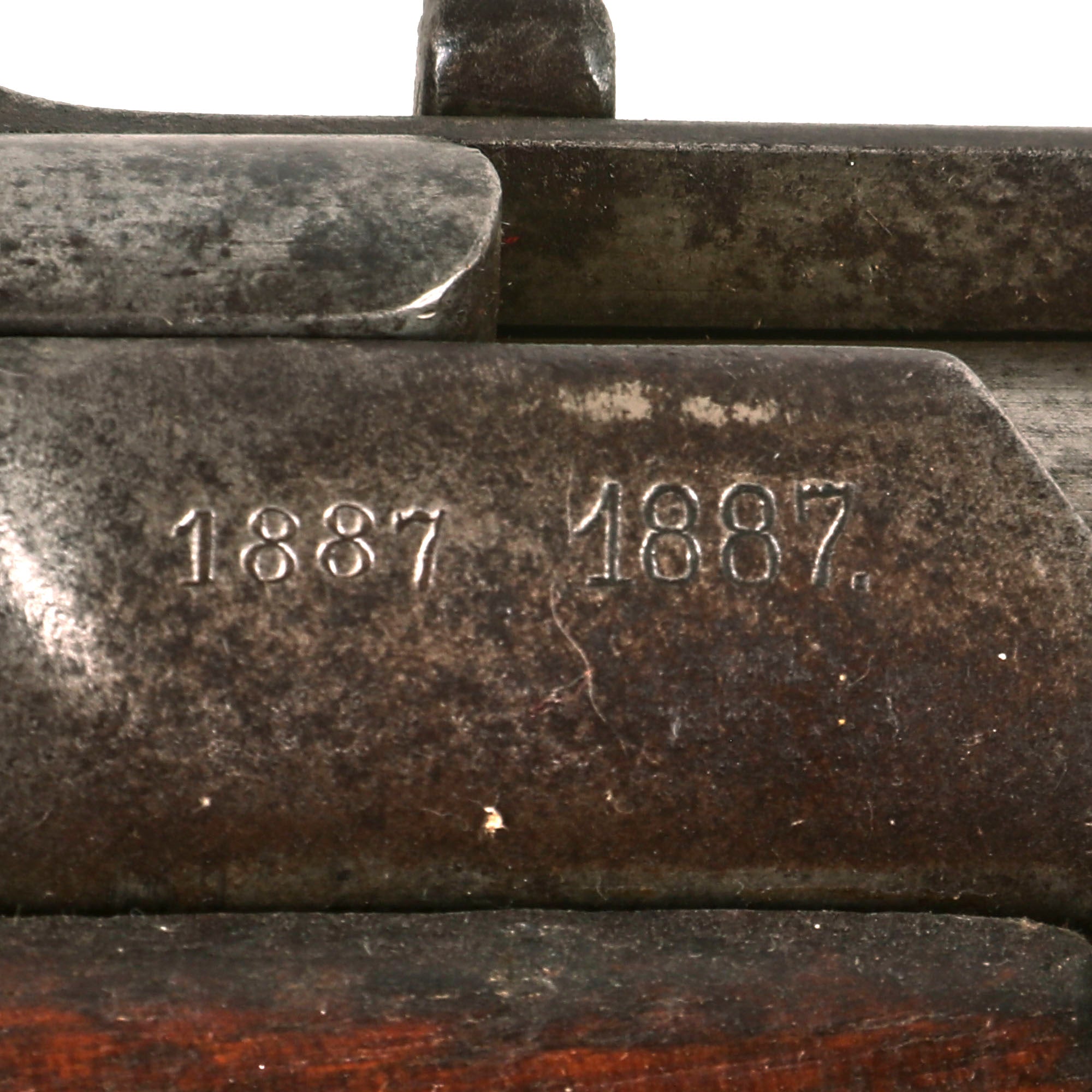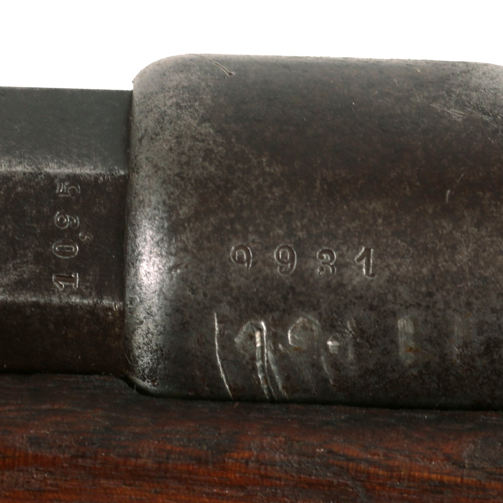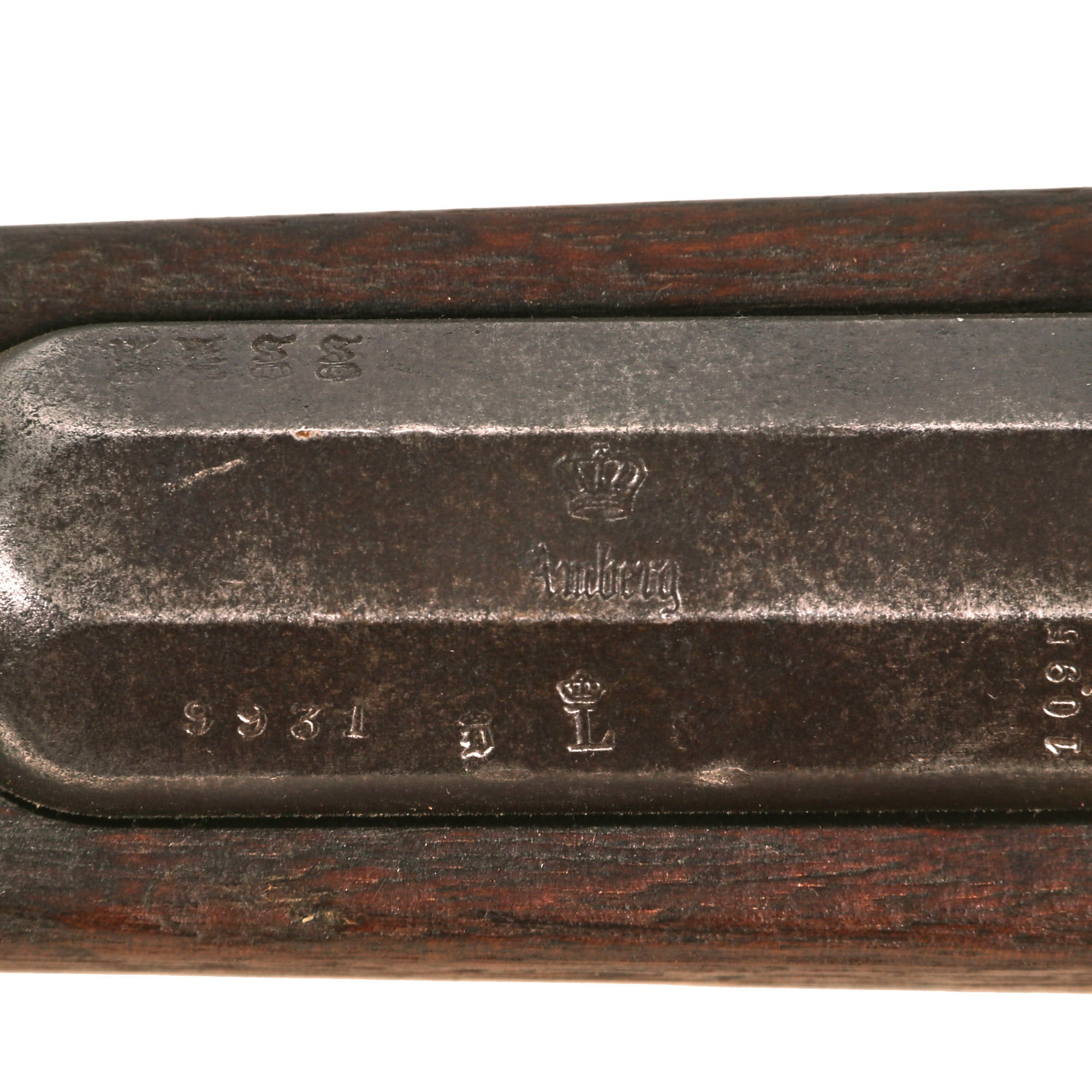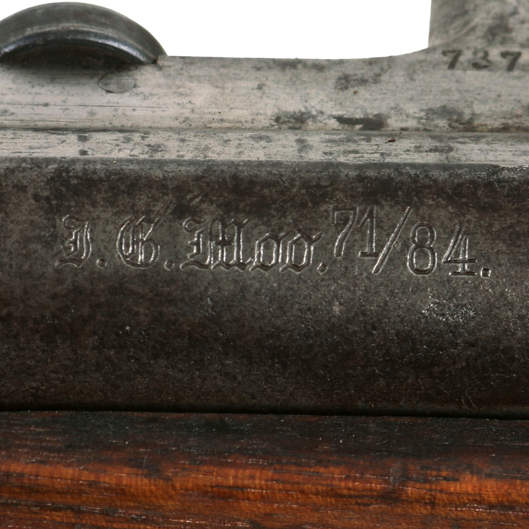 The rifle is covered with Imperial German and Bavarian inspection and acceptance markings, which are sill mostly visible. The serial number 9931 is marked on the barrel and receiver, while all of the other components are non-matching, typical for an arsenal reconditioned rifle. The receiver is dated 1887. on the right side twice, and marked I. G. Mod. 71/84. on the opposite side in "Black Letter" typeface. The rifle is complete with all major parts intact and functional, with a worn finish on the metalwork, showing long service and cleaning.