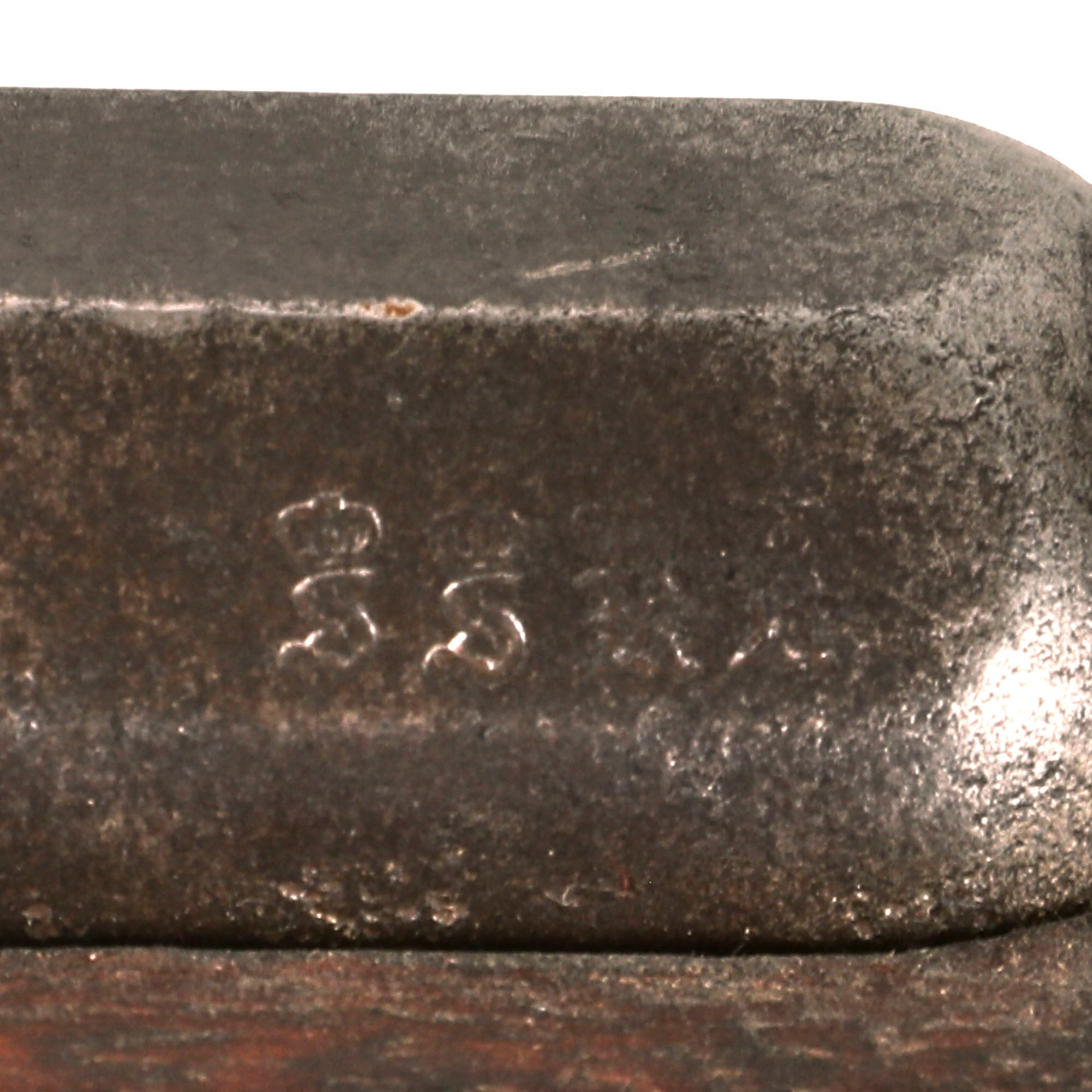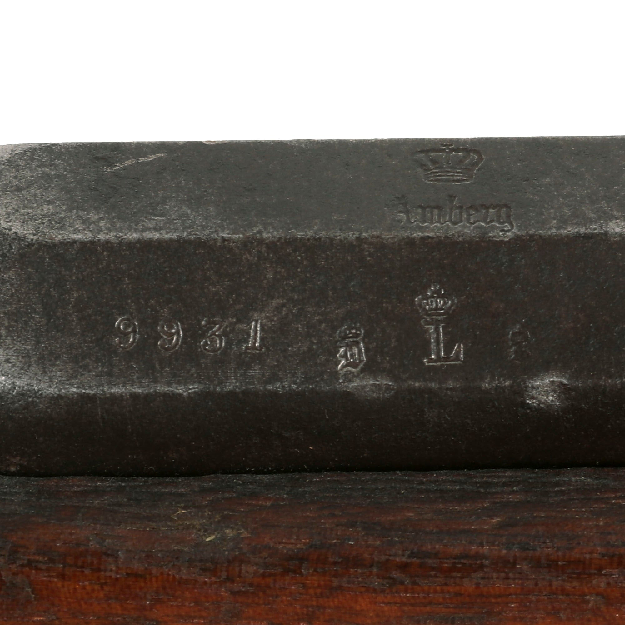 The top of the chamber is marked (Crown) over Amberg, for the Bavarian (and later Imperial) arsenal in Amberg, in the Kingdom of Bavaria. Below this is the Crown over L proof for Luitpold, Prince Regent of Bavaria, who reigned from 1886–1912. His nephew Otto was technically the King, however he was deemed unfit for rule, so his uncle and later cousin ruled in his stead. Next to this is a 10,95 designation, giving the bore diameter in millimeters.