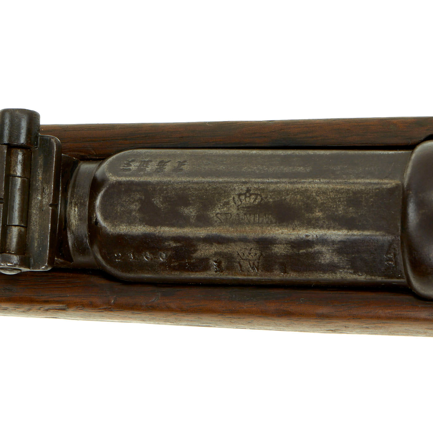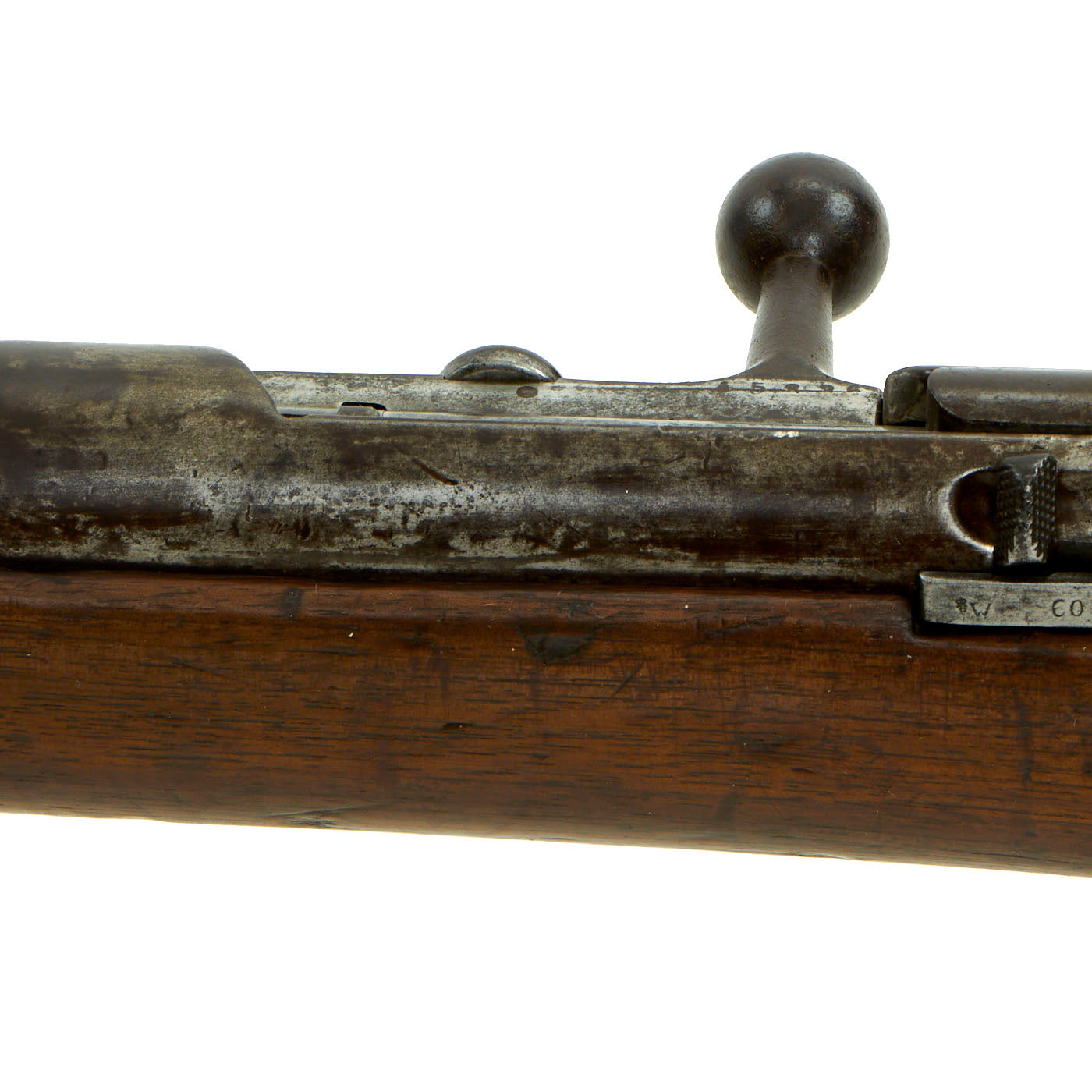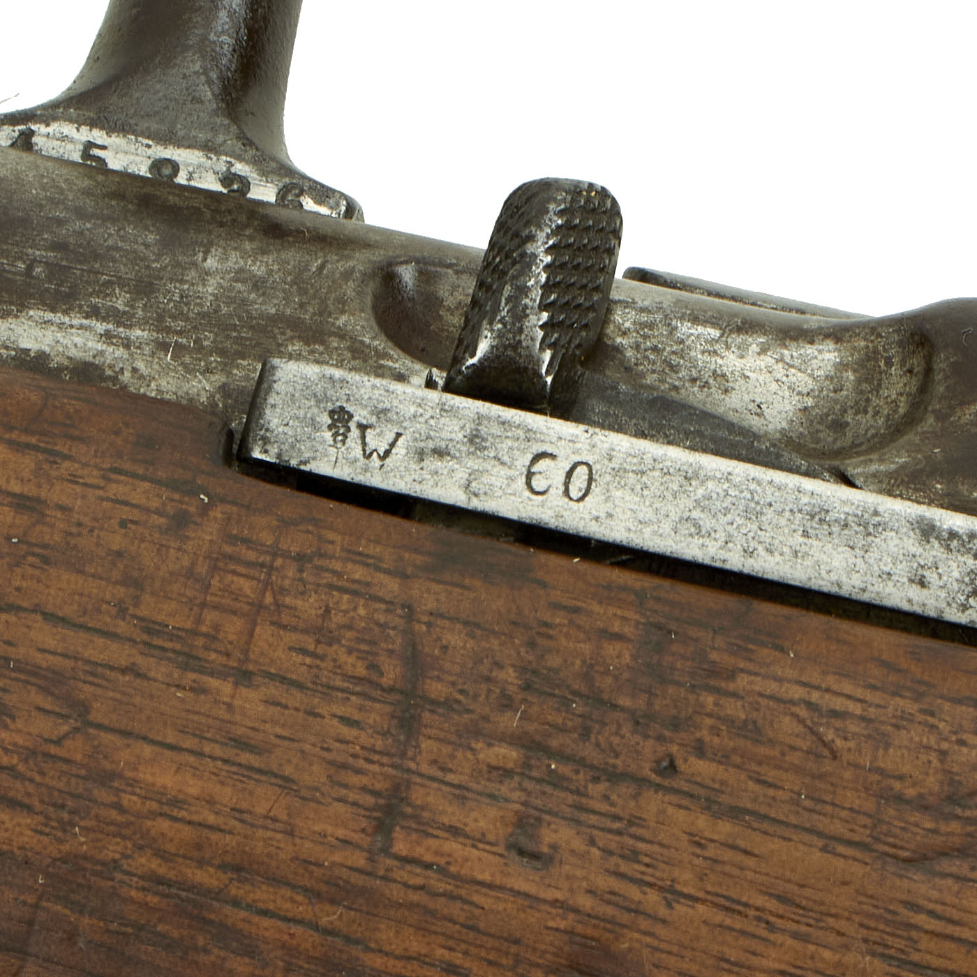 The serial number 2160 is present on the barrel and receiver, while the other components are all non-matching, or no longer bear any markings. We can no longer see a clear date on the receiver, however these were all made 1888, and we think we can see a faint "85" where the date would be. The "I. G. Mod. 71/84." is completely worn off the receiver, and overall the rifle shows wear on all surfaces.