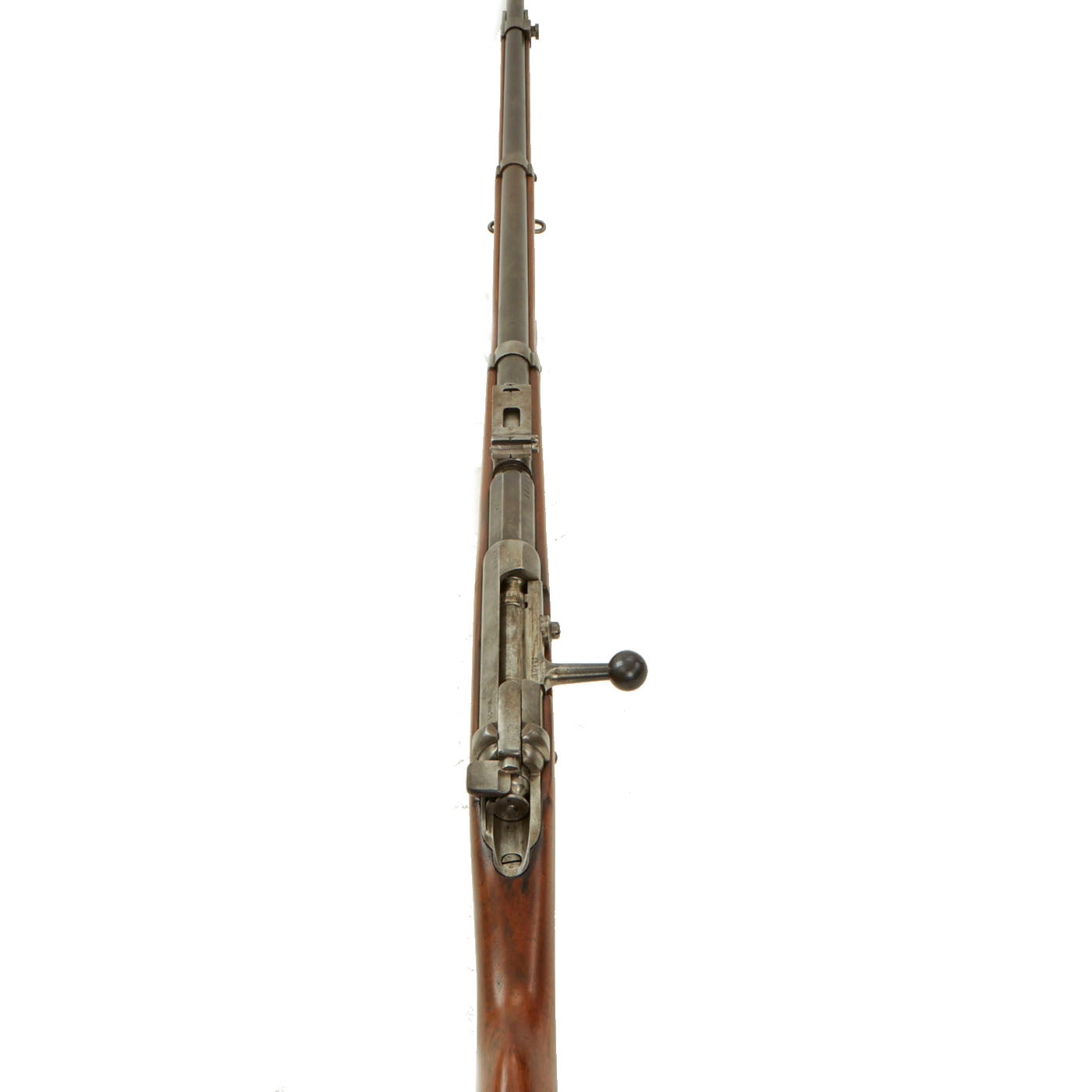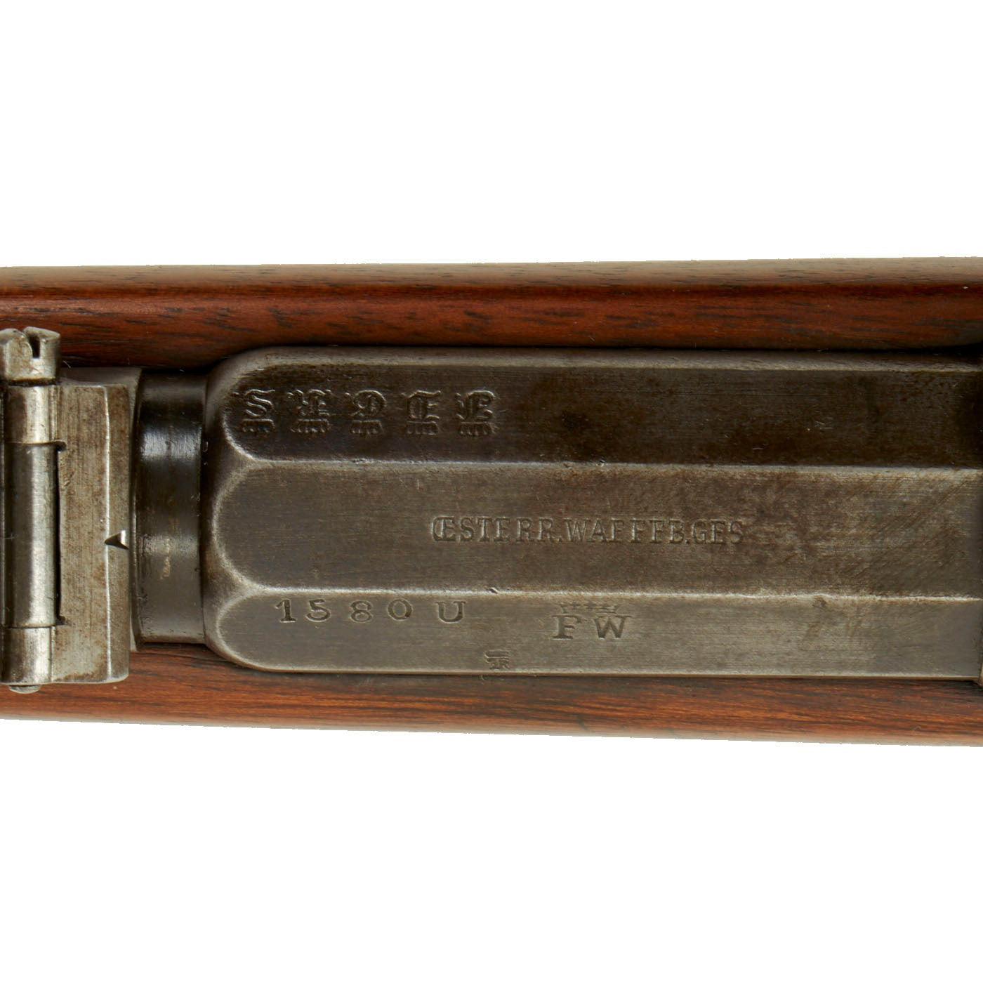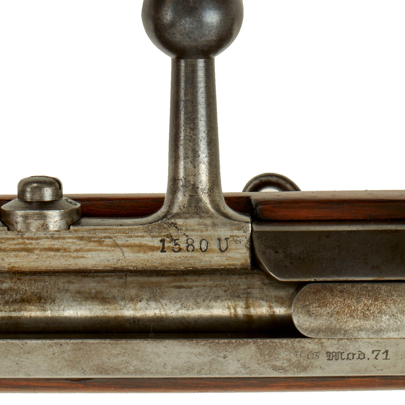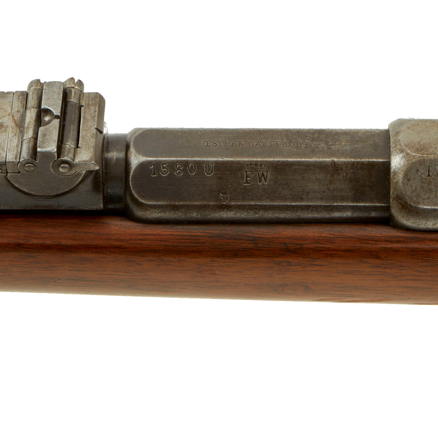 Original Item: Only One Available. This is a very nice example of the Mauser Model 1871 Infantry Rifle, manufactured by the famous ŒWG Steyr in Austria. It is covered with Imperial German inspection and acceptance markings on the metalwork. It bears serial number 1580U on the barrel, receiver, bolt, and just about every other part that would have a serial number except for for a few screws, most likely replaced at arsenal.
