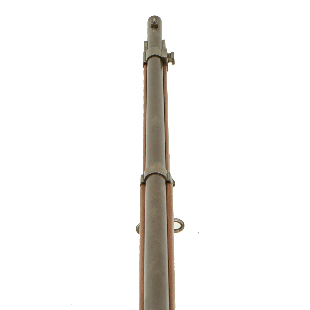 The Rifle comes complete with cleaning rod and is in good condition overall. Interestingly, it has a brass trigger guard installed. The rifle still has both sling swivels intact. The exterior metal finish shows years of cleaning, and now has a lovely gray patina on the barrel. The bore is in very good condition, with strong lands and grooves, and a bright finish. There is some light wear, so it did see some level of service. The stock looks very nice, and has been cleaned and waxed to a lovely glow. It does look to have been arsenal refurbished, so that markings are now very faint.