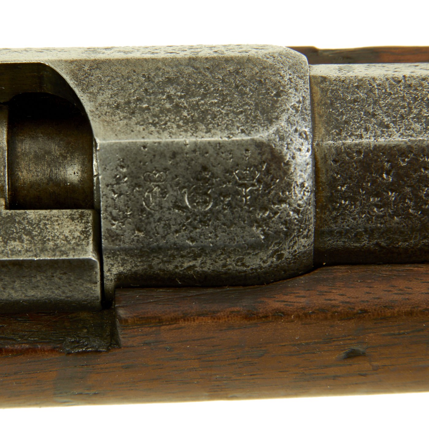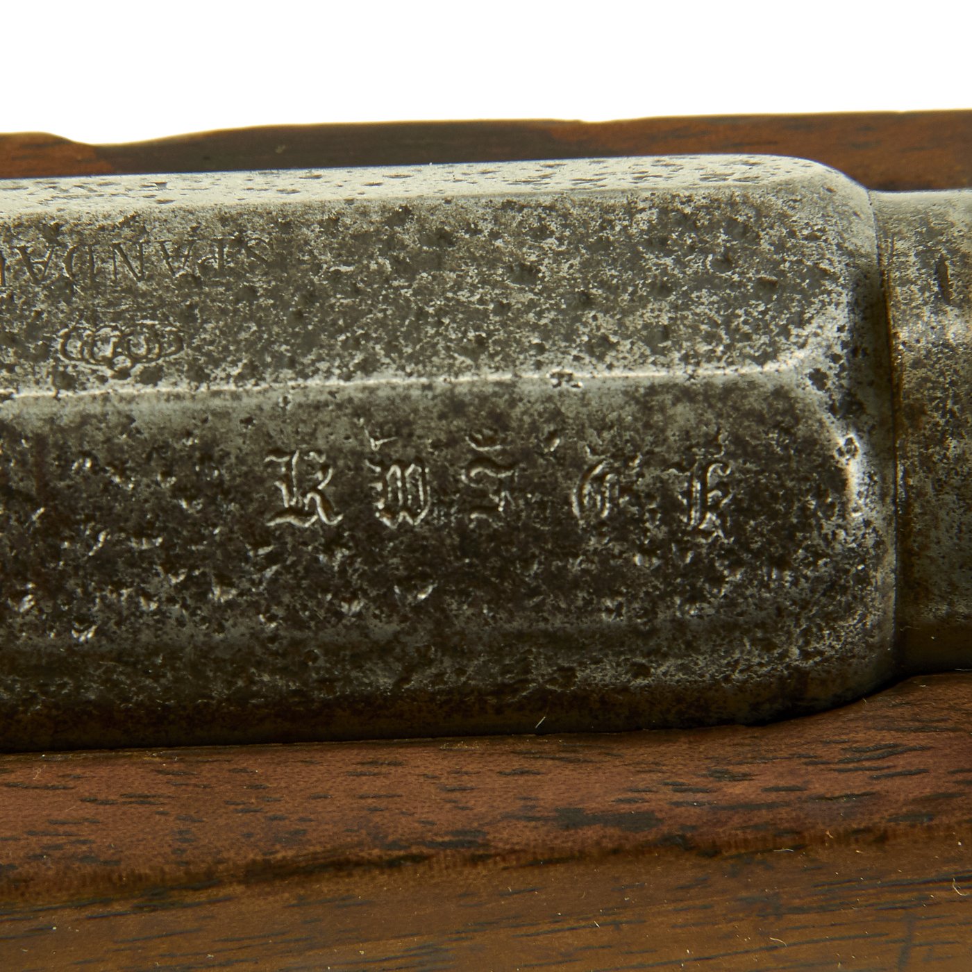 The receiver is dated with 1875 and faintly marked I. G. Mod. 71 on the opposite side in German "Black Letter" type. This stands for Infanterie Gewehr (Infantry Rifle) Model 71. The top of the chamber is marked Crown over SPANDAU, for the Prussian (and later Imperial) Spandau arsenal in Berlin, a storied production plant that would produce weapons up until 1919, including the famous MG08 Maxim. Below this is the Crown over FW proof for Kaiser Wilhelm I, who used the F.W. monogram.
