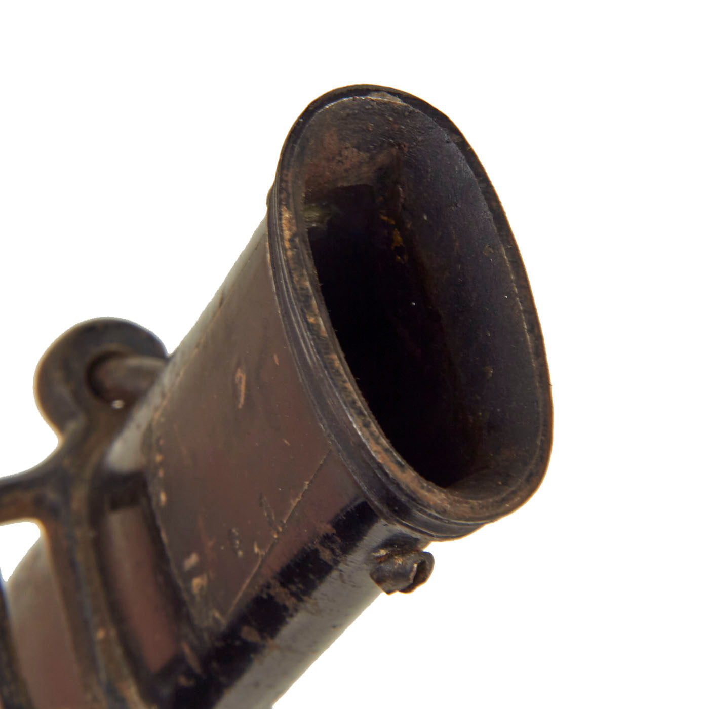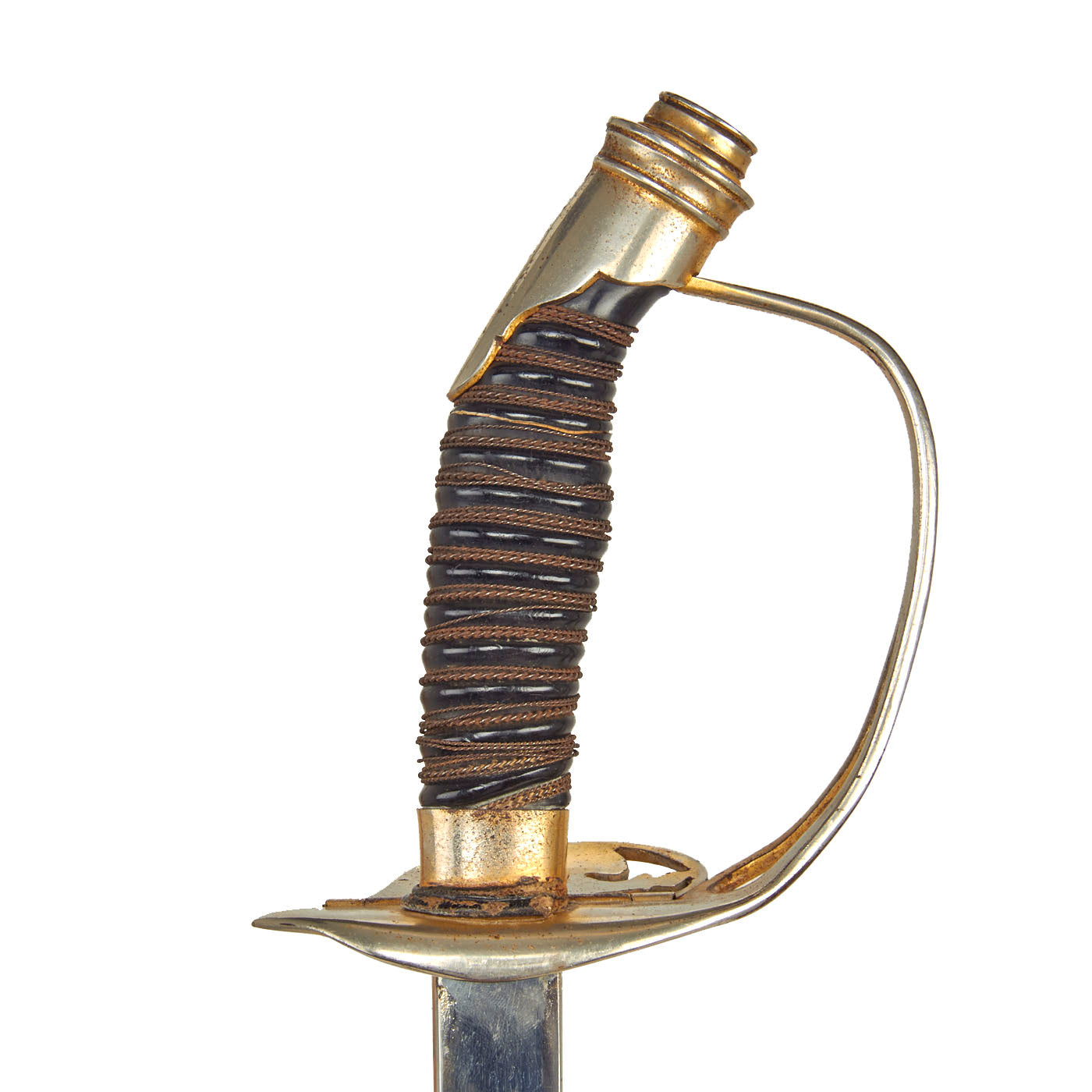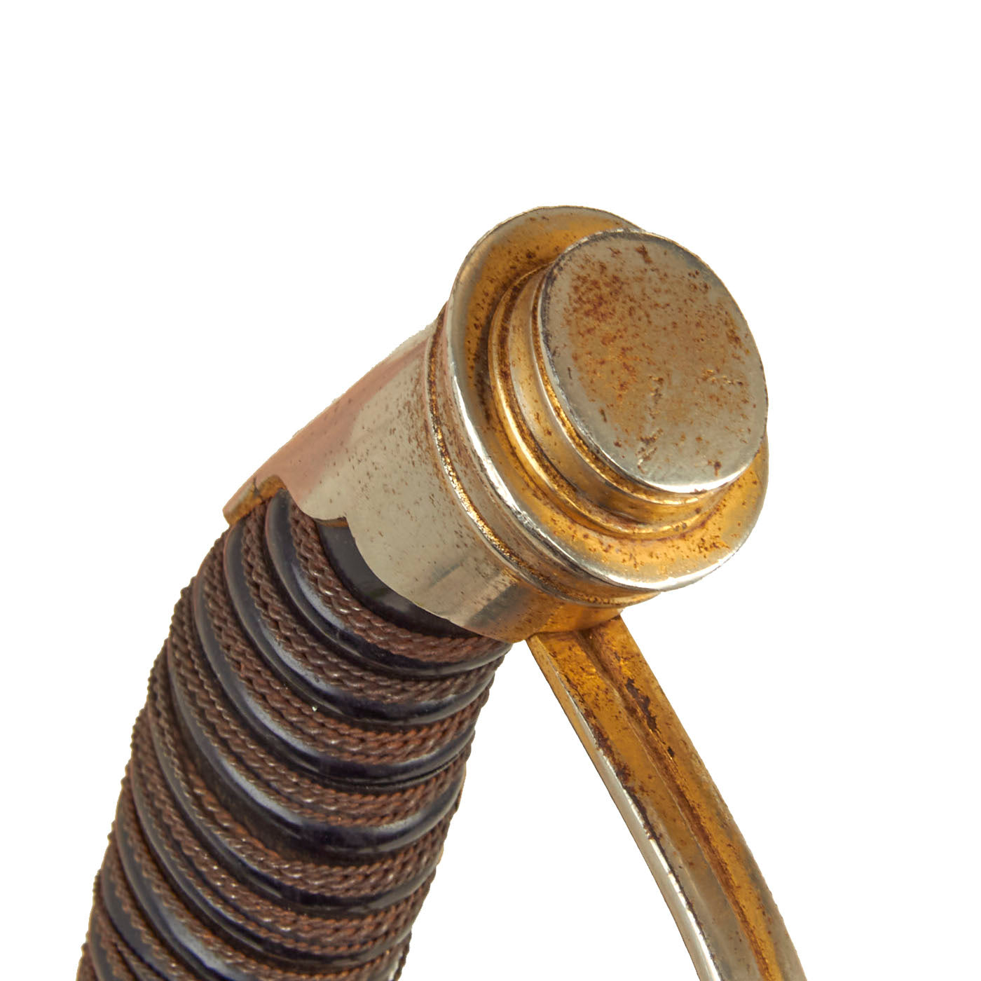 The hilt is a gilded brass “D” shape guard with the Imperial German eagle of Kaiser Wilhelm II cypher emblazoned on the grip. The Imperial Eagle portion of the guard folds in or out, depending if needed or not. The hilt overall is stunning with a gold wash on the hilt and cypher. The grip is wrapped in brass wire, bound over black celluloid. The grip and brass wire wrap are in great, tight condition. In addition, the original leather forefinger loop on the inside of the guard is missing. A brown leather washer is fitted to the blade where it meets the guard.