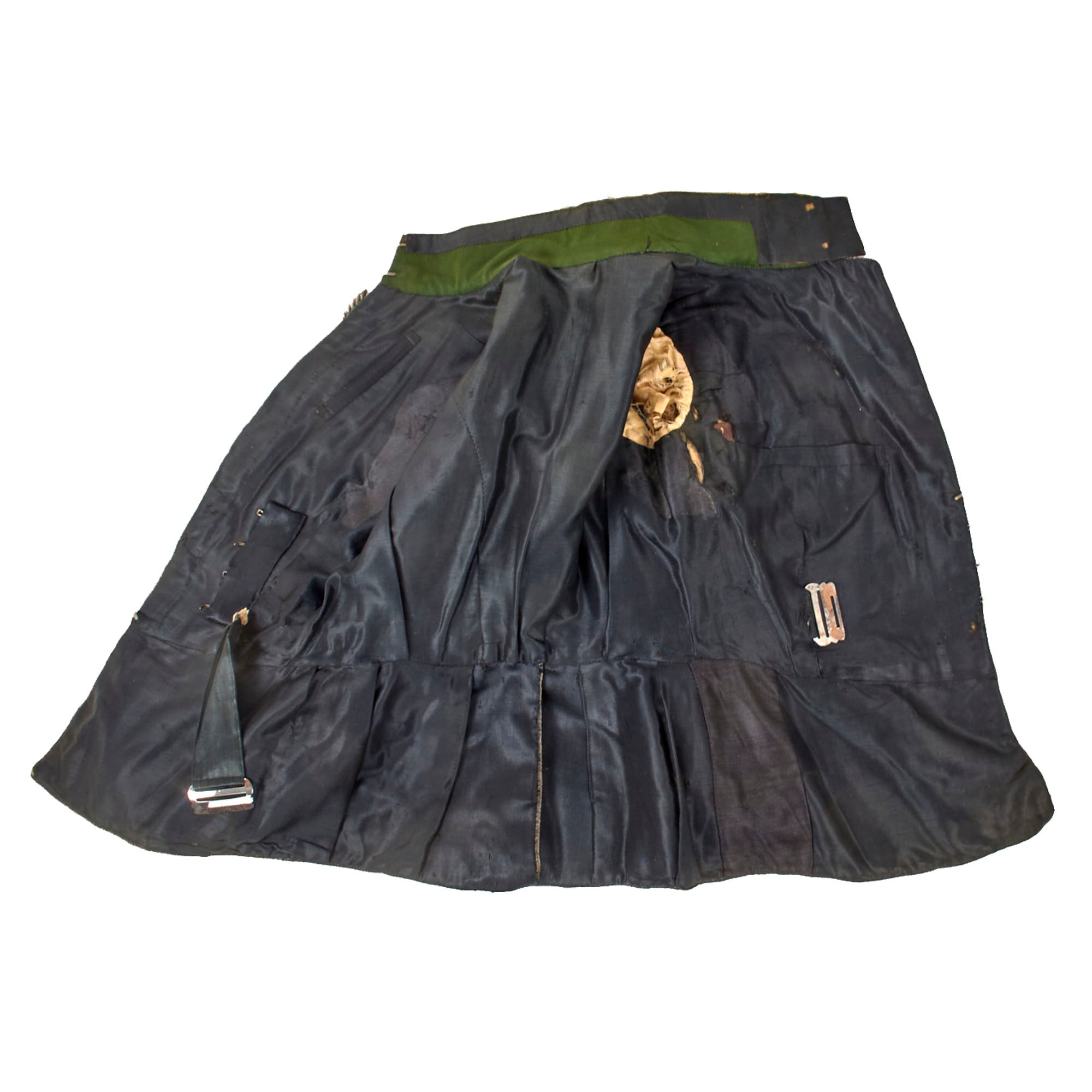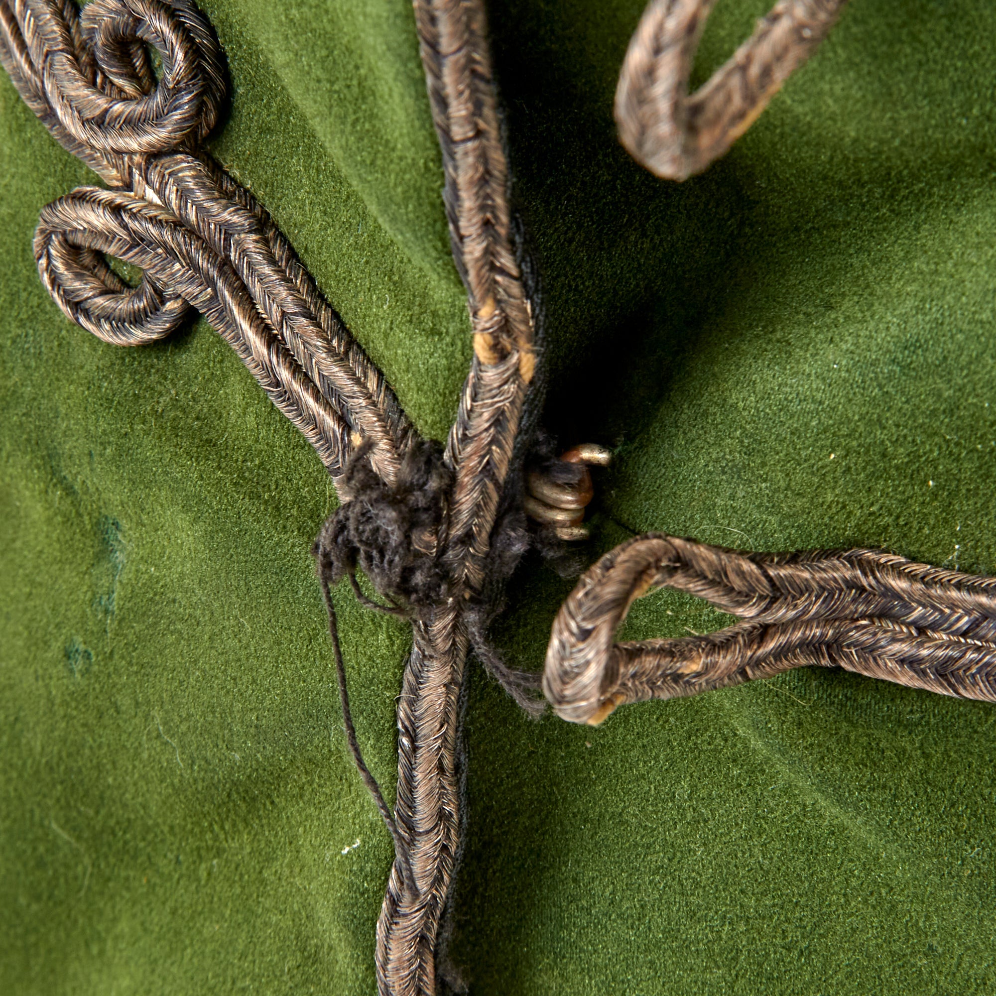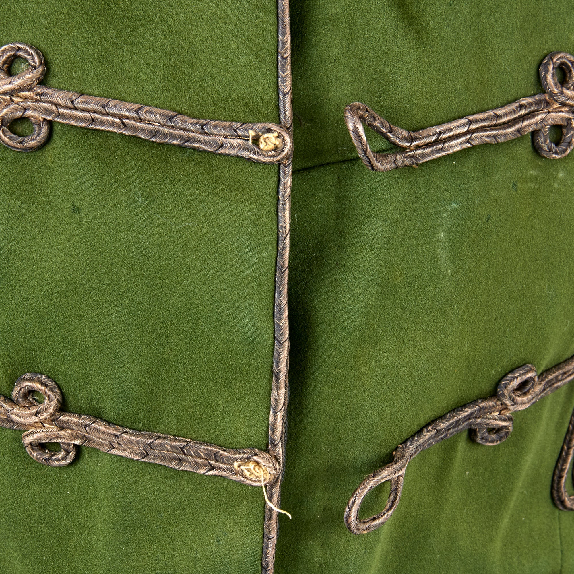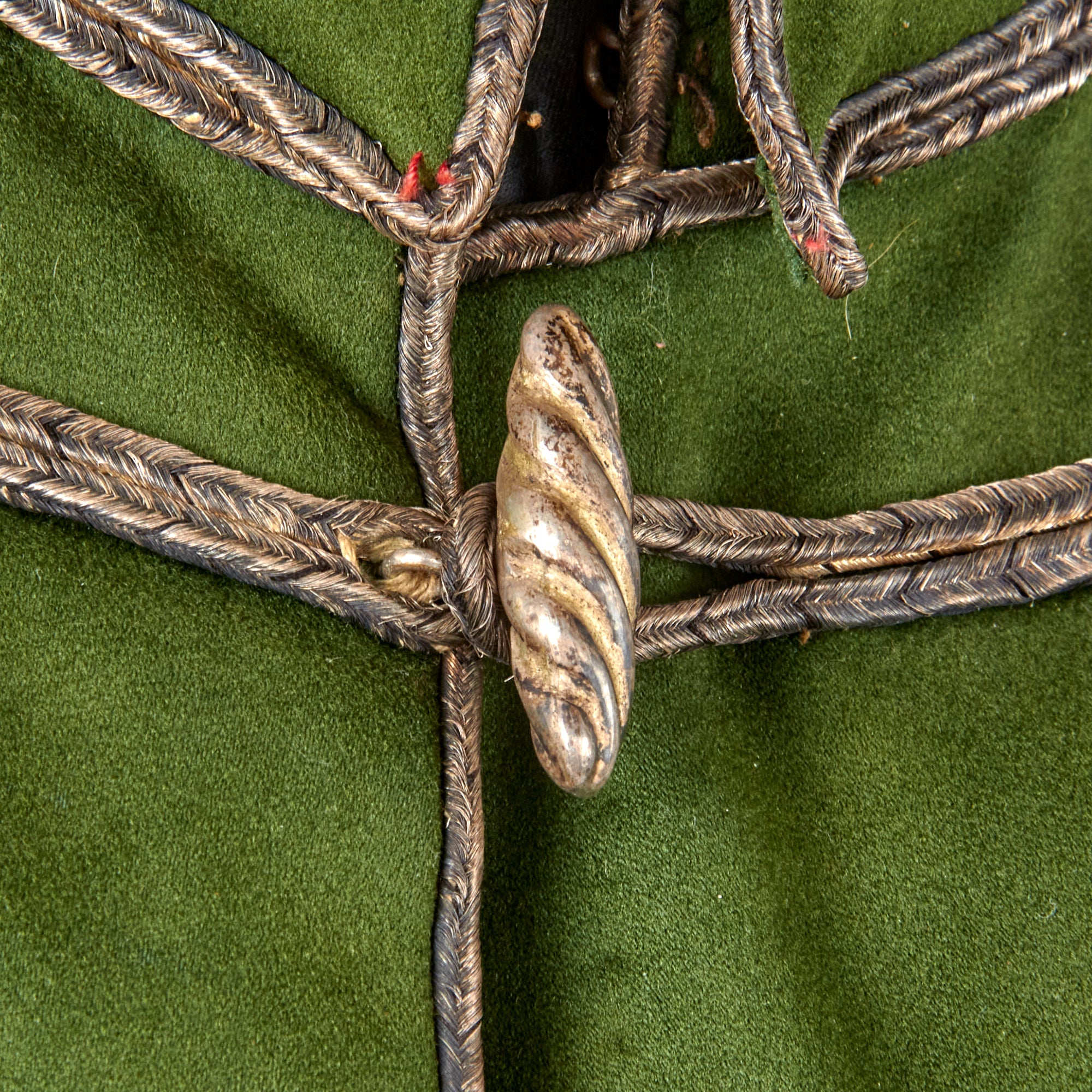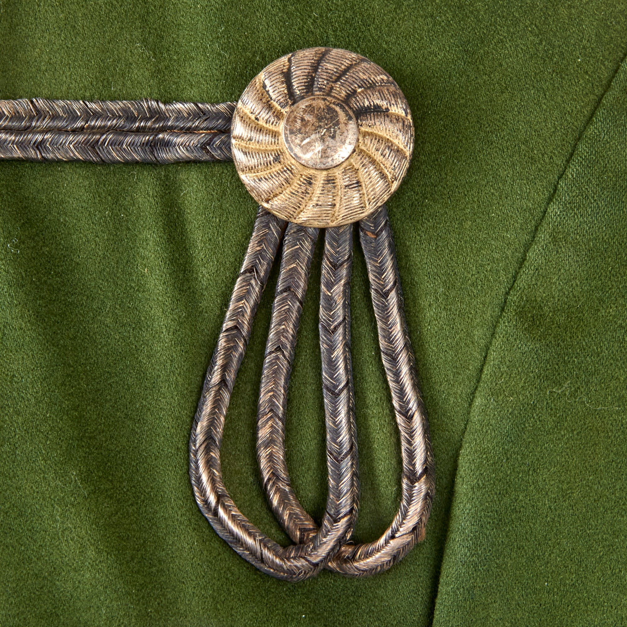 This is a beautiful Imperial German pre-1914 green wool tunic with stand-up collar. Silver bullion frogging. Toggle buttons, bullion piping on sleeve and back. Interior lining with inside left breast pocket. Minor wear and scattered moth holes. This particular tunic is green with white/silver braiding, identifying this as being for the 2nd Westfälisches Husaren-Regt. Nr.11(Crefeld) VII Armee Korps.