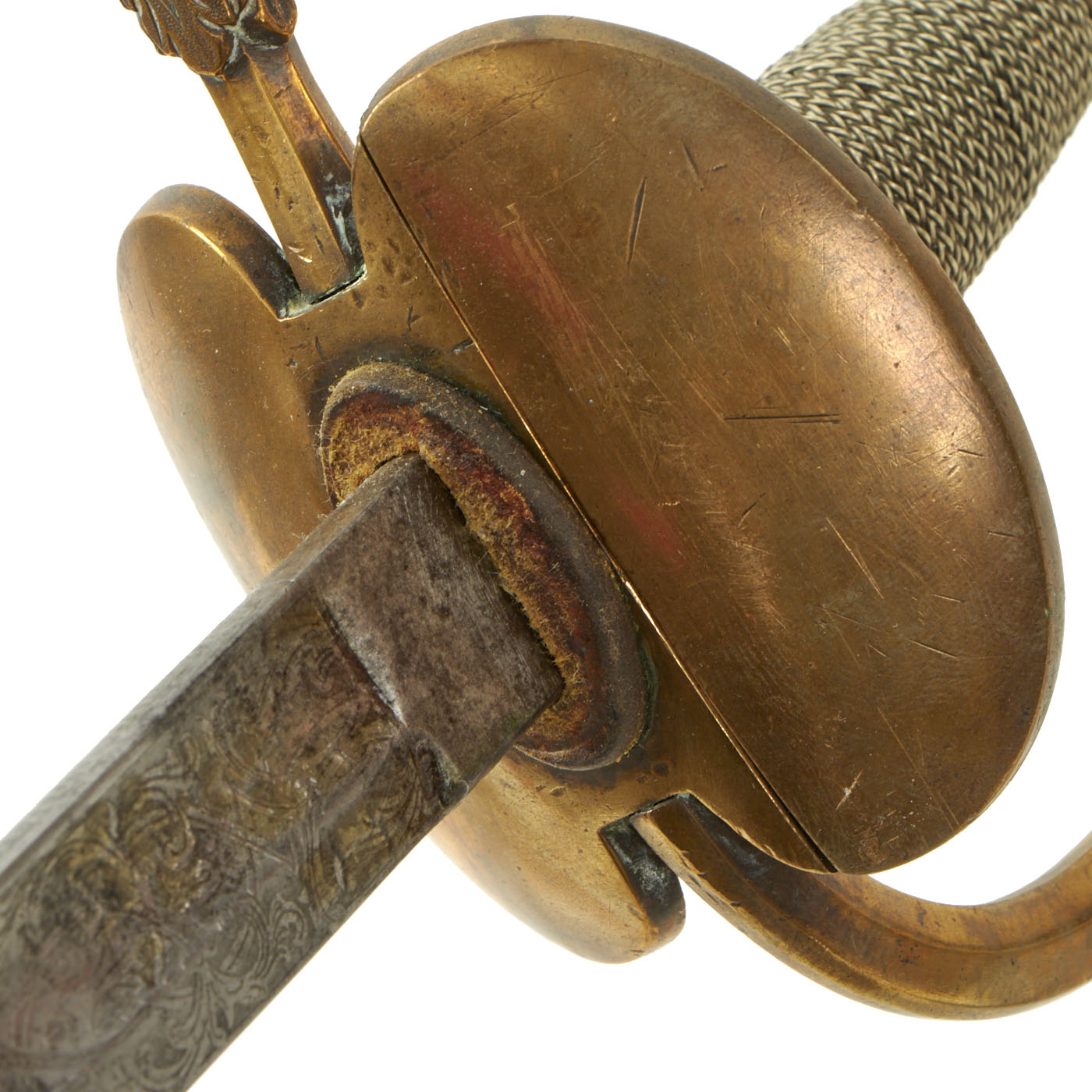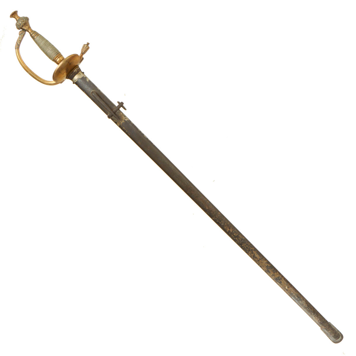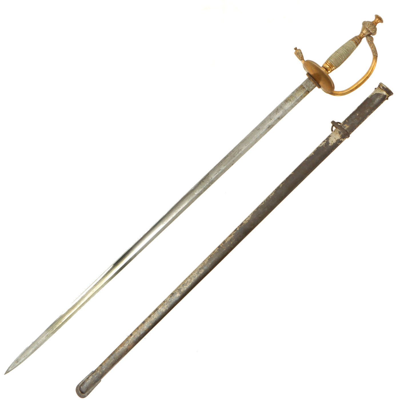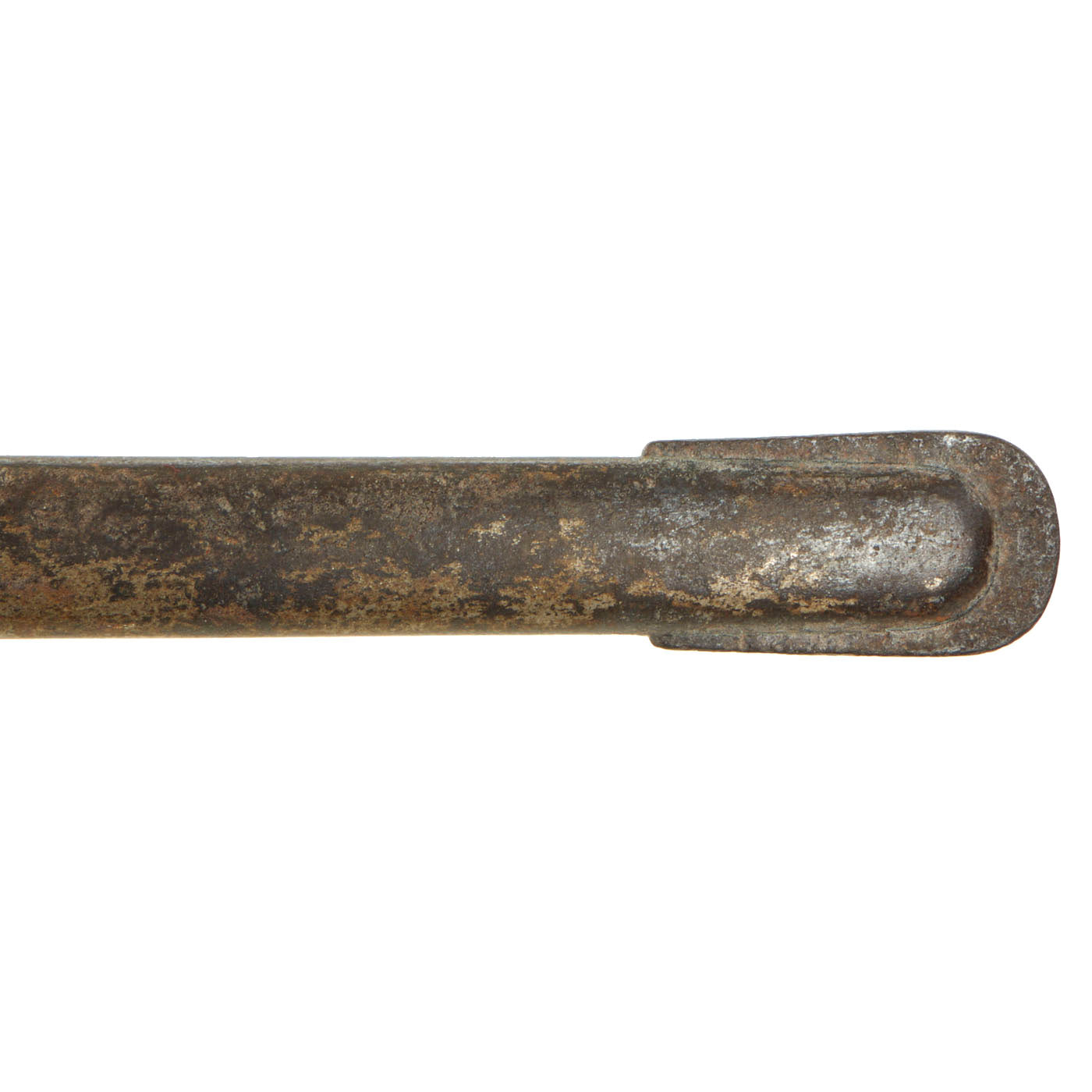 Original steel scabbard is included, which features a hook and a single scabbard ring. This allowed the sword to be worn by either the means of a baldric, or a sword belt. The scabbard does, unfortunately, show loss of its original nickeled finish.