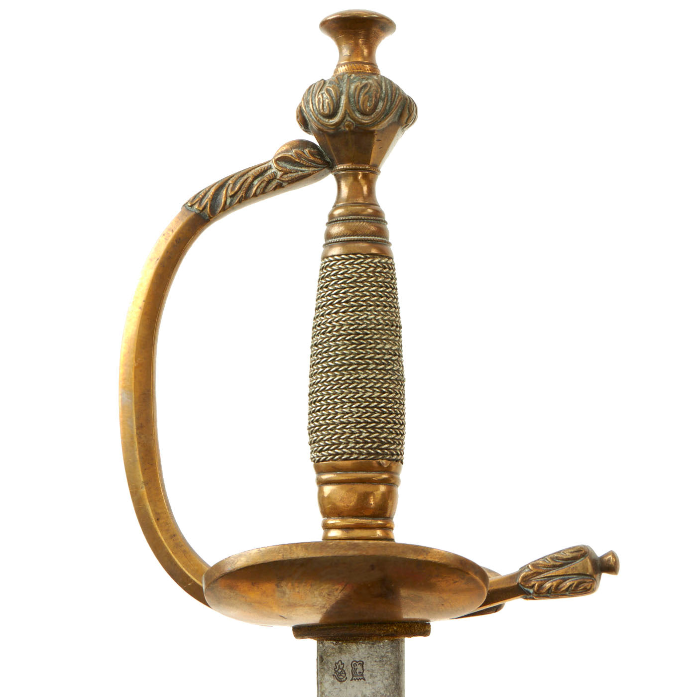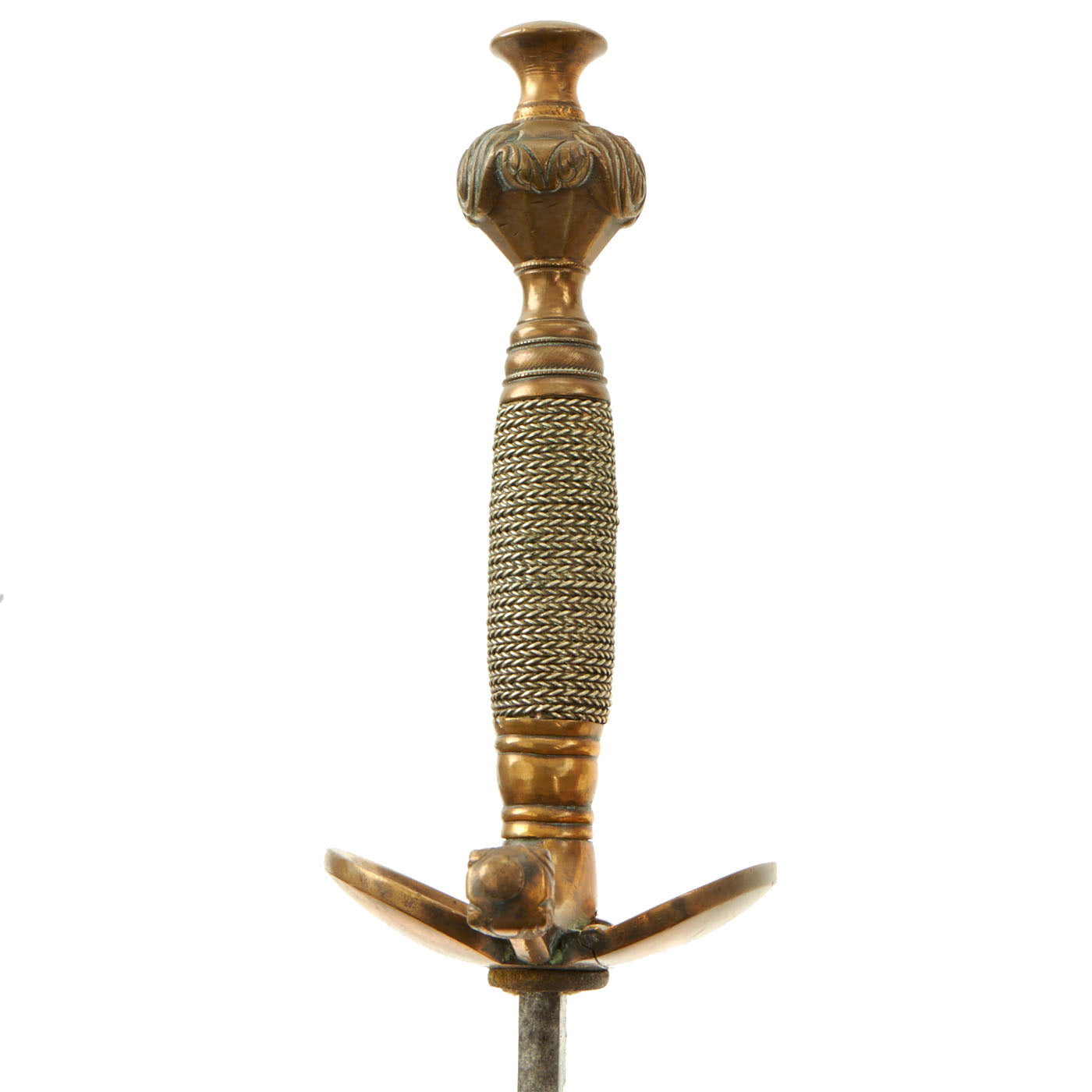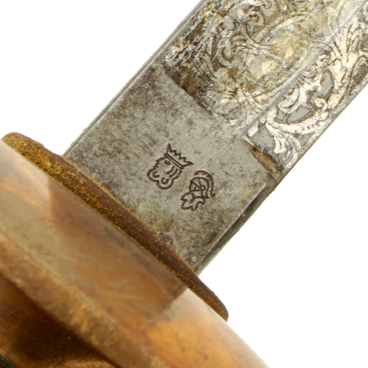 The blade is marked on the ricasso with the double trademark "Knights's Helmet" (Ritter-helm) alongside a "Kings's Head" (königskopf) logo of legendary German maker Weyersberg Kirschbaum & Cie of Solingen. This trademark is used on privately purchased blades and walking out bayonets from the late 19th and early 20th centuries, and is absolutely correct for this sword. For more information please see J. Anthony Carter’s work GERMAN KNIFE AND SWORD MAKERS.