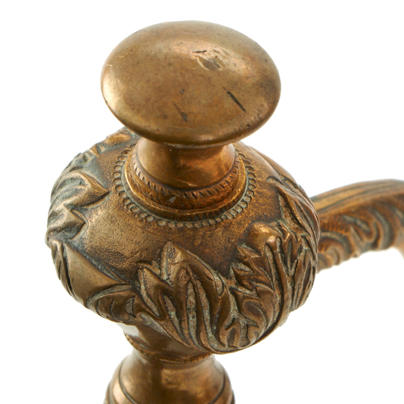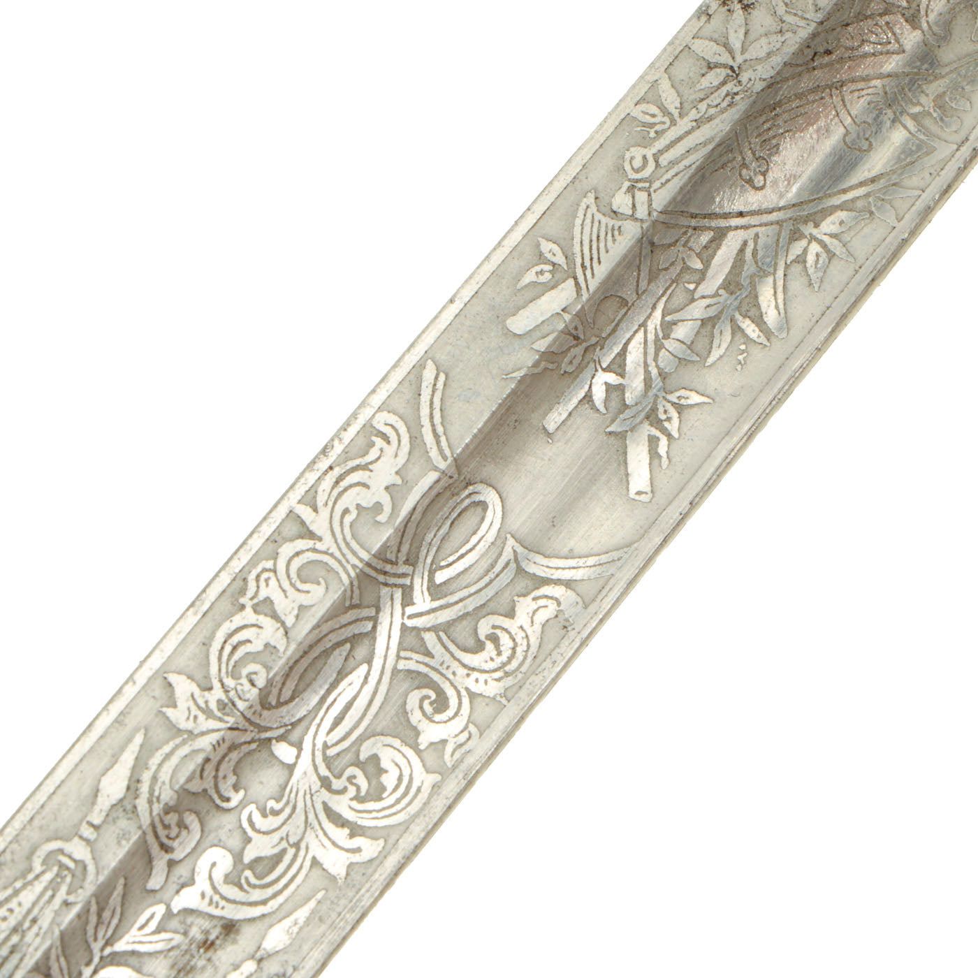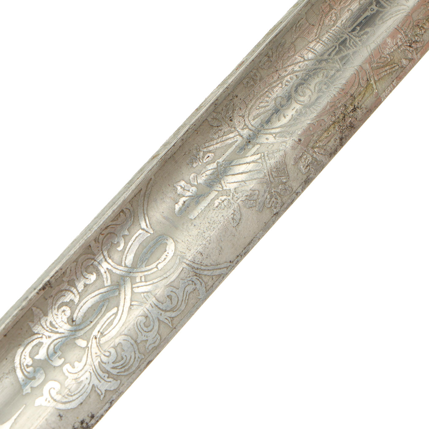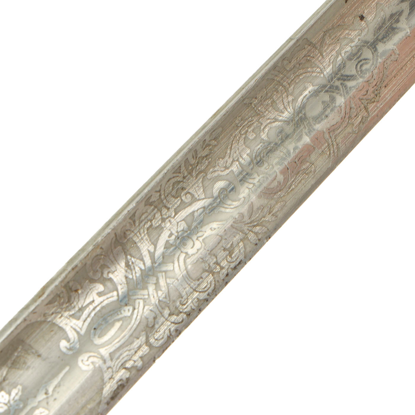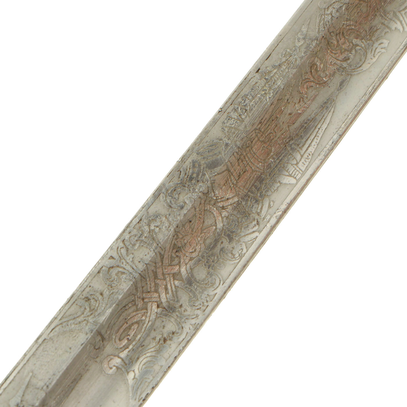 The Sword features a beautiful etched blade, with each side exhibiting scrollwork and military motifs extending halfway up the blade. The spine is etched with floral scrollwork along with what is believed to be a retailer’s marking AUG. LOH SÖHNE, BERLIN.