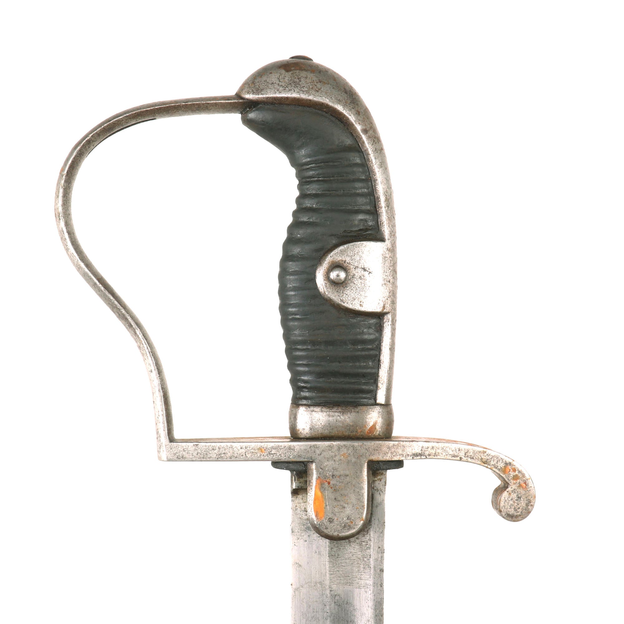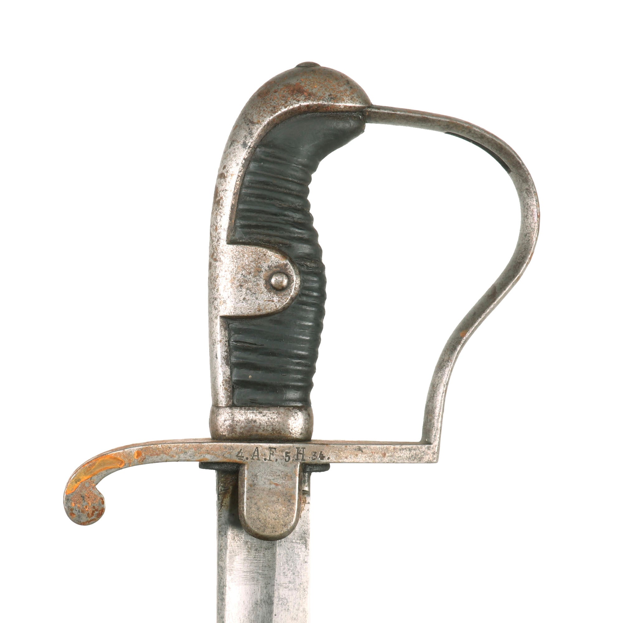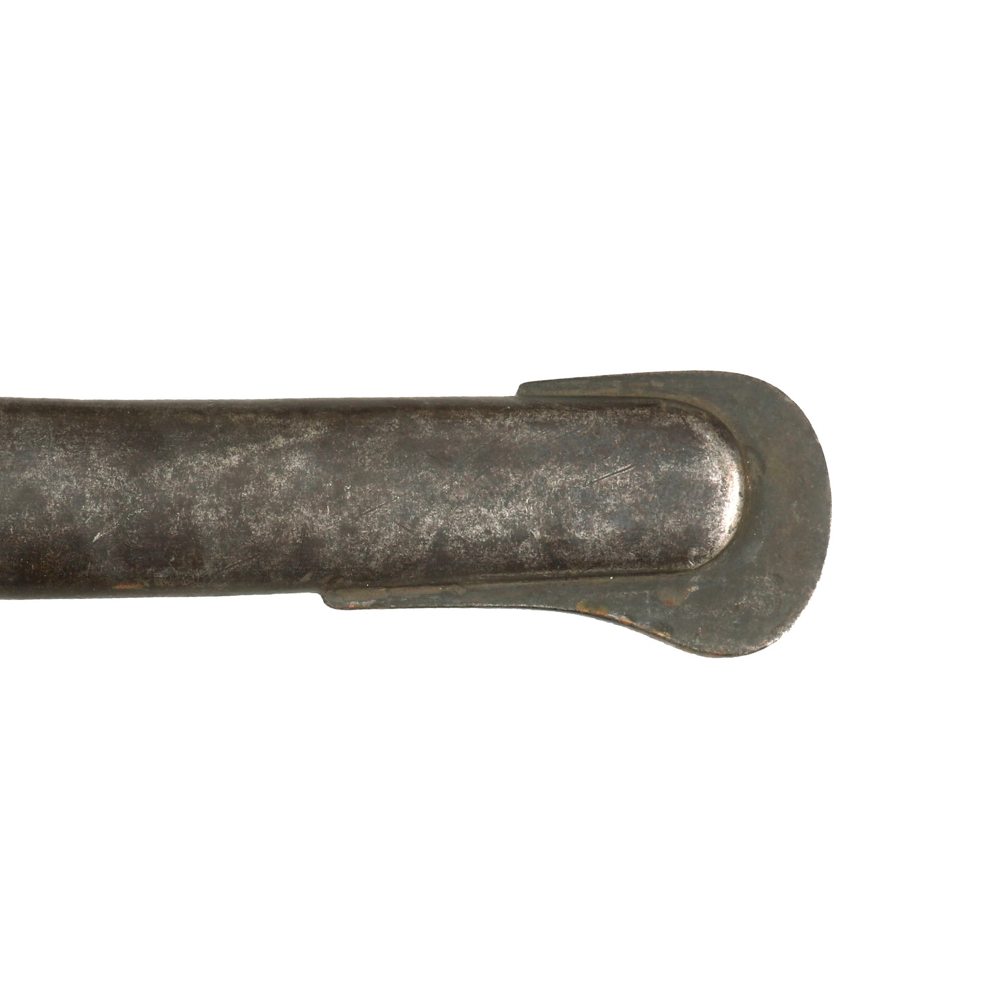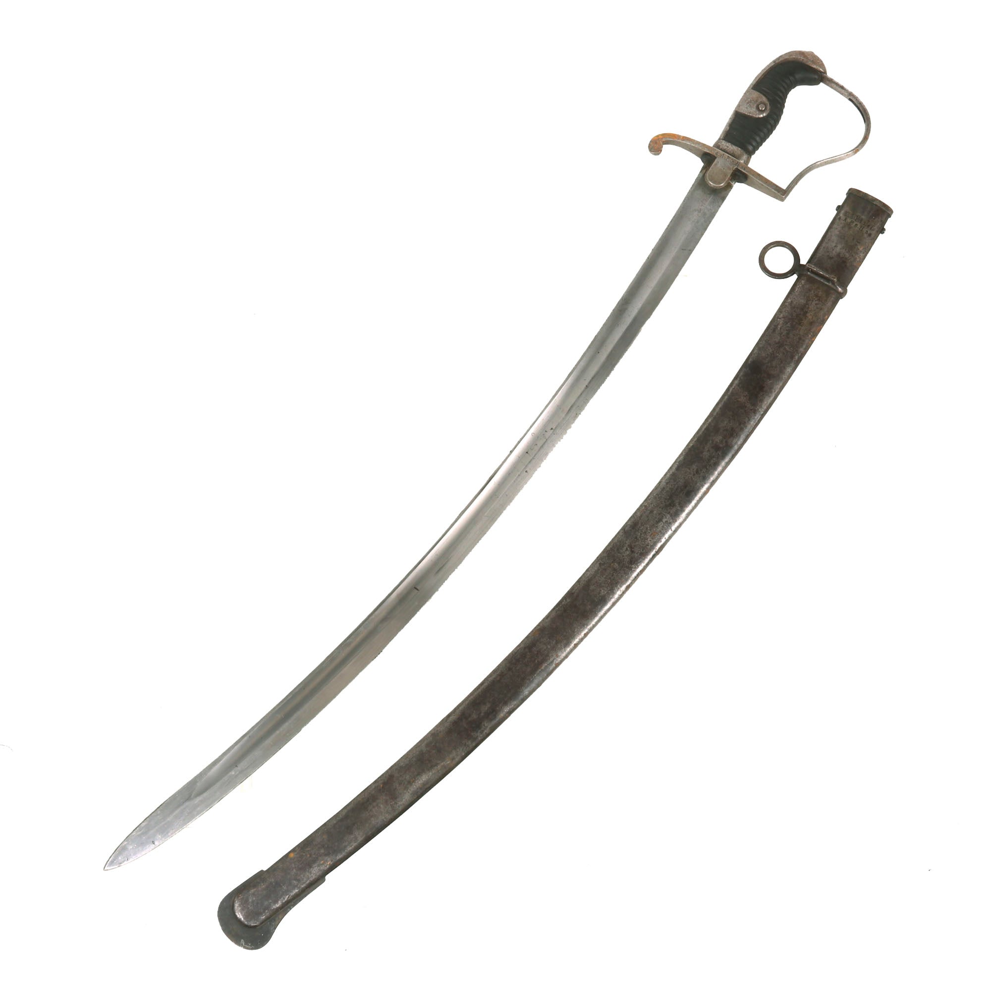 The blade still retains the leather blade buffer, though it is a bit worn, and the sword has a very nice wooden ribbed grip, which are somewhat more rare to find on these examples when compared to the rubber grip. It features the characteristic single knuckle bow hand guard. There are various proof marks on hilt and blade, and this sword comes with the original all steel scabbard, which is in very good condition. It still retains a good amount of the original blued finish, especially near the throat. It does have some denting on the body, but no real bends, and none of this interferes with the sheathing of the blade. There is some light oxidation across.