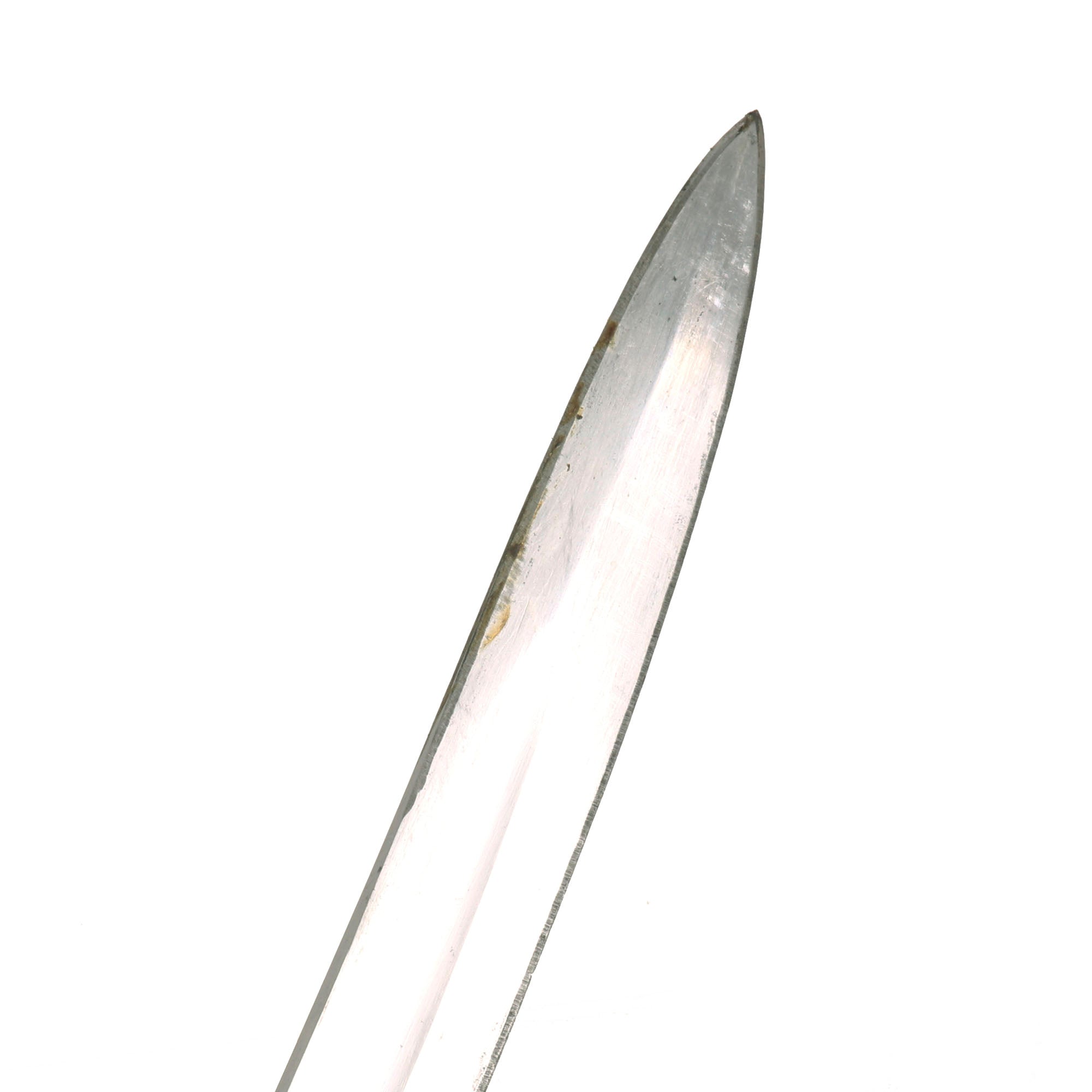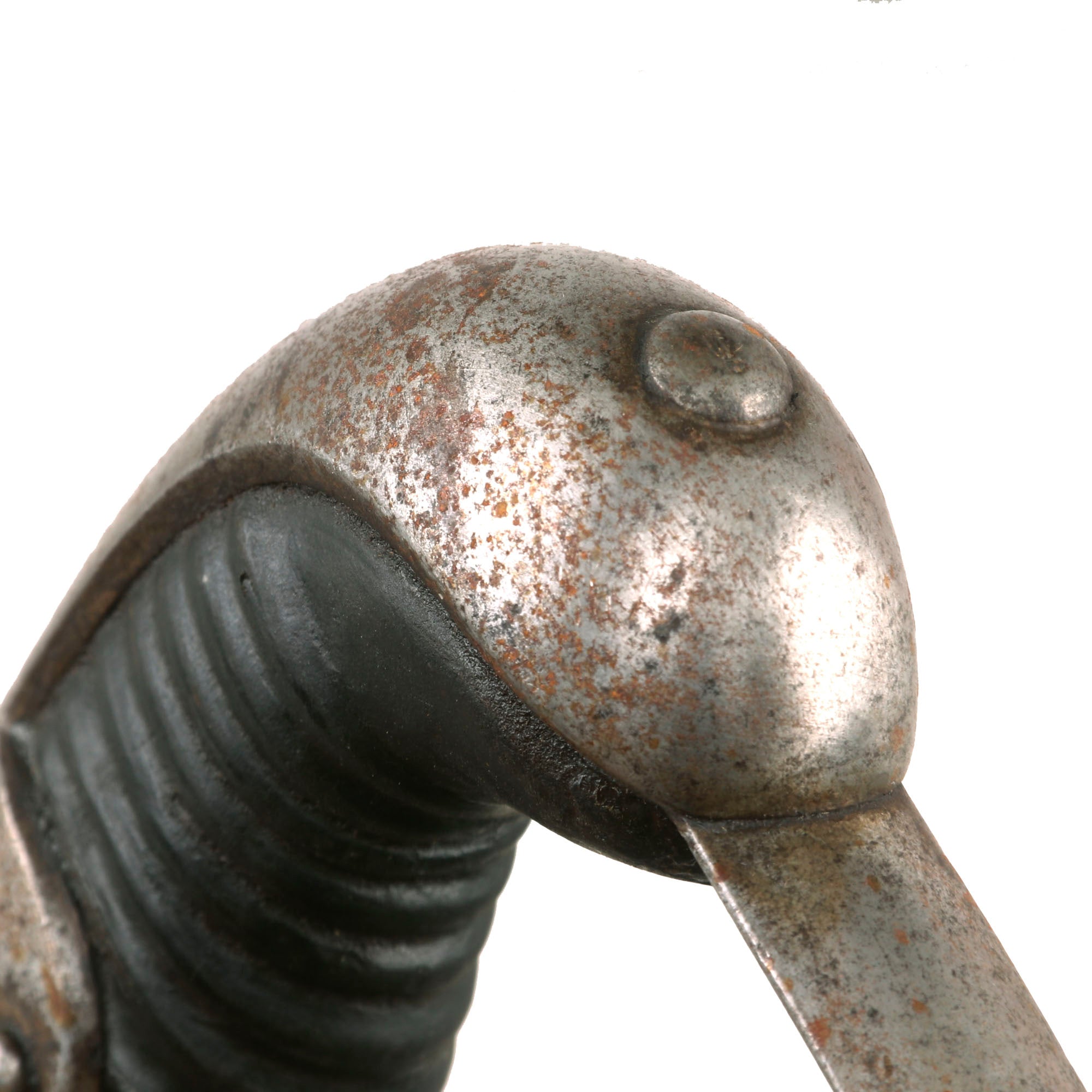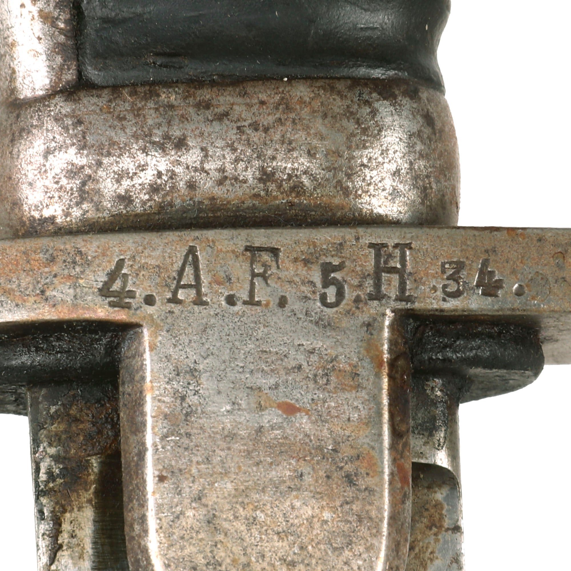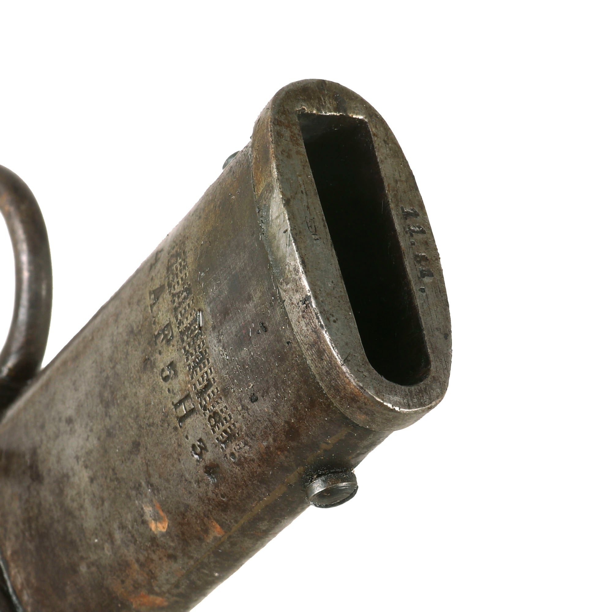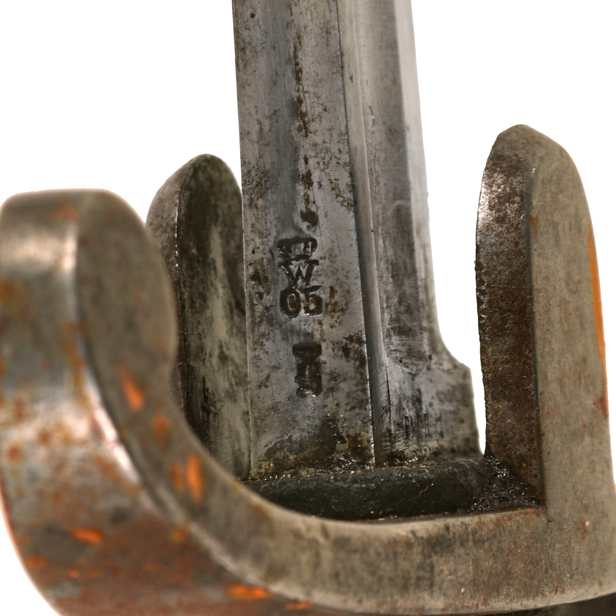 This example is in very good service used condition, showing very nice blade condition, with only a few areas of light oxidation on the otherwise solid blade. The machining marks can even still be seen on most of the blade body. The blade has been sharpened, and there are a few small nicks, but it is still quite nice. It is stamped on the upper spine near the hilt is a small Crown over W over 05 for Kaiser Wilhelm II 1905, the year it was accepted into service. Under this is a sub inspector marking. The ricasso has a very faint maker marking, E. & F. HÖRSTER of Solingen. According to J. Anthony Carter's book, GERMAN KNIFE AND SWORD MAKERS, the company was originally founded in 1850 as "Friedrich Hörster" in 1850. It was then renamed to E. & F. Hörster in 1870 at the behest of Friedrich Emil & Fritz Hörster. The firm lasted long after WWII, finally being declared insolvent in 1996. This is stamped under the rain guard (chappe), making it quite hard to see and impossible to photograph.