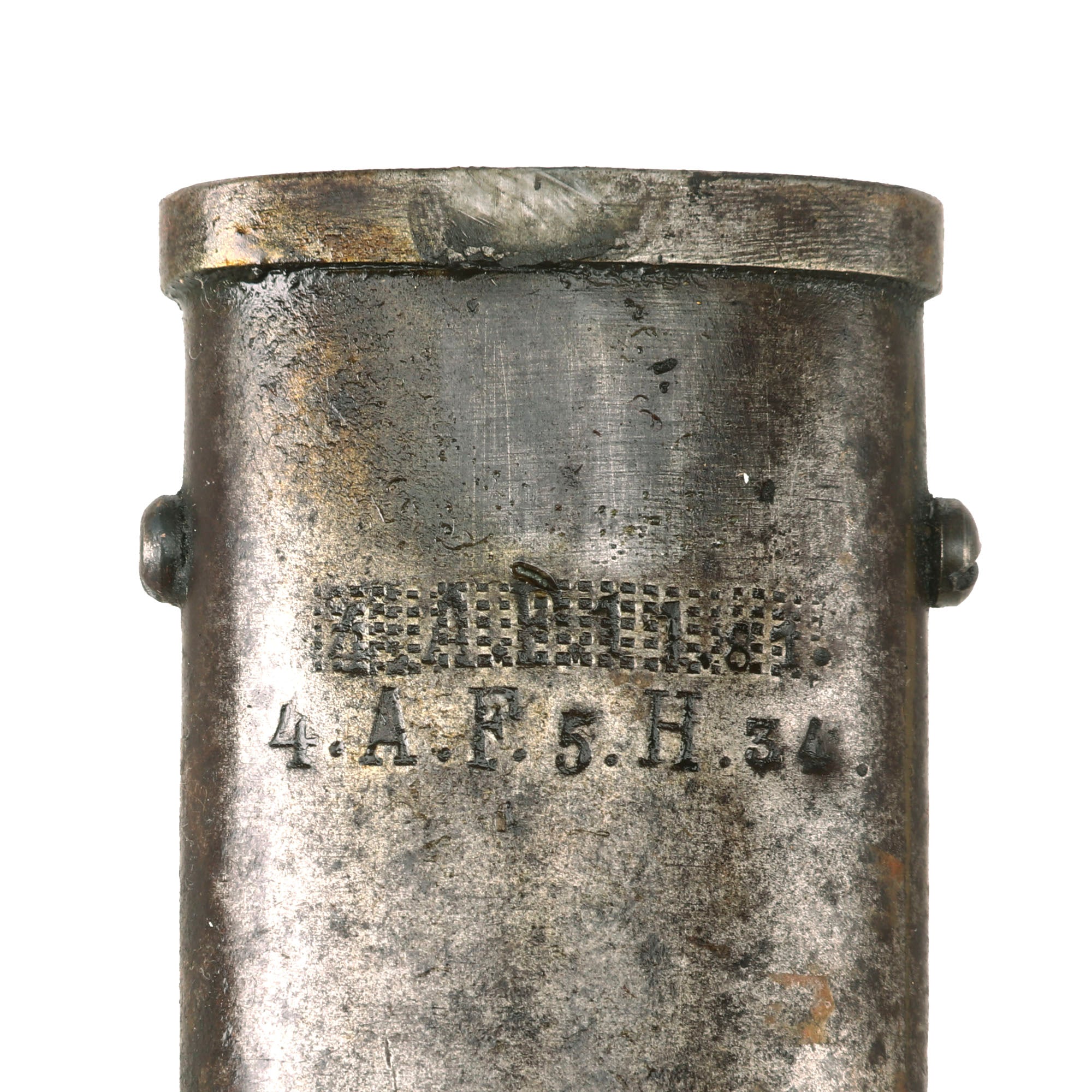 The crossguard of the saber and scabbard are regimentally marked with 4.A.F.5.H.34 which identifies it to Fußartillerie-Regiment Encke (Magdeburgisches) Nr. 4, 5th Battery/Company Howitzers, Weapon Nr. 34. This translates to Foot Artillery Regiment “Encke” (Magdeburg) No. 4. A most desirable Imperial German WWI Artillery Officer's "Blücher Sabel" with scabbard, ready to research and display!