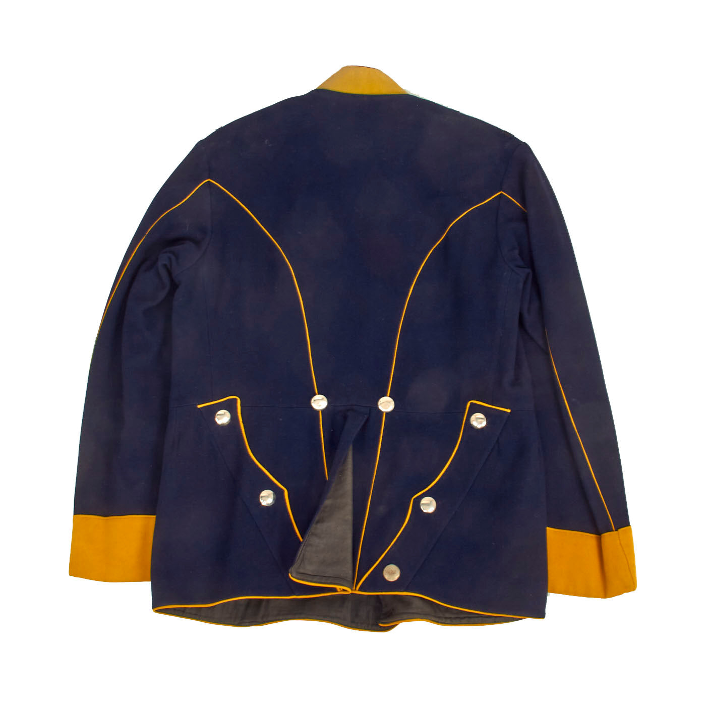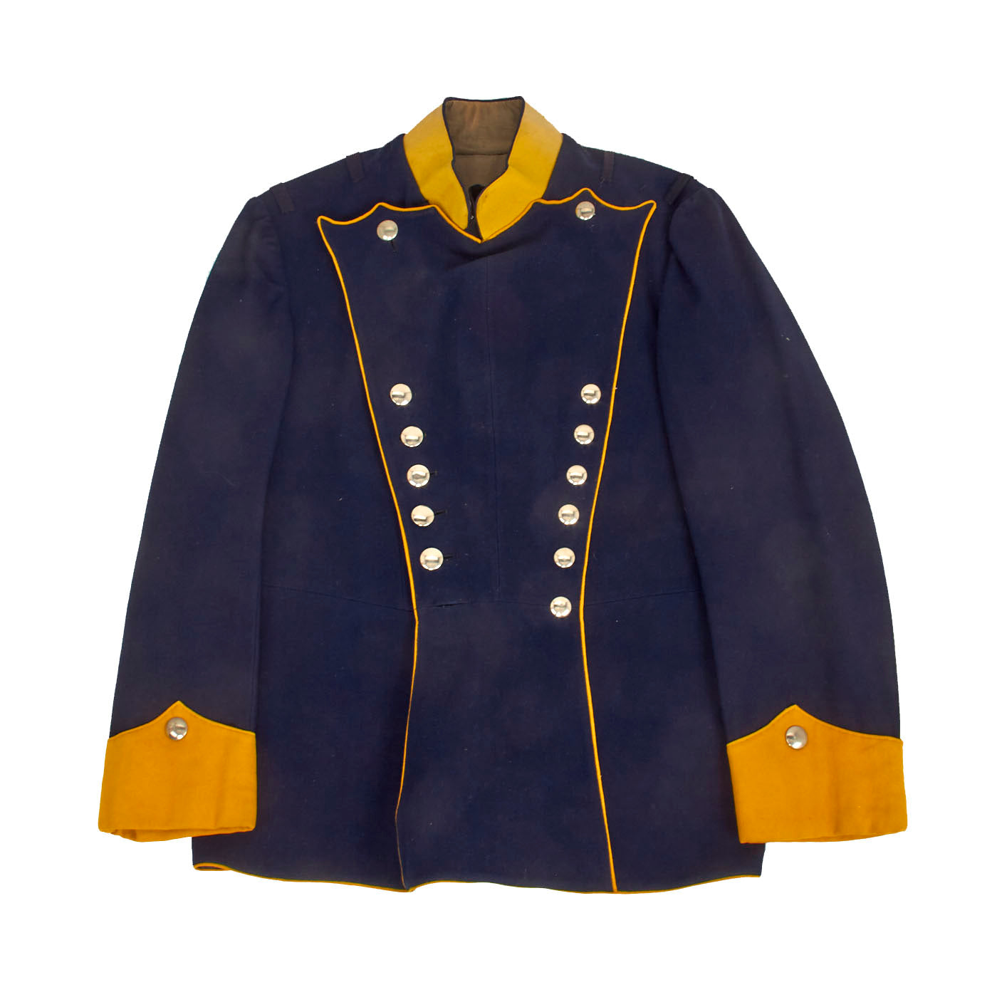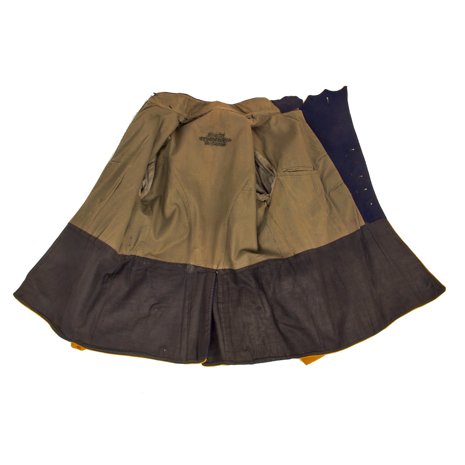 This Mannschaften (Other Ranks) Eigentumsstück (private purchase) Ulanka from Schleswig-Holsteinisches Ulanen-Regiment Number 15. The Ulanka is a dark blue doe-skin wool with Polish cuffs and lined in black silk. The facing color for Ulanen-Regt. Nr.15 was dark yellow and is reflected by the yellow collar, cuffs, epaulets, and yellow piping around the plastron front panel, bottom hem, and rear shoulder seams. Buttons were silver to match the fittings on the Tschapka. The condition of this Ulanka is very good. The back of the Ulanka shows a unique piping arrangement. Note that the shoulder seams, rear sleeve seams, and lower edge of the Ulanka are piped in yellow. All buttons are present but not stitched onto the uniform. The one button that separated from the uniform is pinned to the upper right side.