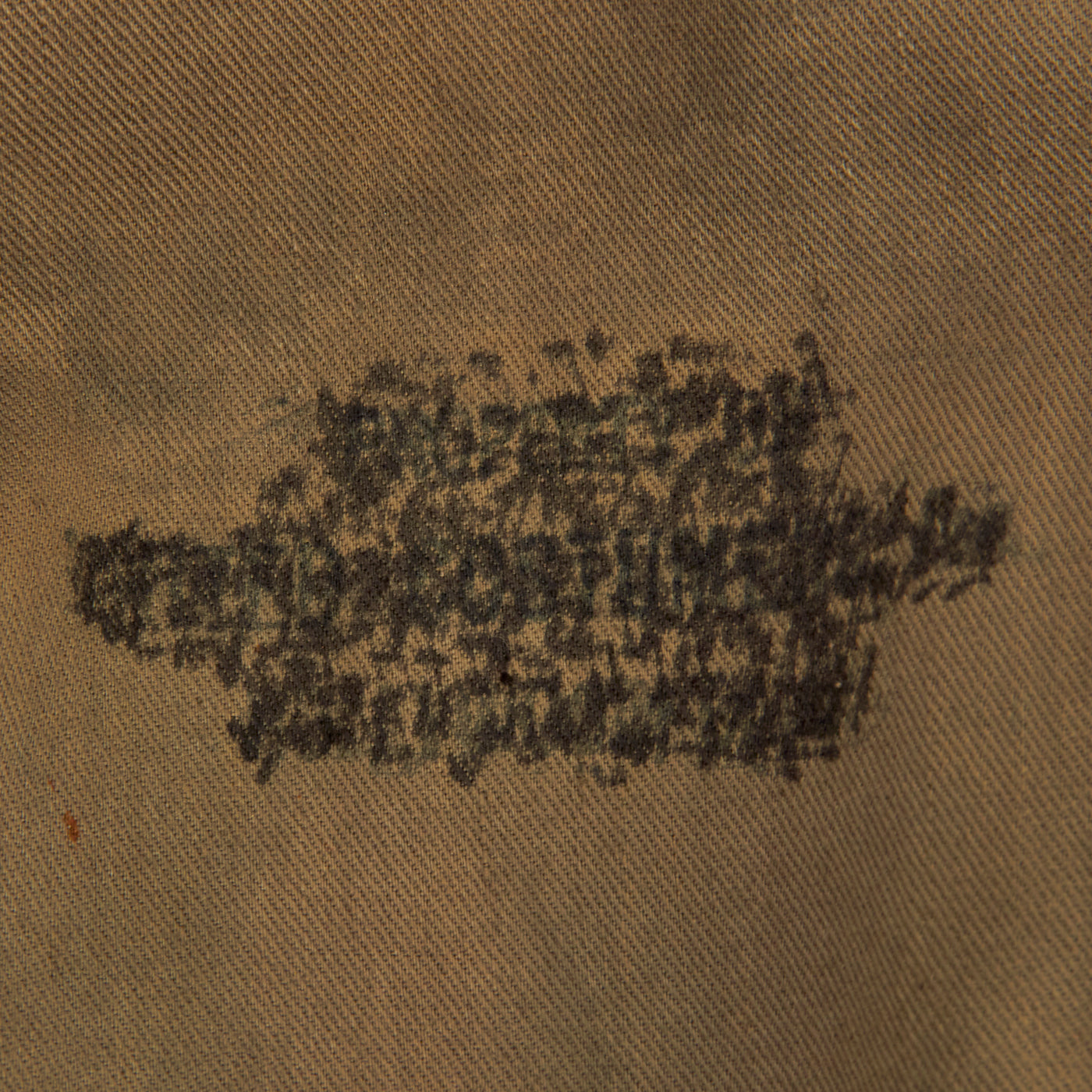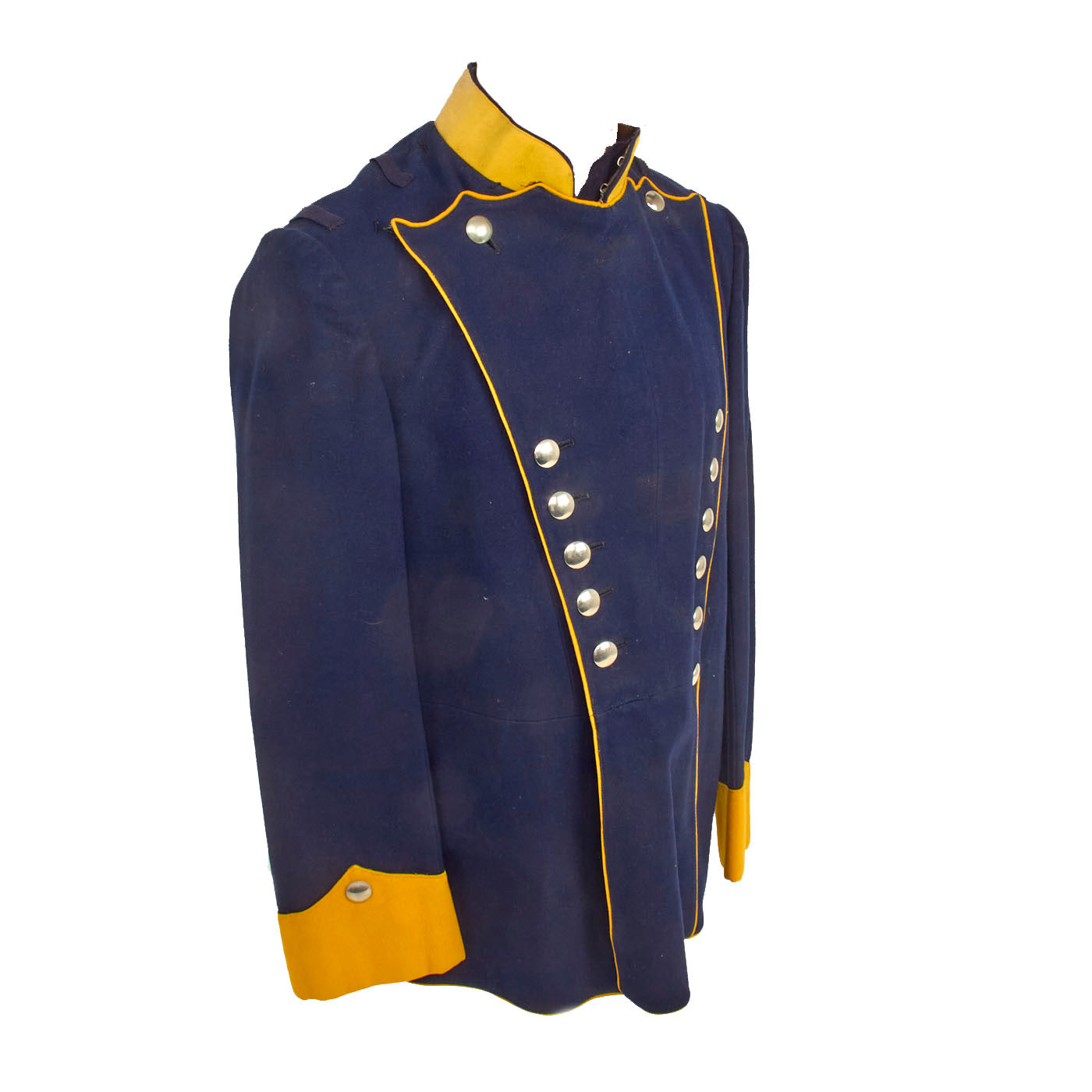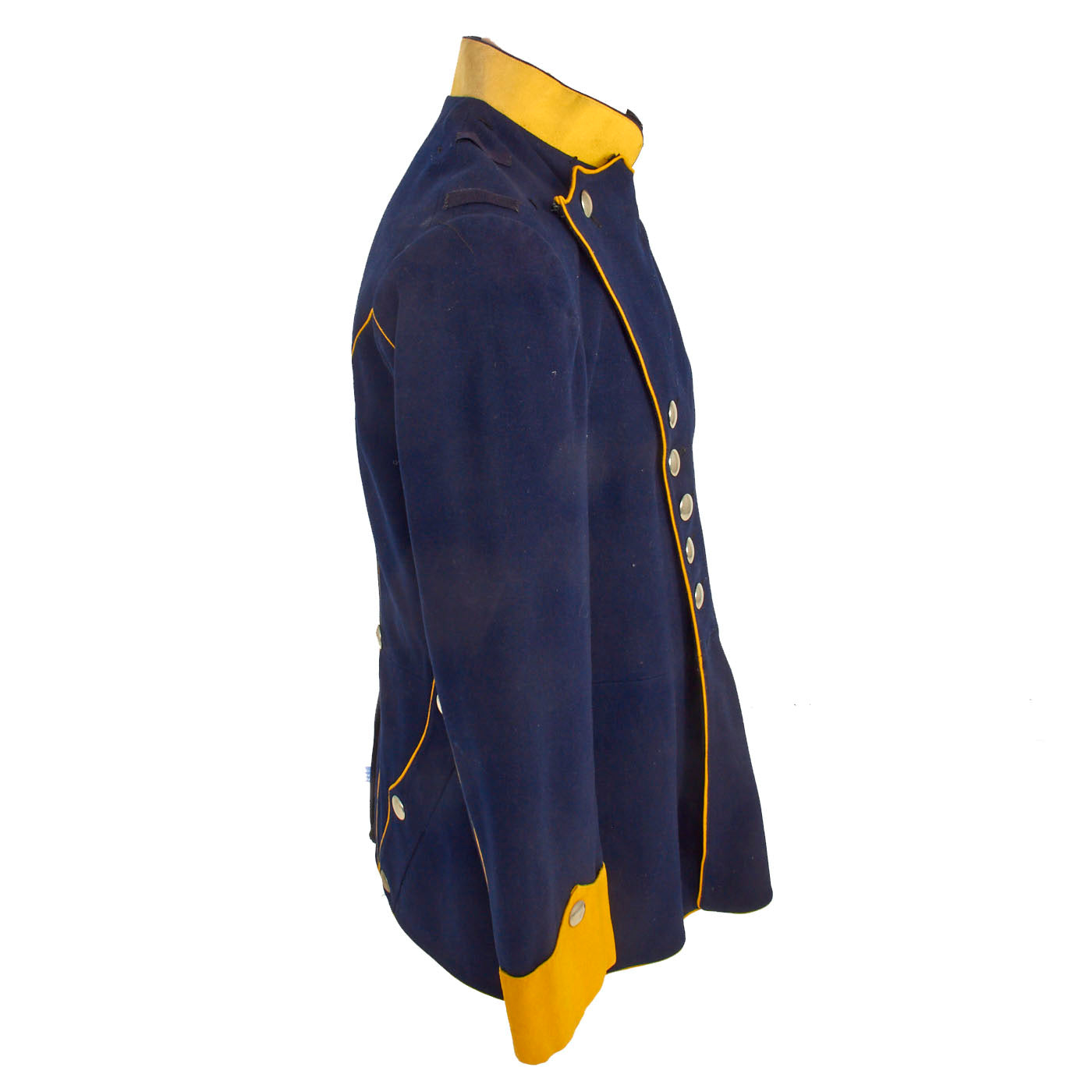 This Mannschaften (Other Ranks) Eigentumsstück (private purchase) Ulanka from Schleswig-Holsteinisches Ulanen-Regiment Number 15. The Ulanka is a dark blue doe-skin wool with Polish cuffs and lined in black silk. The facing color for Ulanen-Regt. Nr.15 was dark yellow and is reflected by the yellow collar, cuffs, epaulets, and yellow piping around the plastron front panel, bottom hem, and rear shoulder seams. Buttons were silver to match the fittings on the Tschapka. The condition of this Ulanka is very good. The back of the Ulanka shows a unique piping arrangement. Note that the shoulder seams, rear sleeve seams, and lower edge of the Ulanka are piped in yellow. All buttons are present but not stitched onto the uniform. The one button that separated from the uniform is pinned to the upper right side.