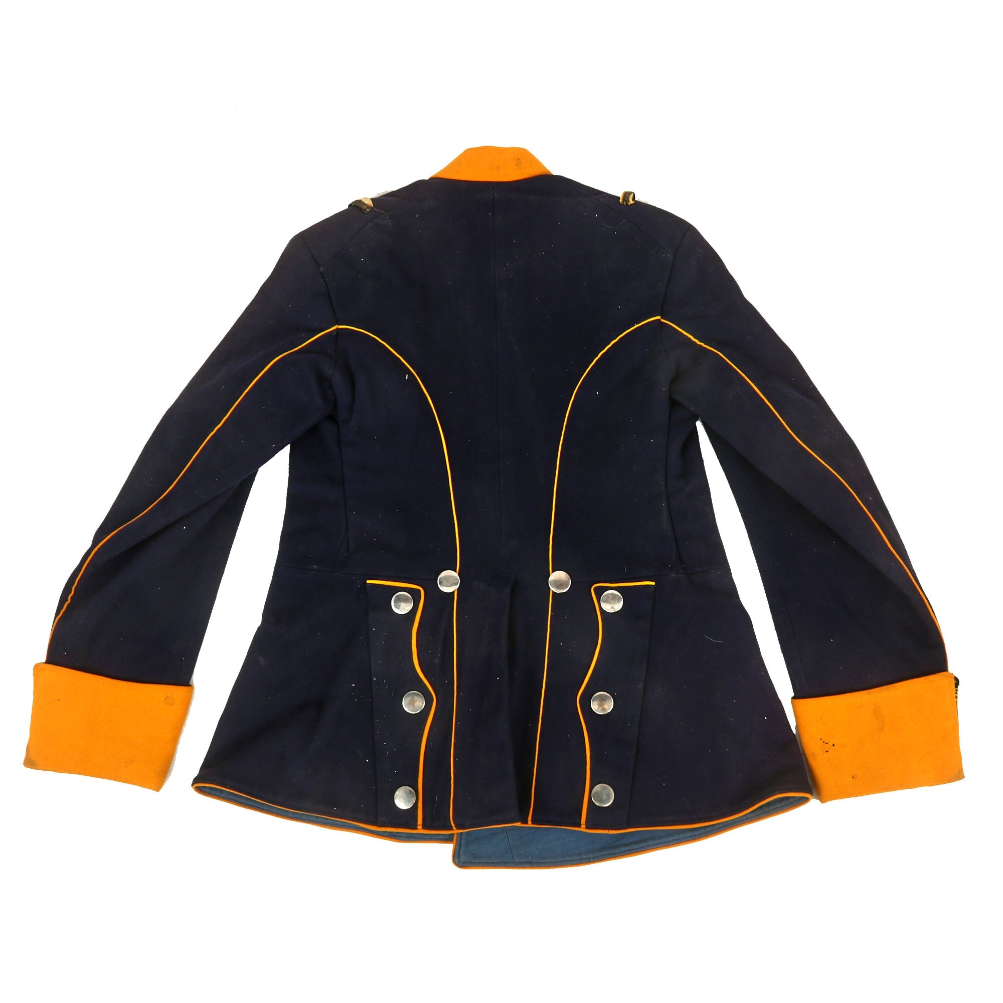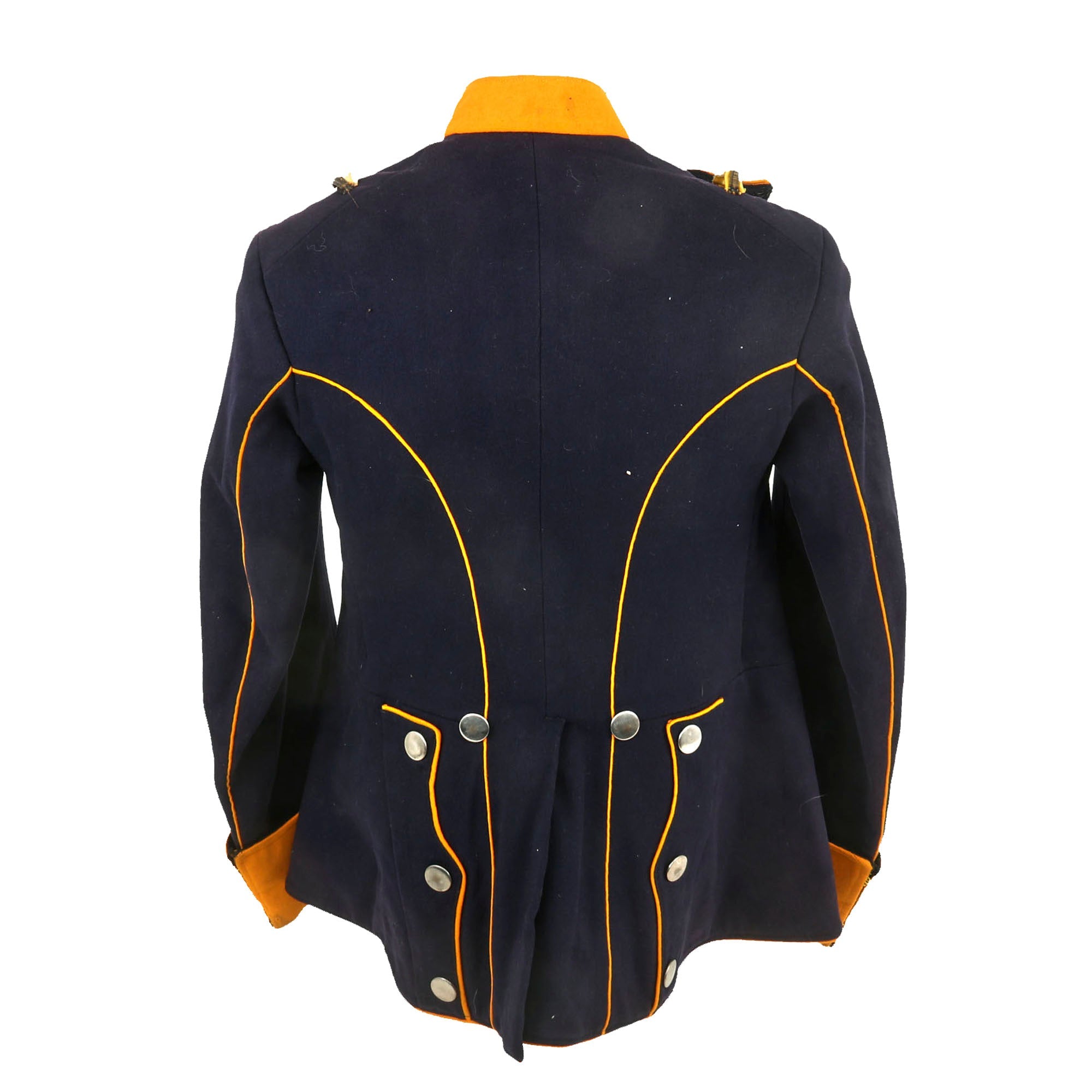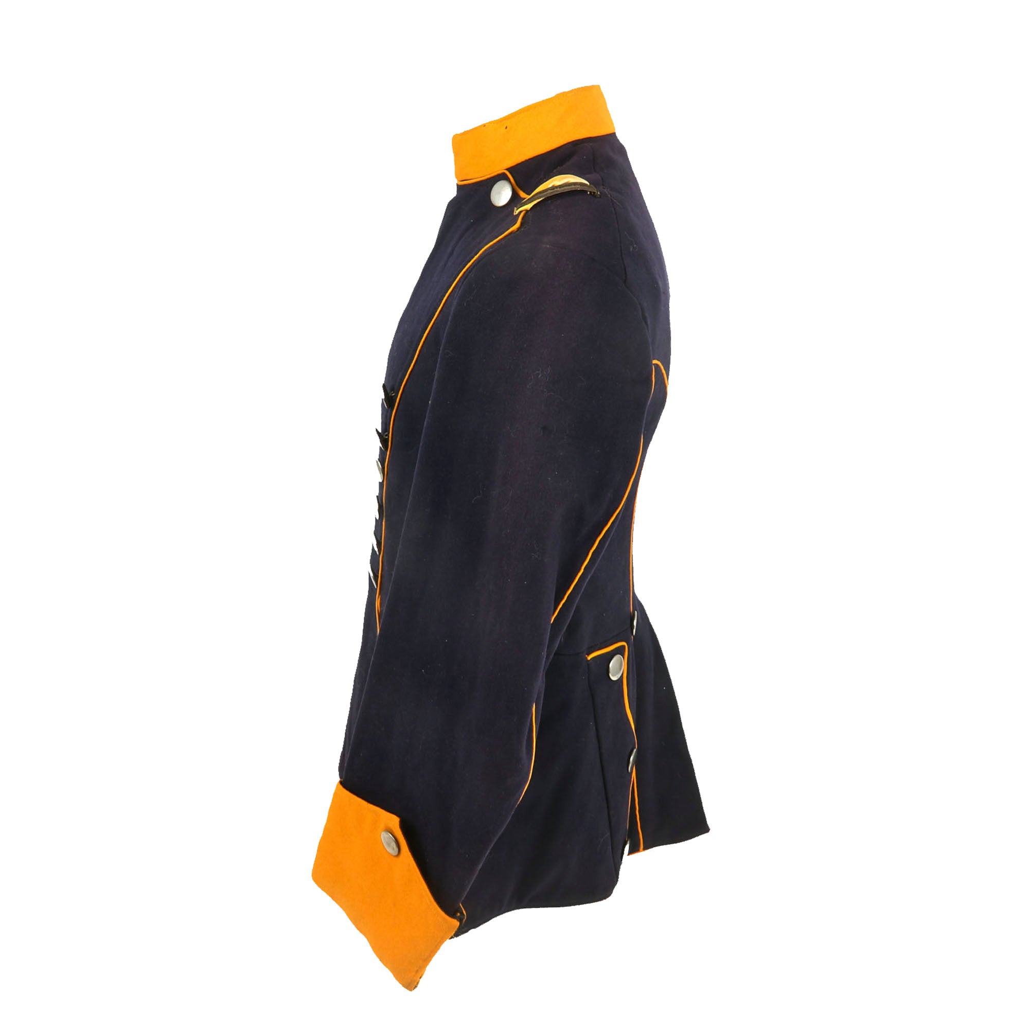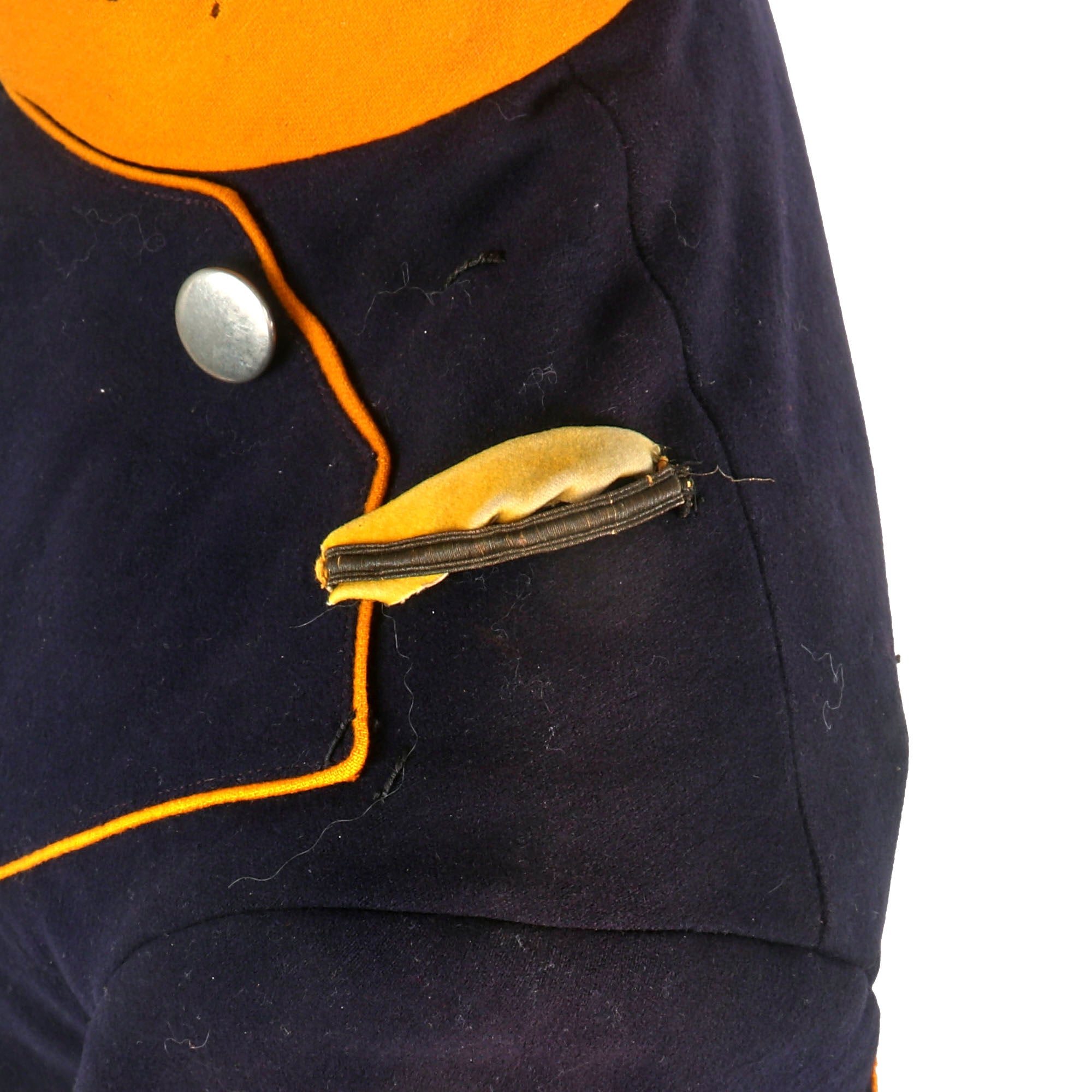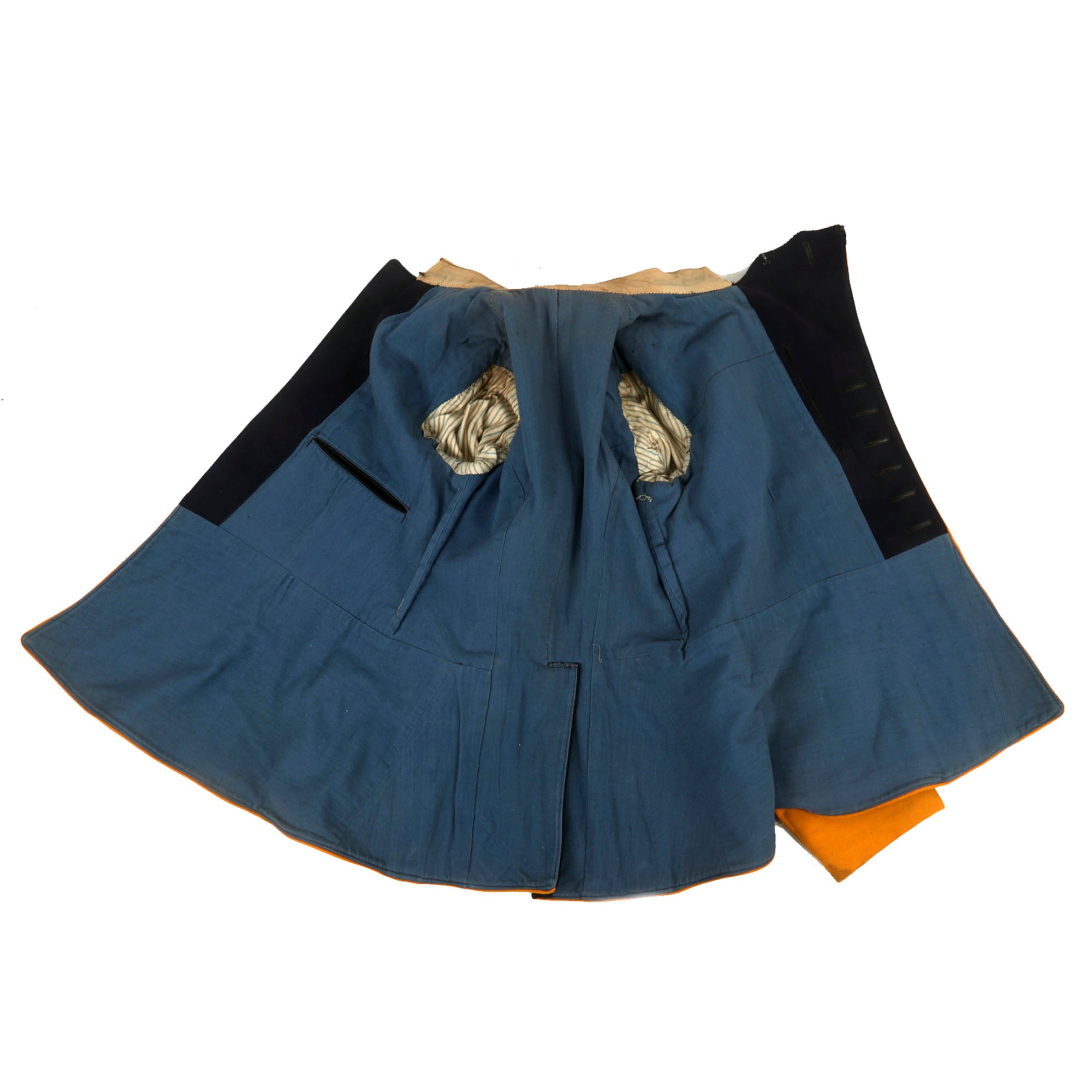 This Mannschaften (Other Ranks) Eigentumsstück (private purchase) Ulanka from Schleswig-Holsteinisches Ulanen-Regiment Number 15. The Ulanka is a dark blue doe-skin wool with Polish cuffs and lined in black silk. The facing color for Ulanen-Regt. Nr.15 was dark yellow and is reflected by the yellow collar, cuffs, epaulets, and yellow piping around the plastron front panel, bottom hem, and rear shoulder seams. Buttons were silver to match the fittings on the Tschapka. The condition of this Ulanka is very good. The back of the Ulanka shows a unique piping arrangement. Note that the shoulder seams, rear sleeve seams, and lower edge of the Ulanka are piped in yellow. All buttons are present, but there are no epaulettes, with the small straps to attach them still intact but weak.