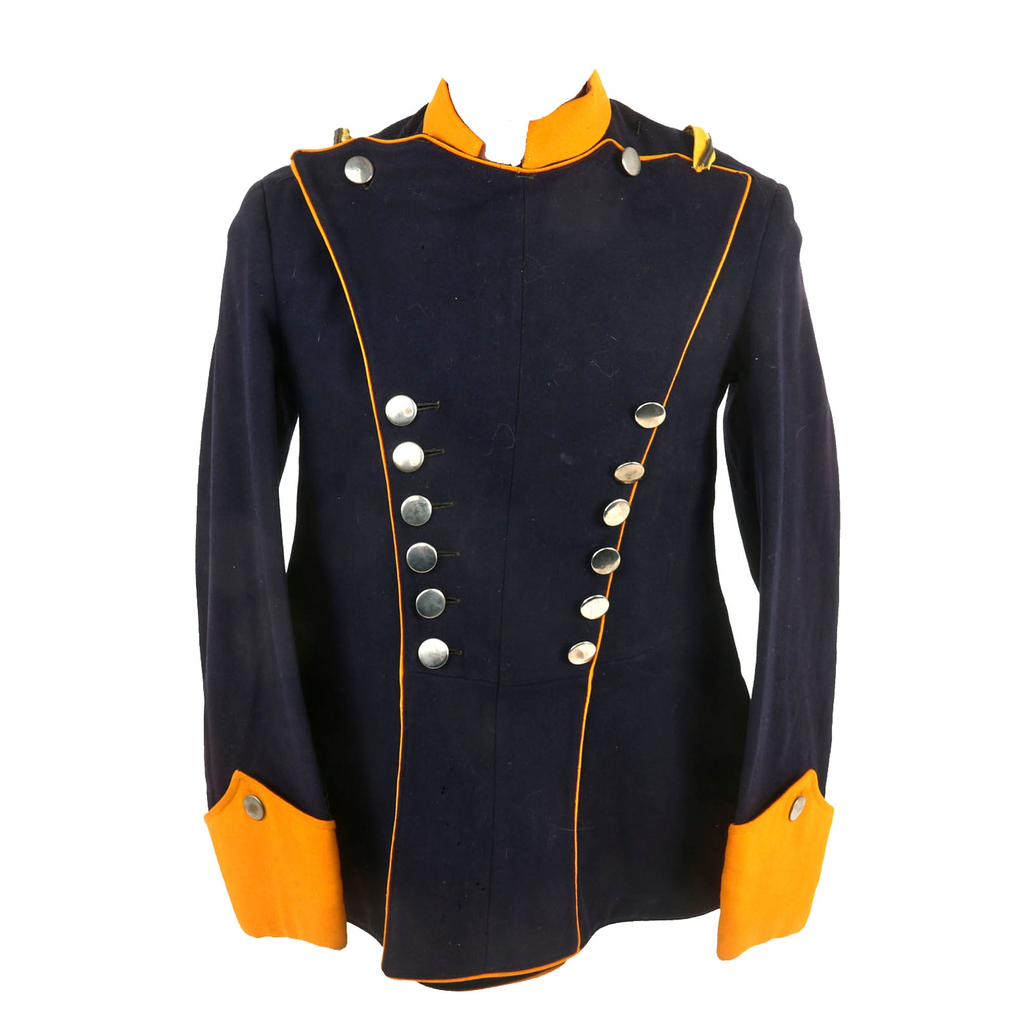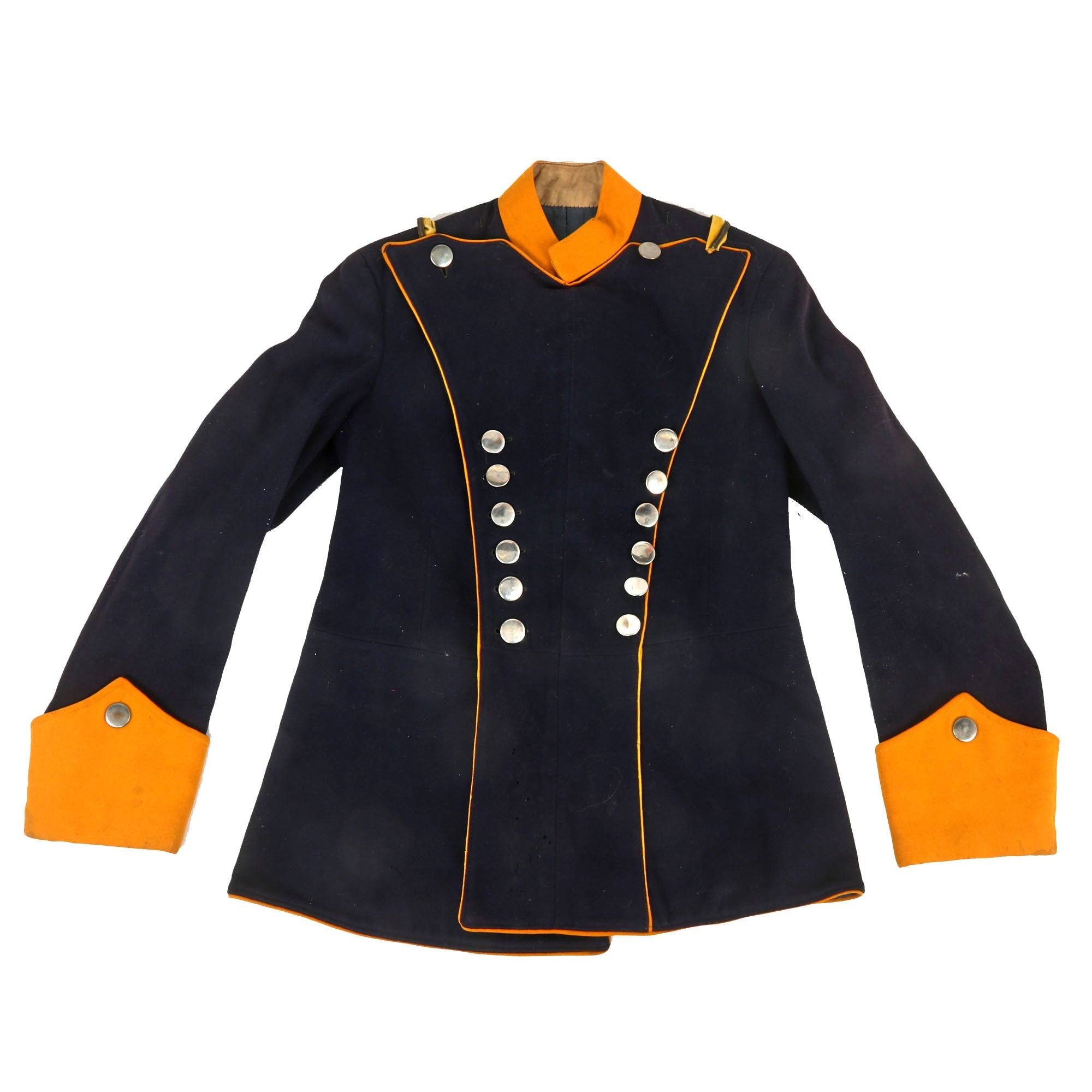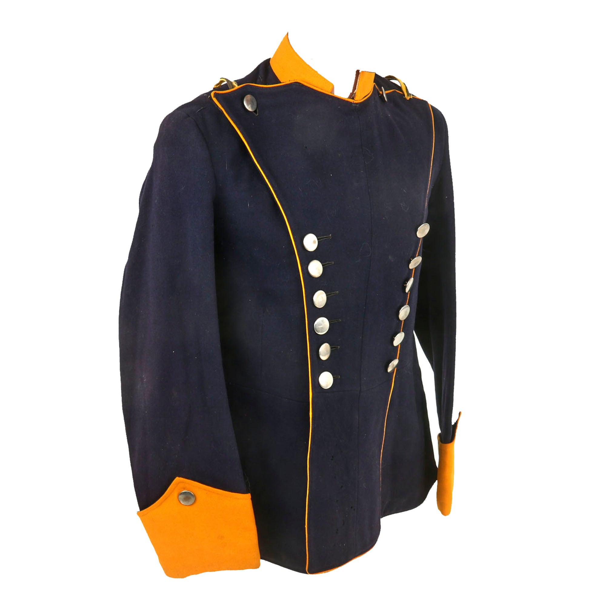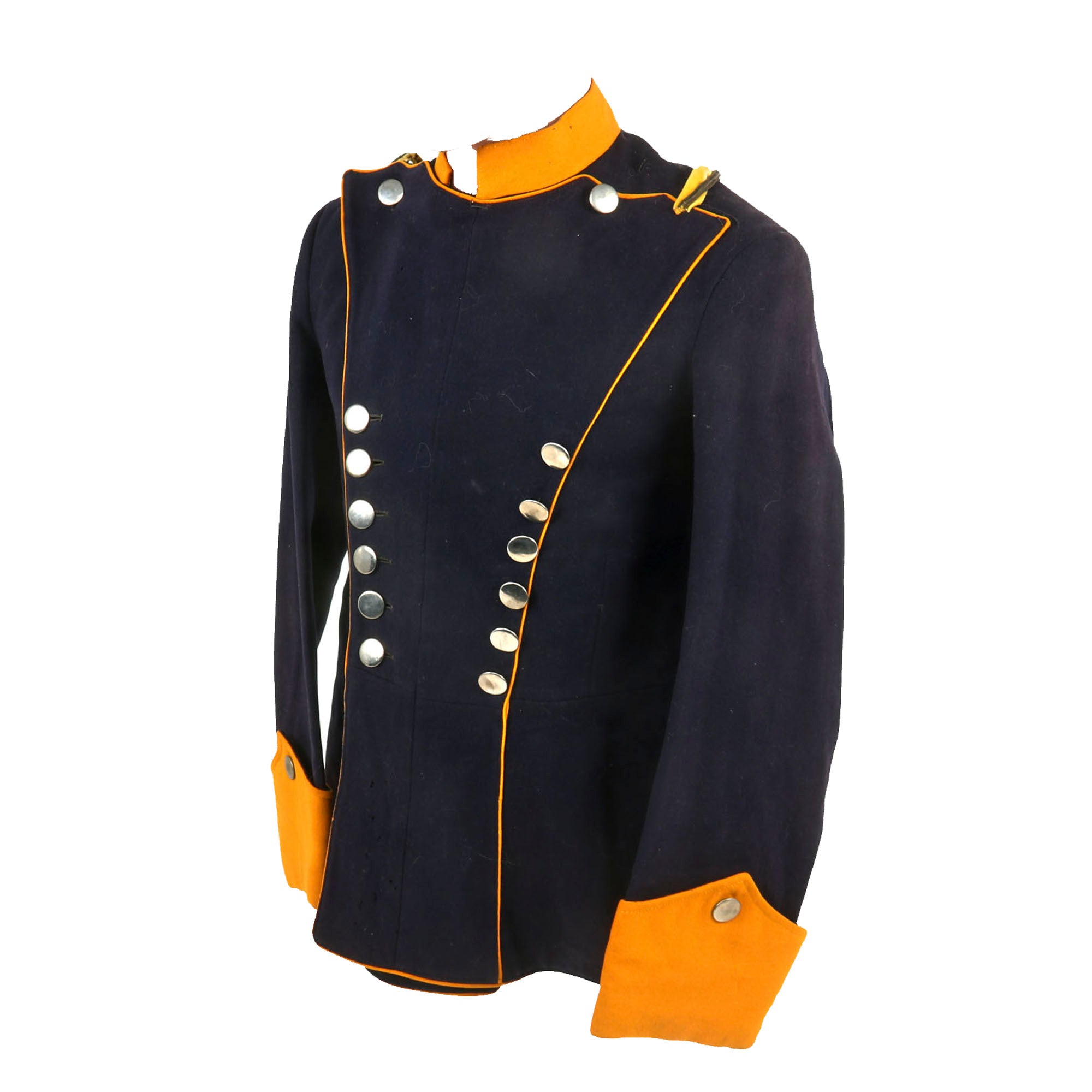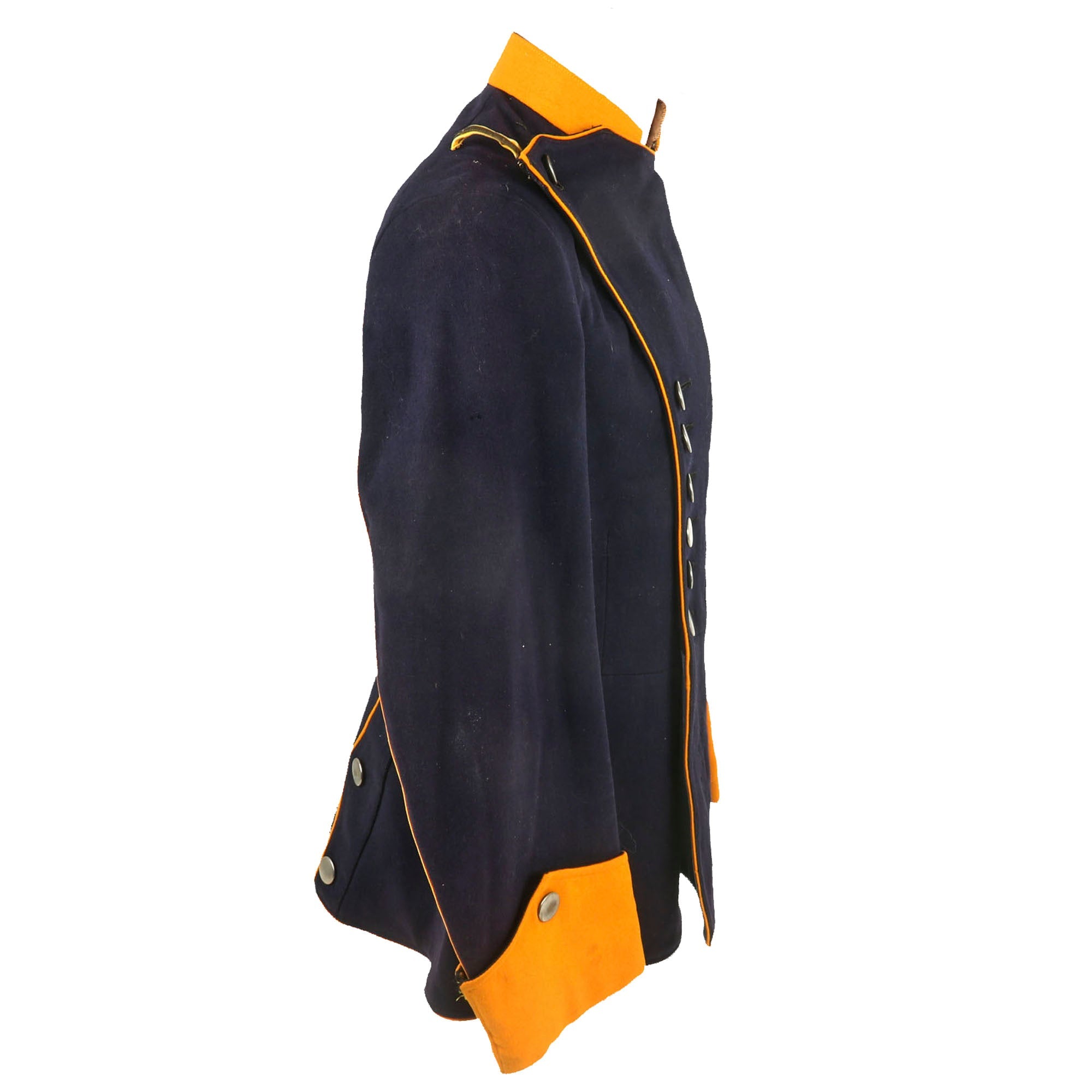 This Mannschaften (Other Ranks) Eigentumsstück (private purchase) Ulanka from Schleswig-Holsteinisches Ulanen-Regiment Number 15. The Ulanka is a dark blue doe-skin wool with Polish cuffs and lined in black silk. The facing color for Ulanen-Regt. Nr.15 was dark yellow and is reflected by the yellow collar, cuffs, epaulets, and yellow piping around the plastron front panel, bottom hem, and rear shoulder seams. Buttons were silver to match the fittings on the Tschapka. The condition of this Ulanka is very good. The back of the Ulanka shows a unique piping arrangement. Note that the shoulder seams, rear sleeve seams, and lower edge of the Ulanka are piped in yellow. All buttons are present, but there are no epaulettes, with the small straps to attach them still intact but weak.