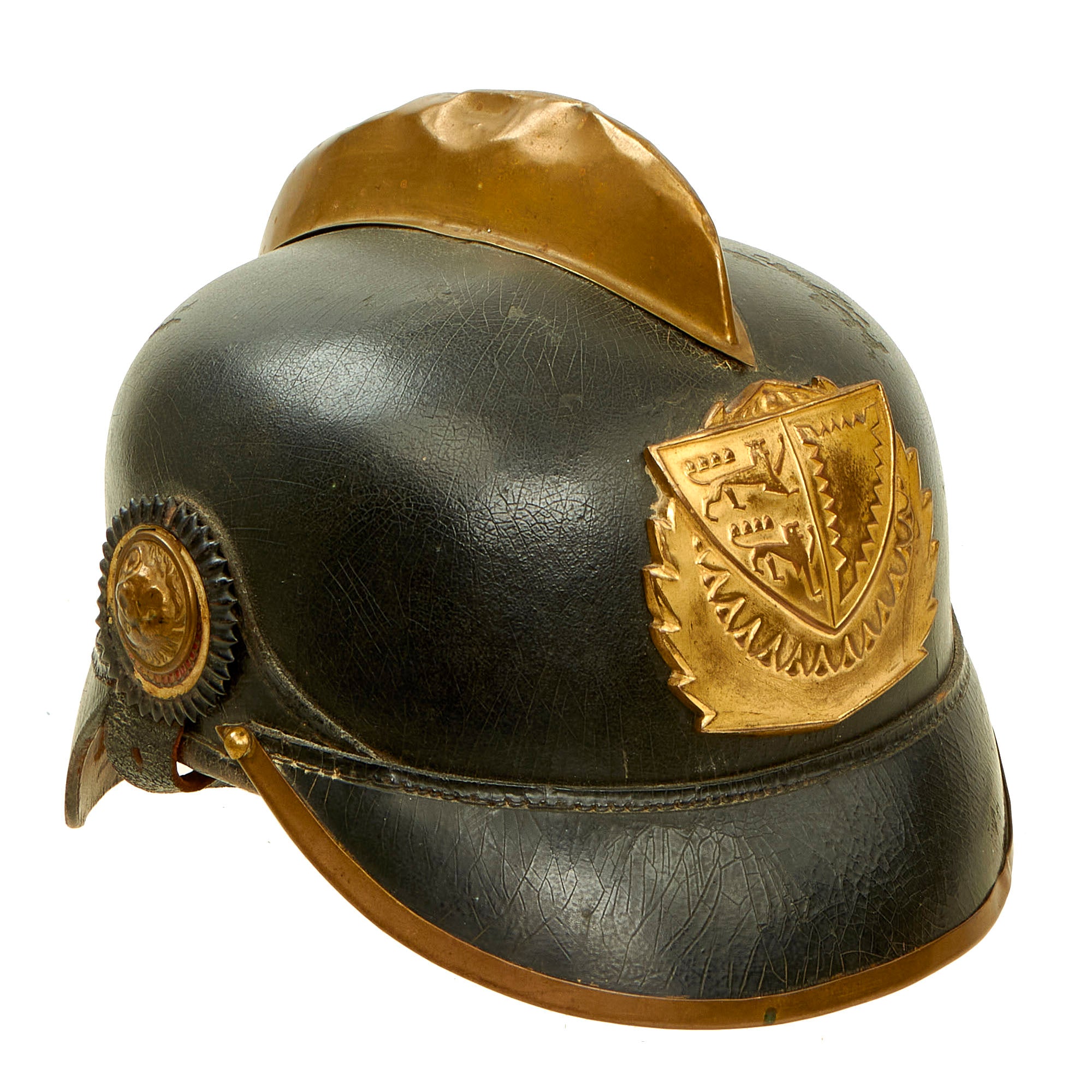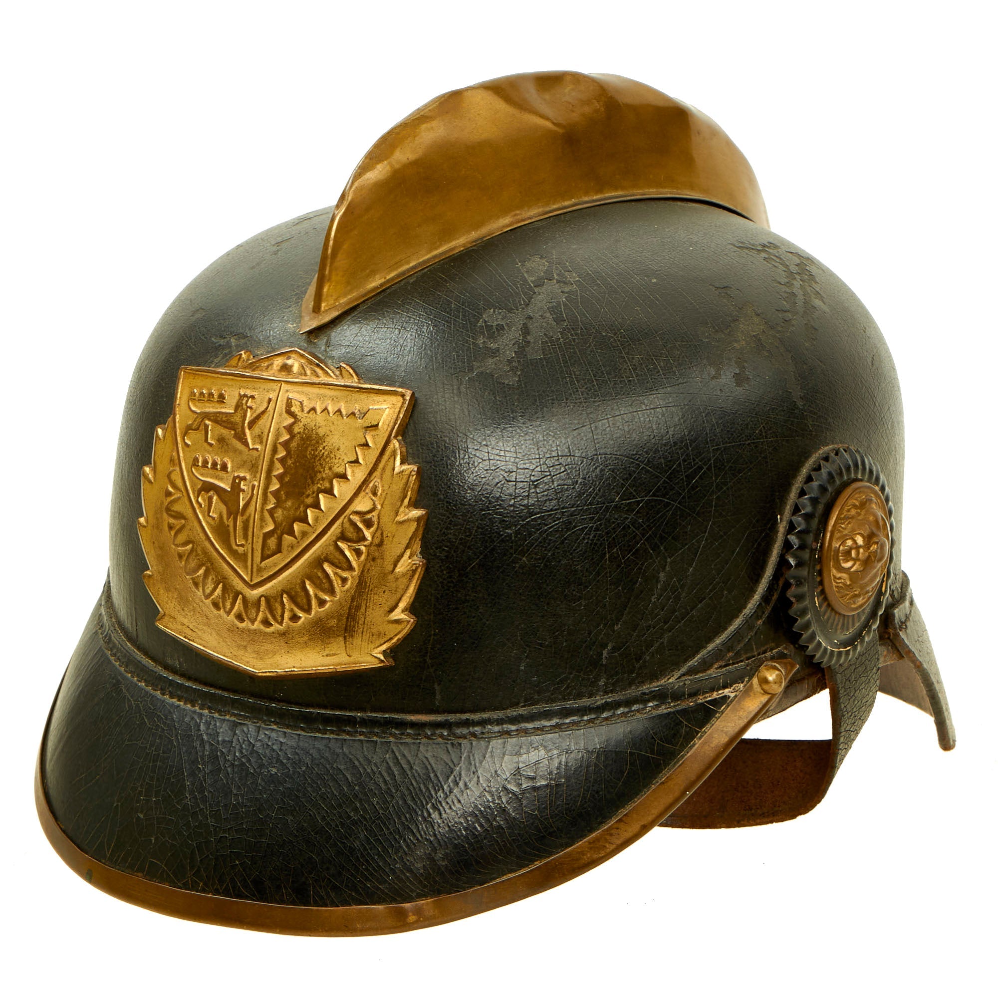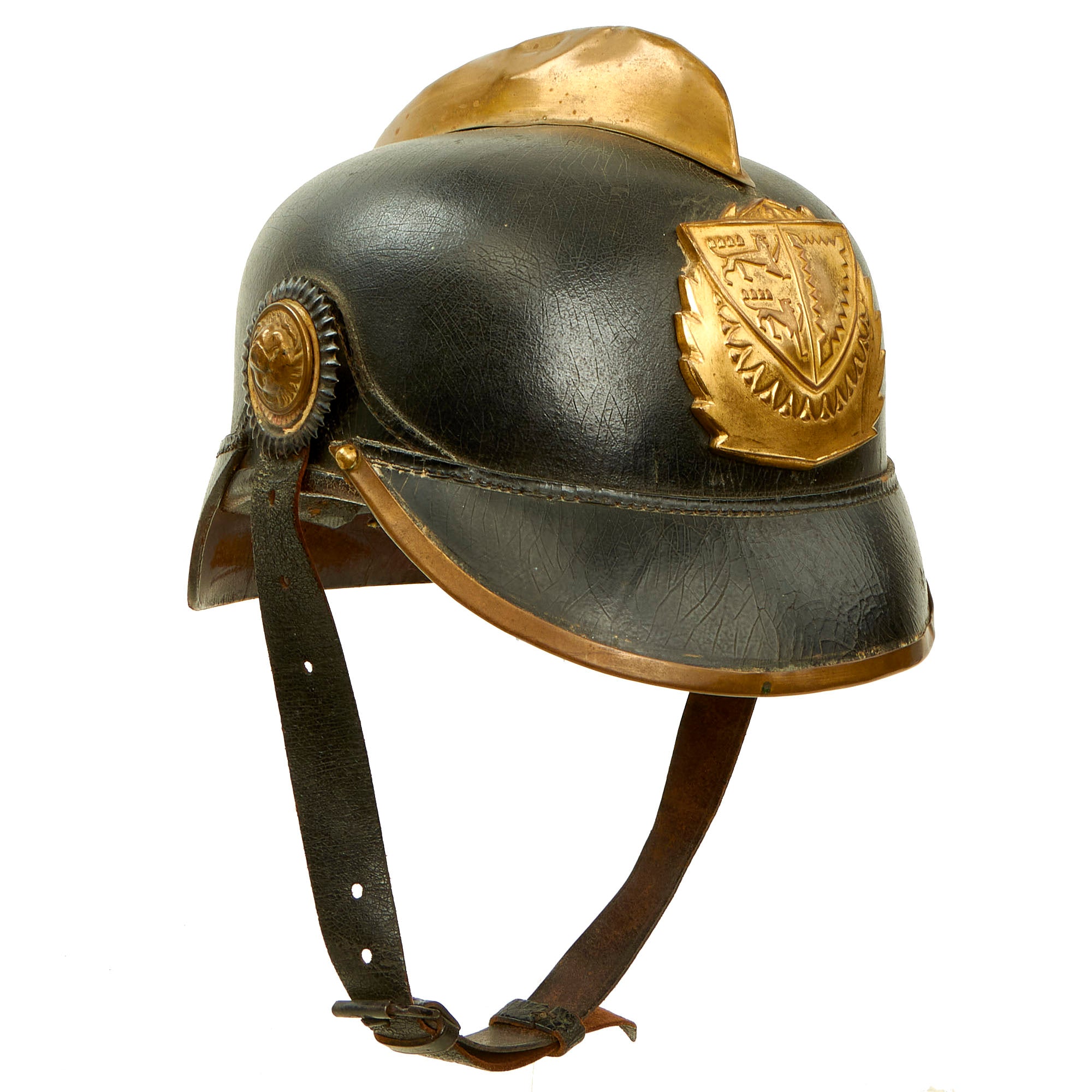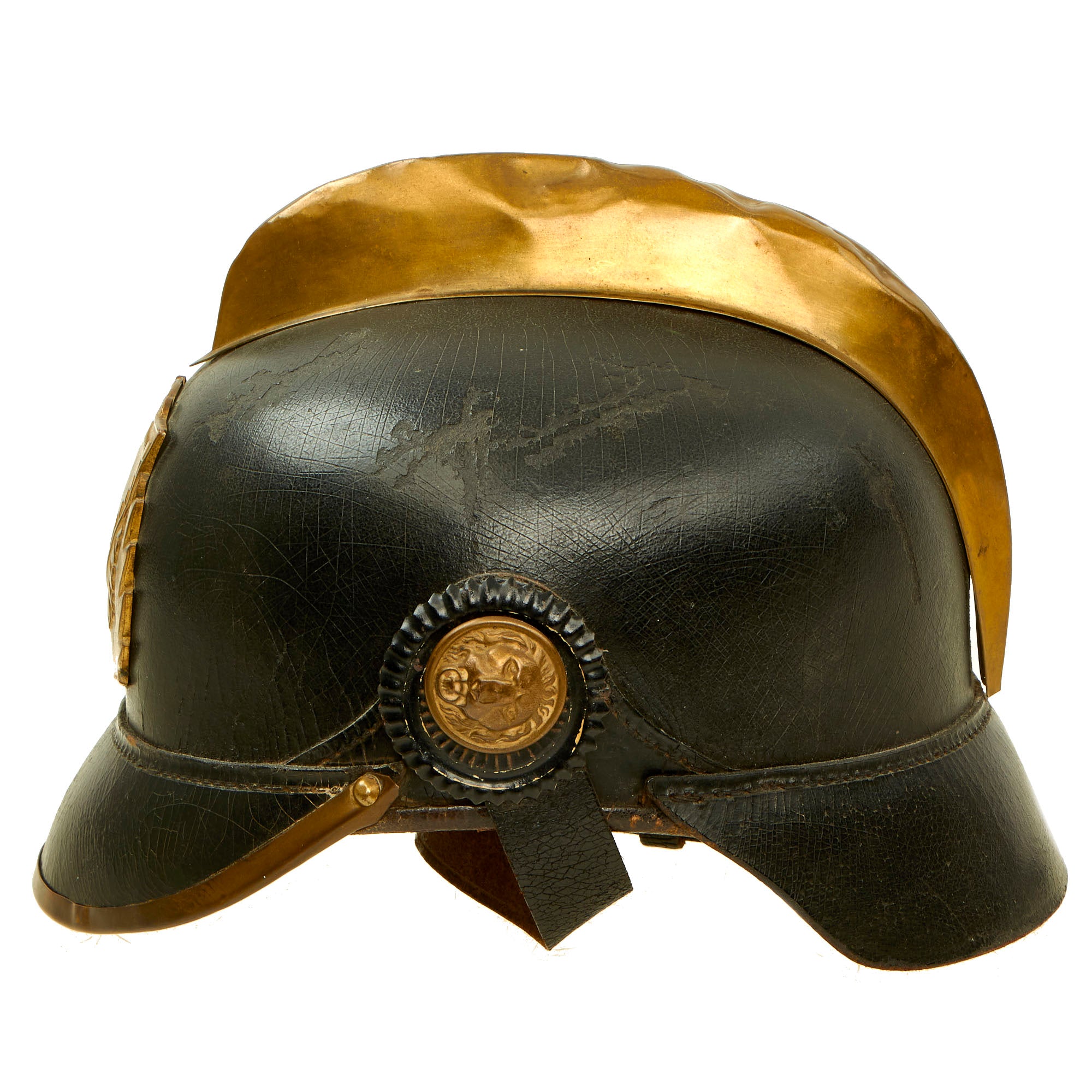 Original Item: Only One Available. This is a very good condition, turn of the century pickelhaube-style German Fire helmet, with a boiled leather body, brass front plate (wappen), brass central comb, and brass fittings. Central plate has a shield featuring the Coat of Arms for the German state of Schleswig-Holstein. Contrary to the hopes of German Schleswig-Holsteiners, the area did not gain its independence, but was annexed as a province of Prussia in 1867. Also following the Austro-Prussian War in 1866, section five of the Peace of Prague stipulated that the people of Northern Schleswig would be consulted in a referendum on whether to remain under Prussian rule or return to Danish rule. This condition, however, was never fulfilled by Prussia. During the decades of Prussian rule within the German Empire, authorities attempted a Germanisation policy in the northern part of Schleswig, which remained predominantly Danish. The period also meant increased industrialization of Schleswig-Holstein and the use of Kiel and Flensburg as important Imperial German Navy locations. The northernmost part and west coast of the province saw a wave of emigration to America, while some Danes of North Schleswig emigrated to Denmark.
