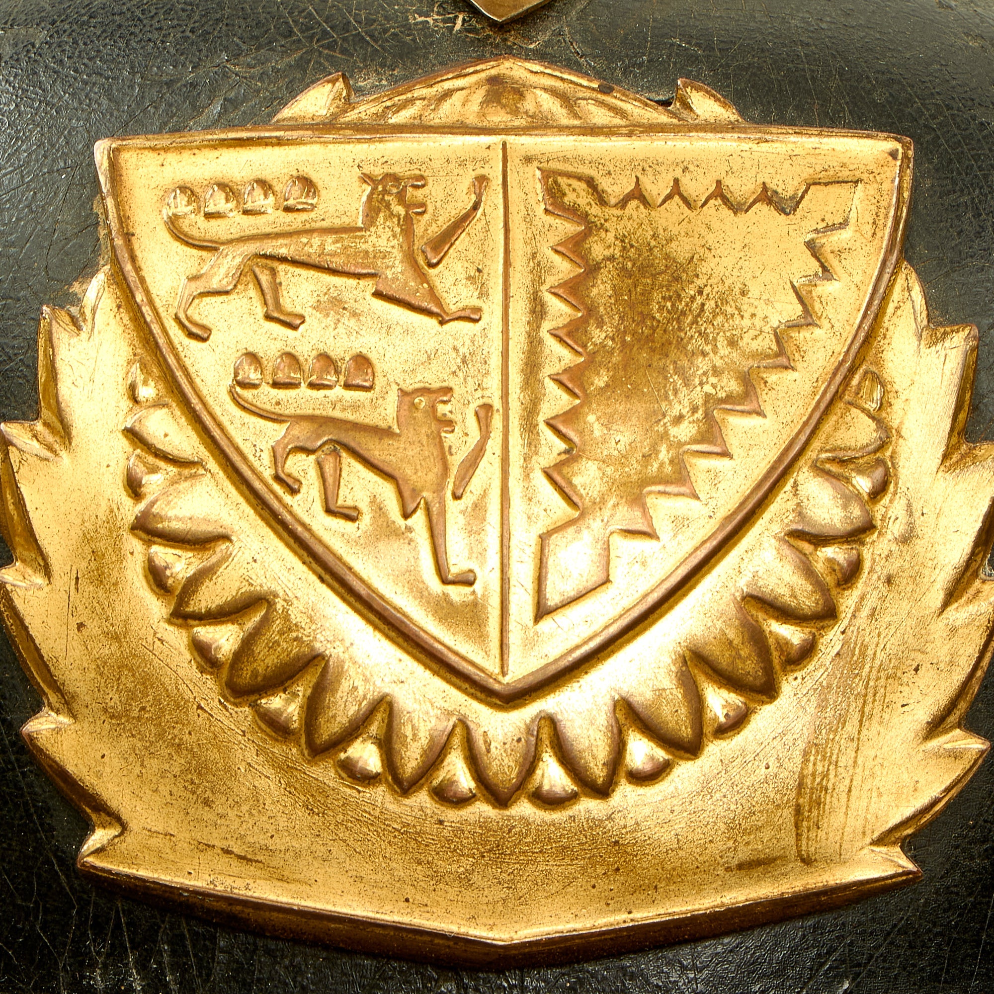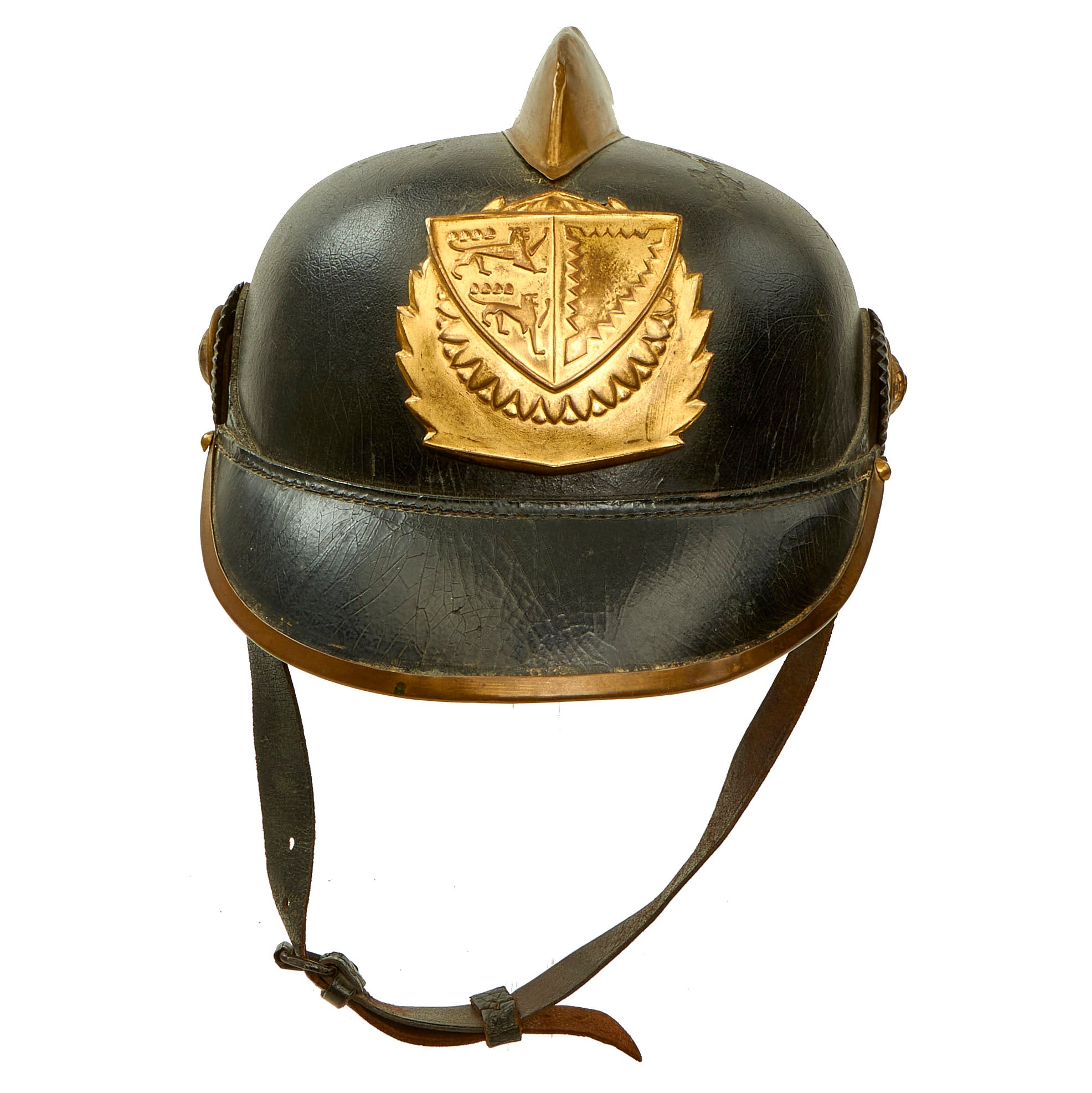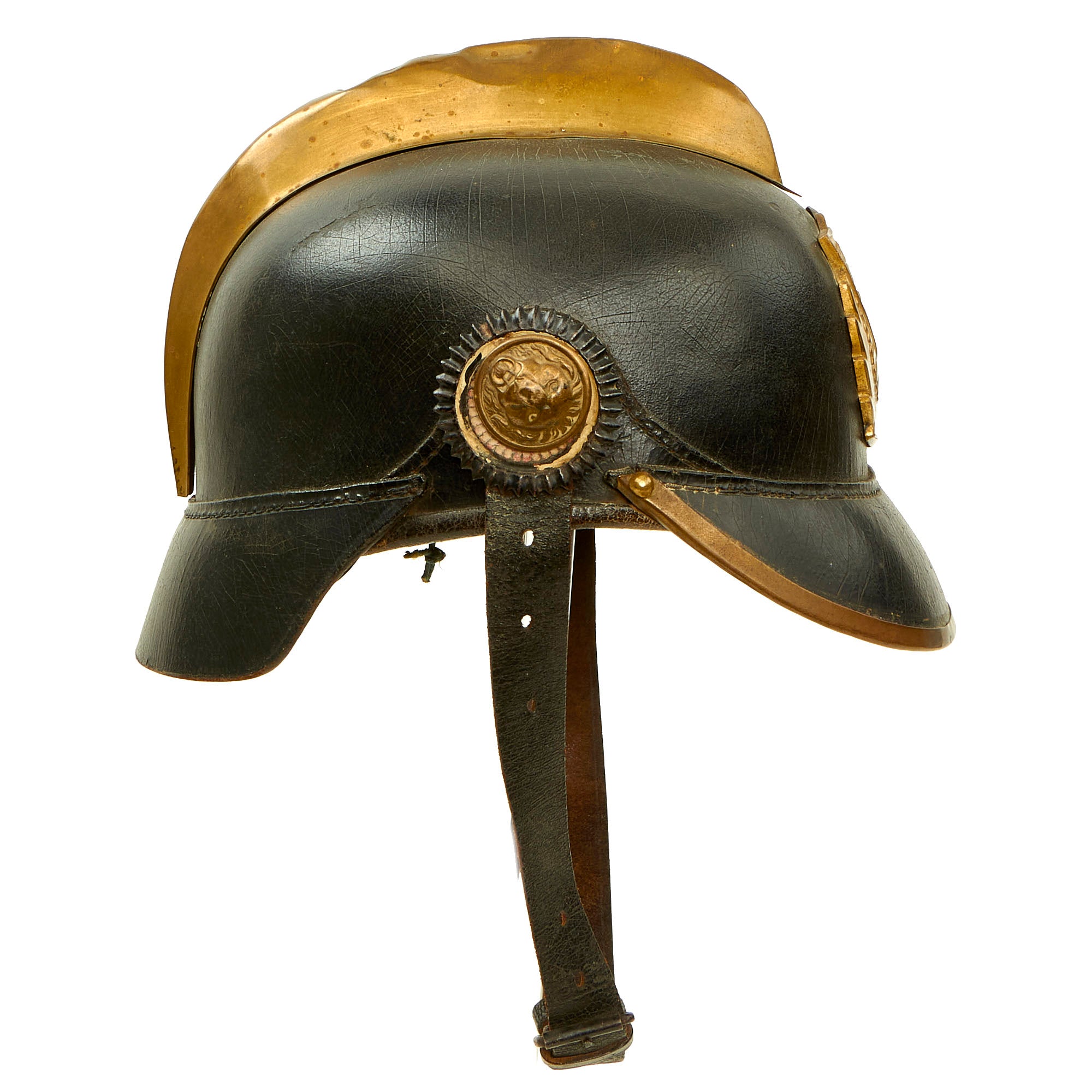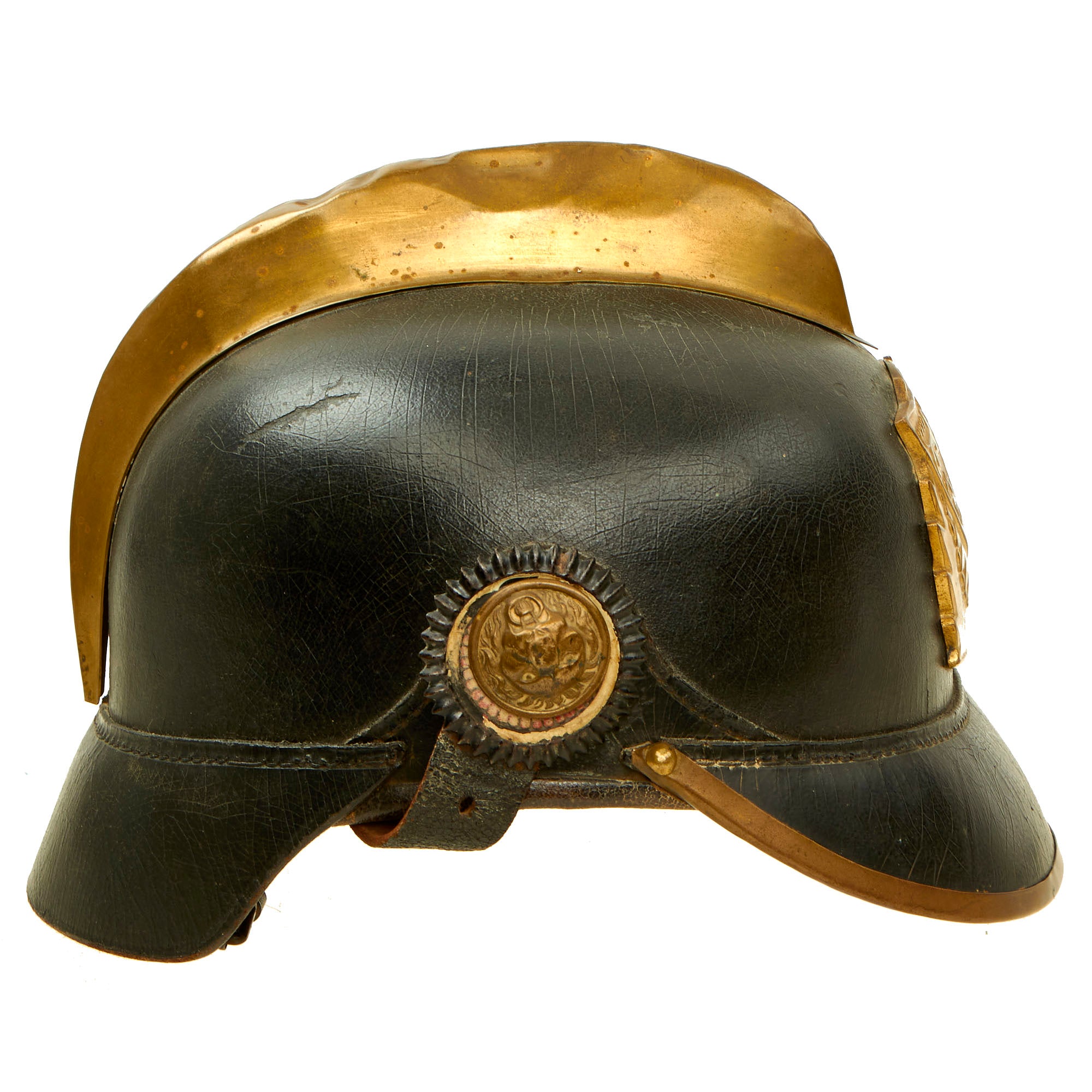 Original Item: Only One Available. This is a very good condition, turn of the century pickelhaube-style German Fire helmet, with a boiled leather body, brass front plate (wappen), brass central comb, and brass fittings. Central plate has a shield featuring the Coat of Arms for the German state of Schleswig-Holstein. Contrary to the hopes of German Schleswig-Holsteiners, the area did not gain its independence, but was annexed as a province of Prussia in 1867. Also following the Austro-Prussian War in 1866, section five of the Peace of Prague stipulated that the people of Northern Schleswig would be consulted in a referendum on whether to remain under Prussian rule or return to Danish rule. This condition, however, was never fulfilled by Prussia. During the decades of Prussian rule within the German Empire, authorities attempted a Germanisation policy in the northern part of Schleswig, which remained predominantly Danish. The period also meant increased industrialization of Schleswig-Holstein and the use of Kiel and Flensburg as important Imperial German Navy locations. The northernmost part and west coast of the province saw a wave of emigration to America, while some Danes of North Schleswig emigrated to Denmark.