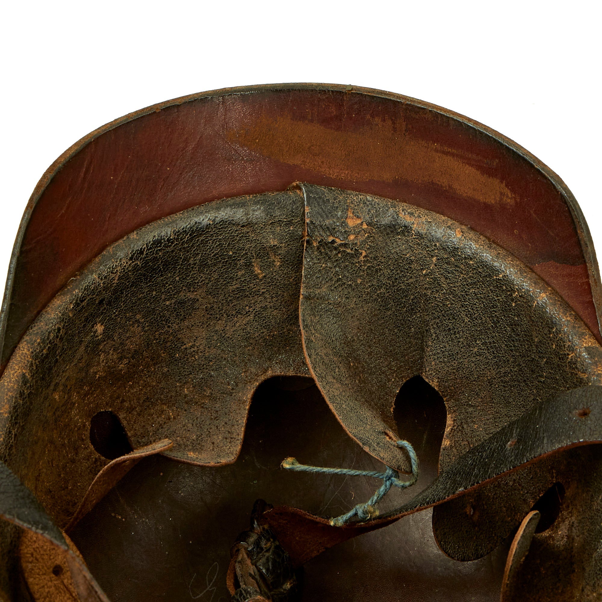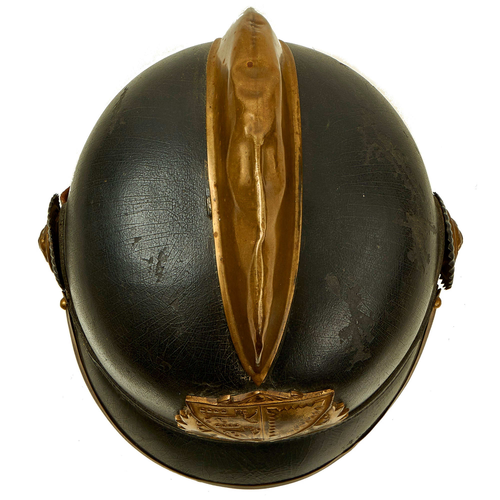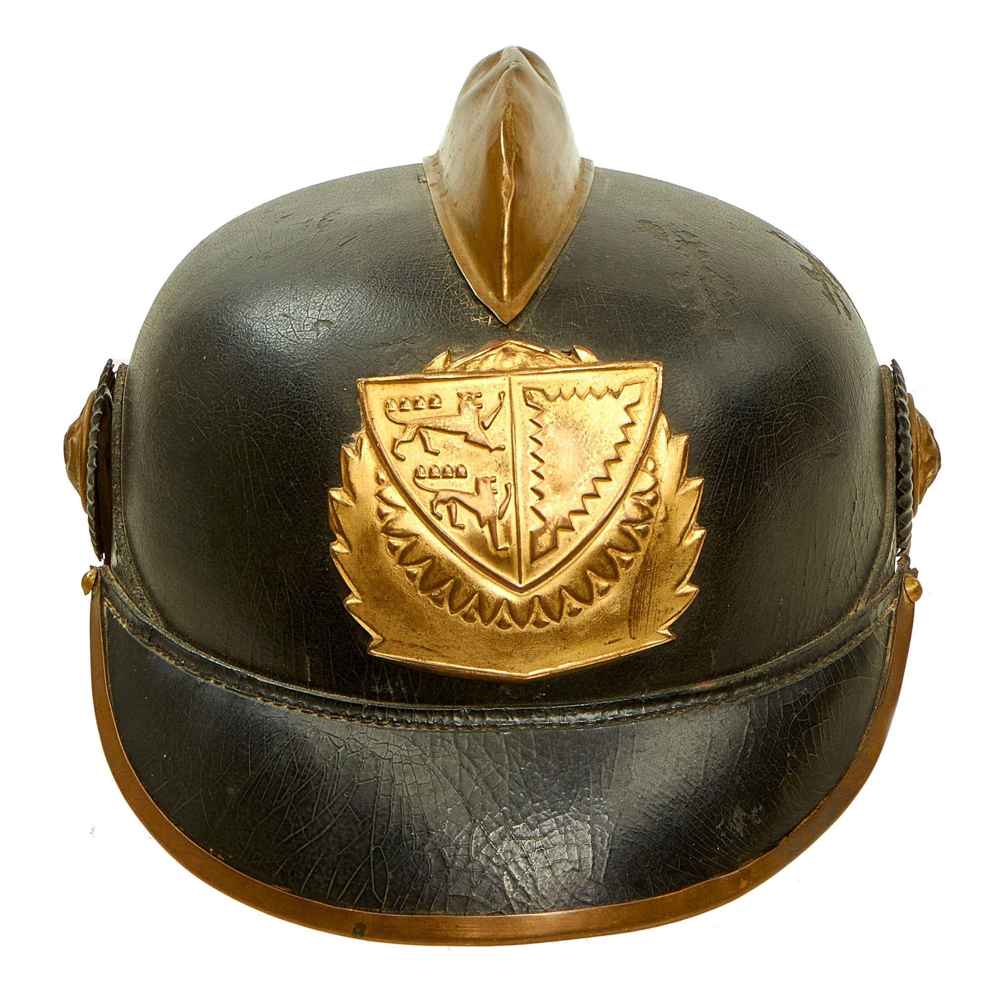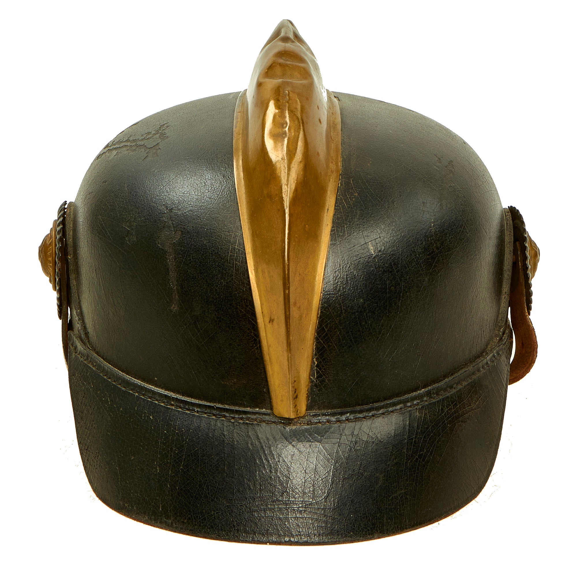 Original Item: Only One Available. This is a very good condition, turn of the century pickelhaube-style German Fire helmet, with a boiled leather body, brass front plate (wappen), brass central comb, and brass fittings. Central plate has a shield featuring the Coat of Arms for the German state of Schleswig-Holstein. Contrary to the hopes of German Schleswig-Holsteiners, the area did not gain its independence, but was annexed as a province of Prussia in 1867. Also following the Austro-Prussian War in 1866, section five of the Peace of Prague stipulated that the people of Northern Schleswig would be consulted in a referendum on whether to remain under Prussian rule or return to Danish rule. This condition, however, was never fulfilled by Prussia. During the decades of Prussian rule within the German Empire, authorities attempted a Germanisation policy in the northern part of Schleswig, which remained predominantly Danish. The period also meant increased industrialization of Schleswig-Holstein and the use of Kiel and Flensburg as important Imperial German Navy locations. The northernmost part and west coast of the province saw a wave of emigration to America, while some Danes of North Schleswig emigrated to Denmark.