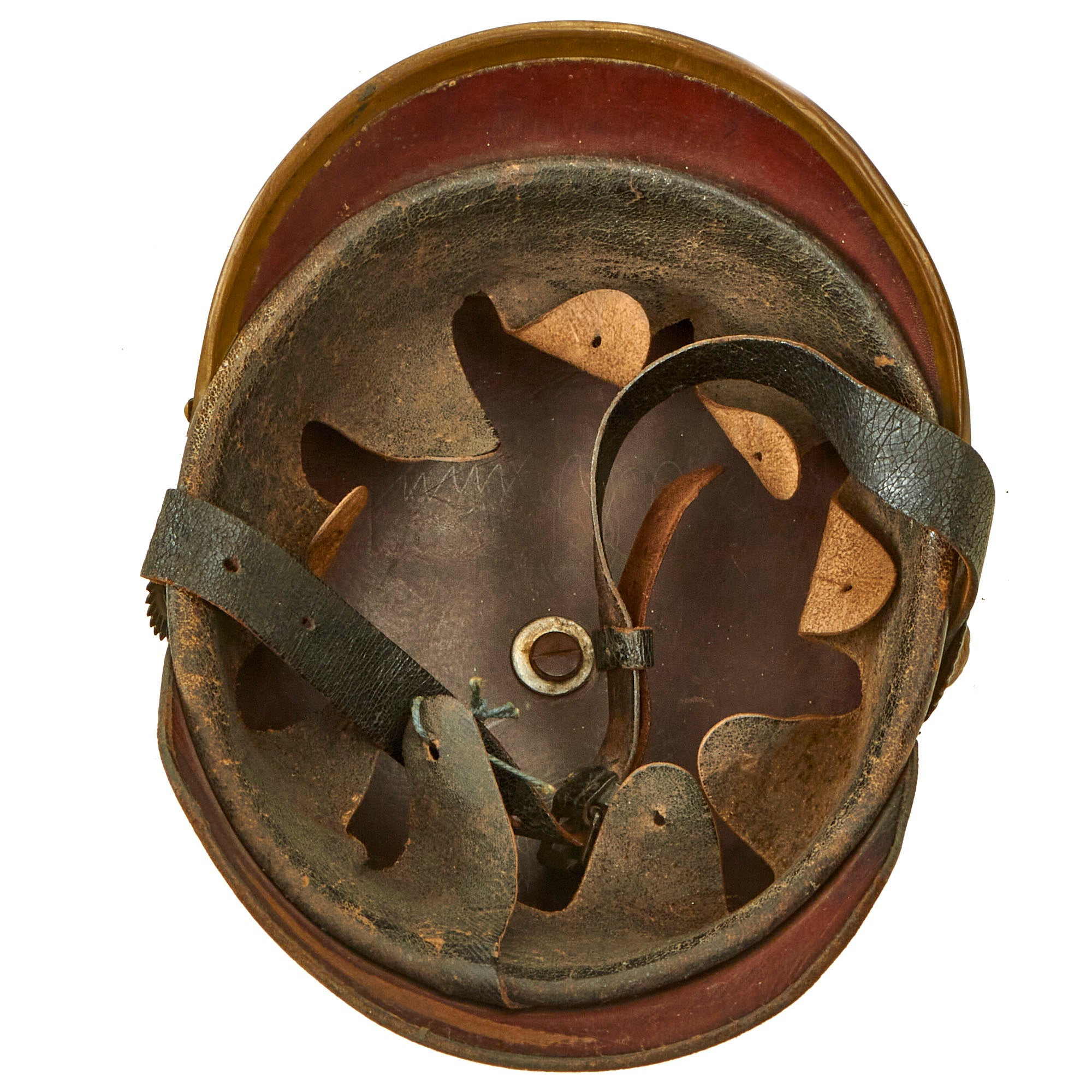 Condition overall is very good, and this configuration was typical of the 1890-1910 period. Interior crown has two original comb anchors secured under the bolts for the top comb. There are no other markings inside the helmet.