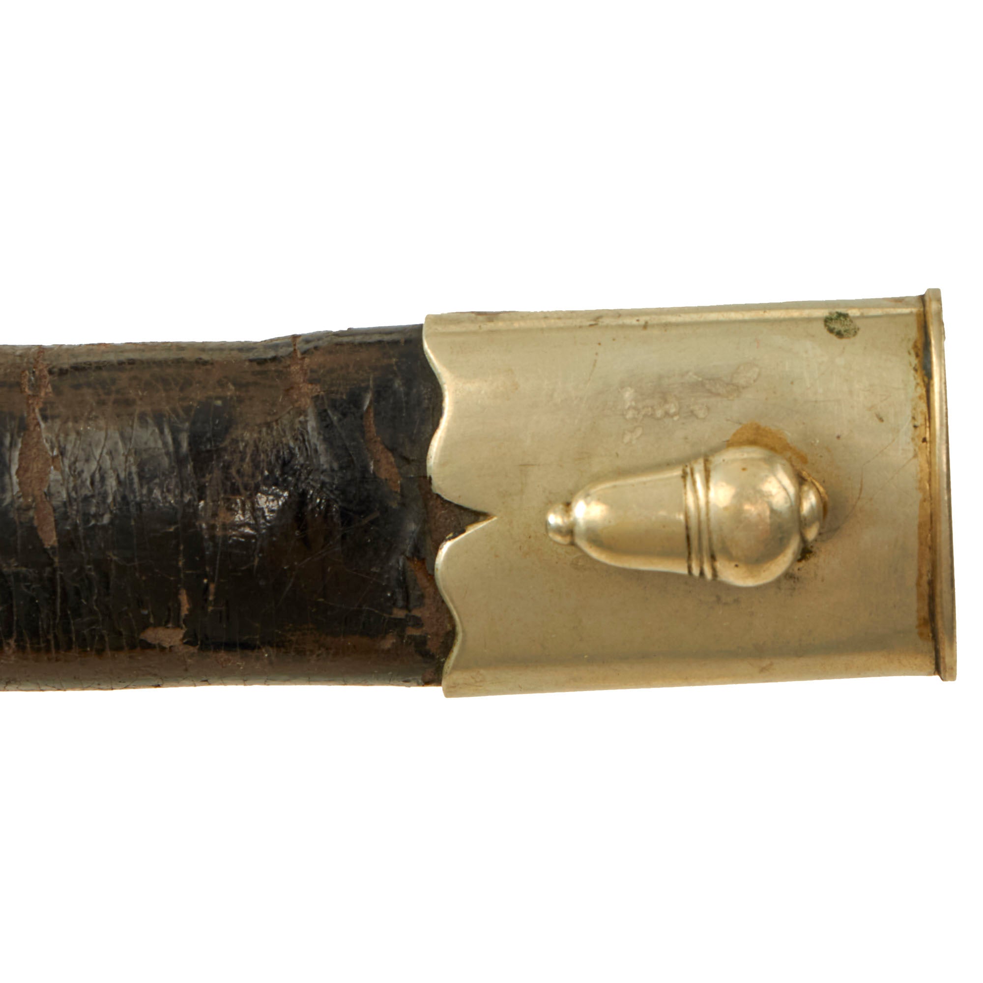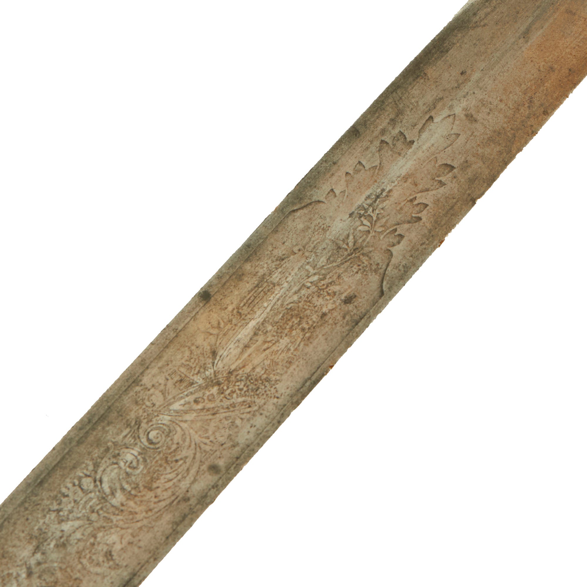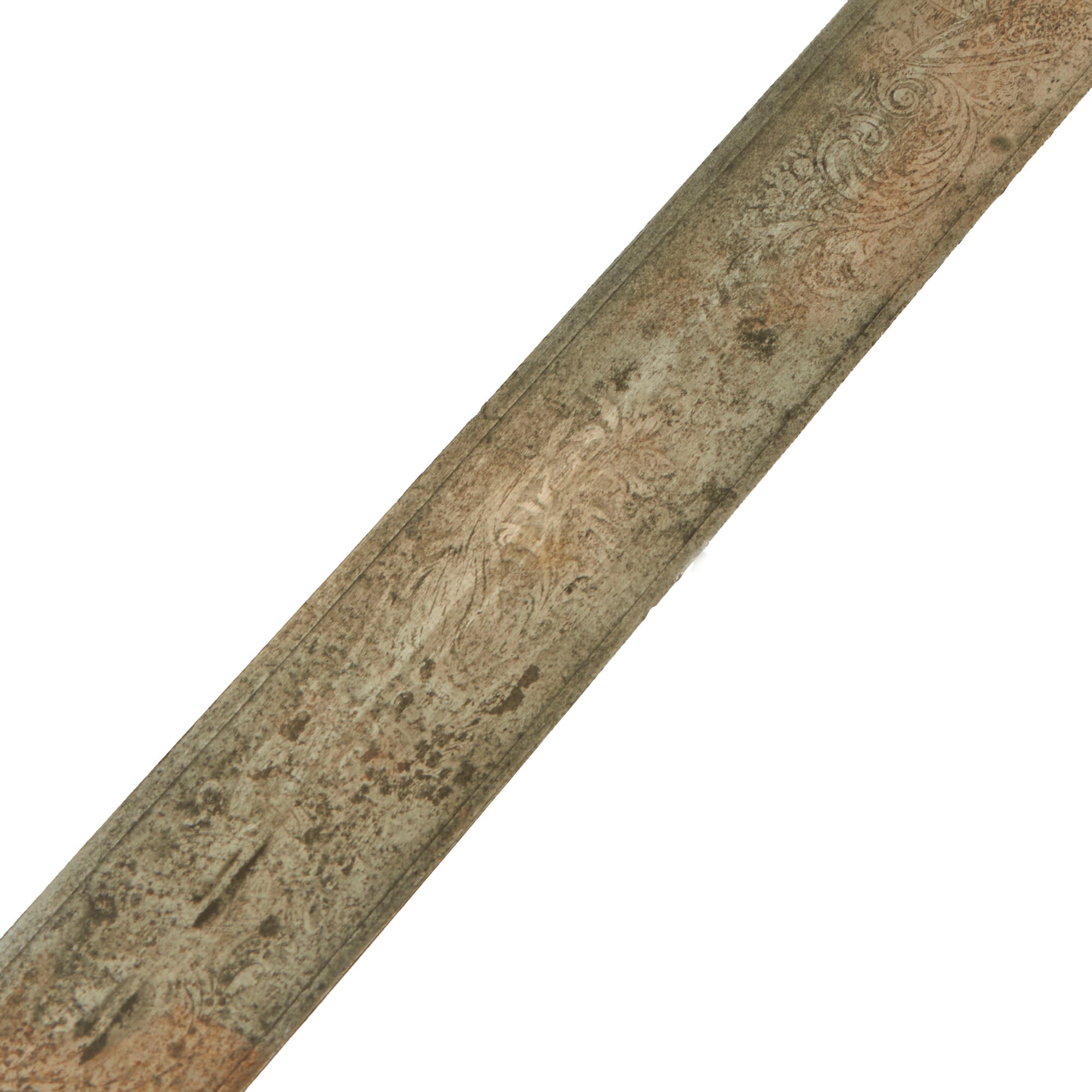 The 17¾” scabbard is actually smaller than the blade, but this could be due to leather shrinkage. The more likely answer is that the blade and scabbard were cut down at one point. The frog knot of the scabbard is acorn-shaped, and the leather shows heavy damage with loss of stitching.