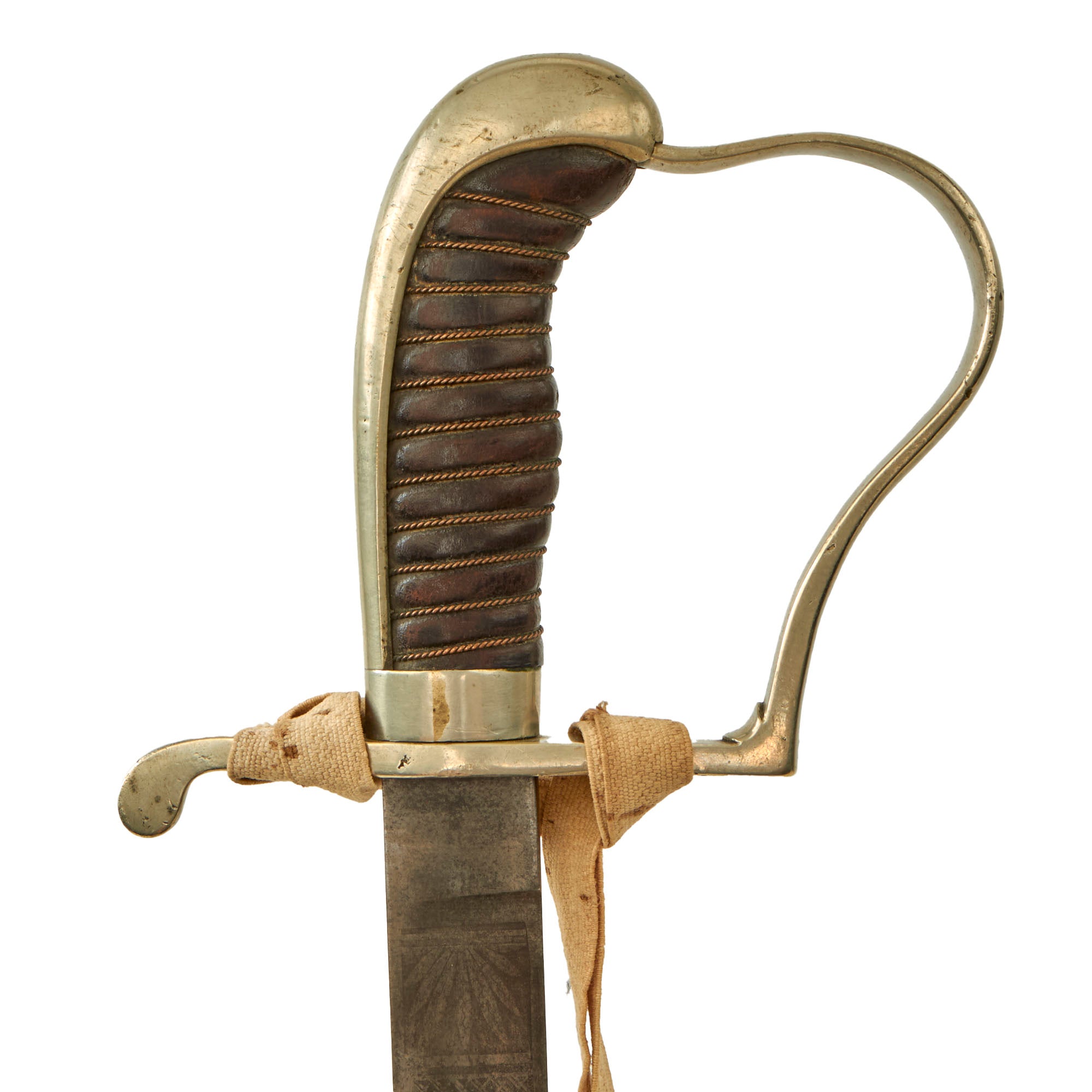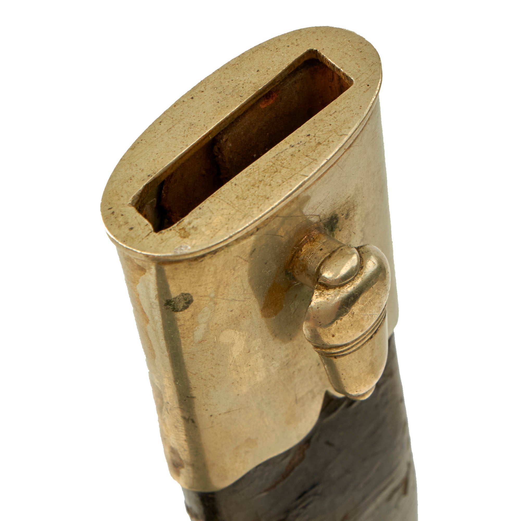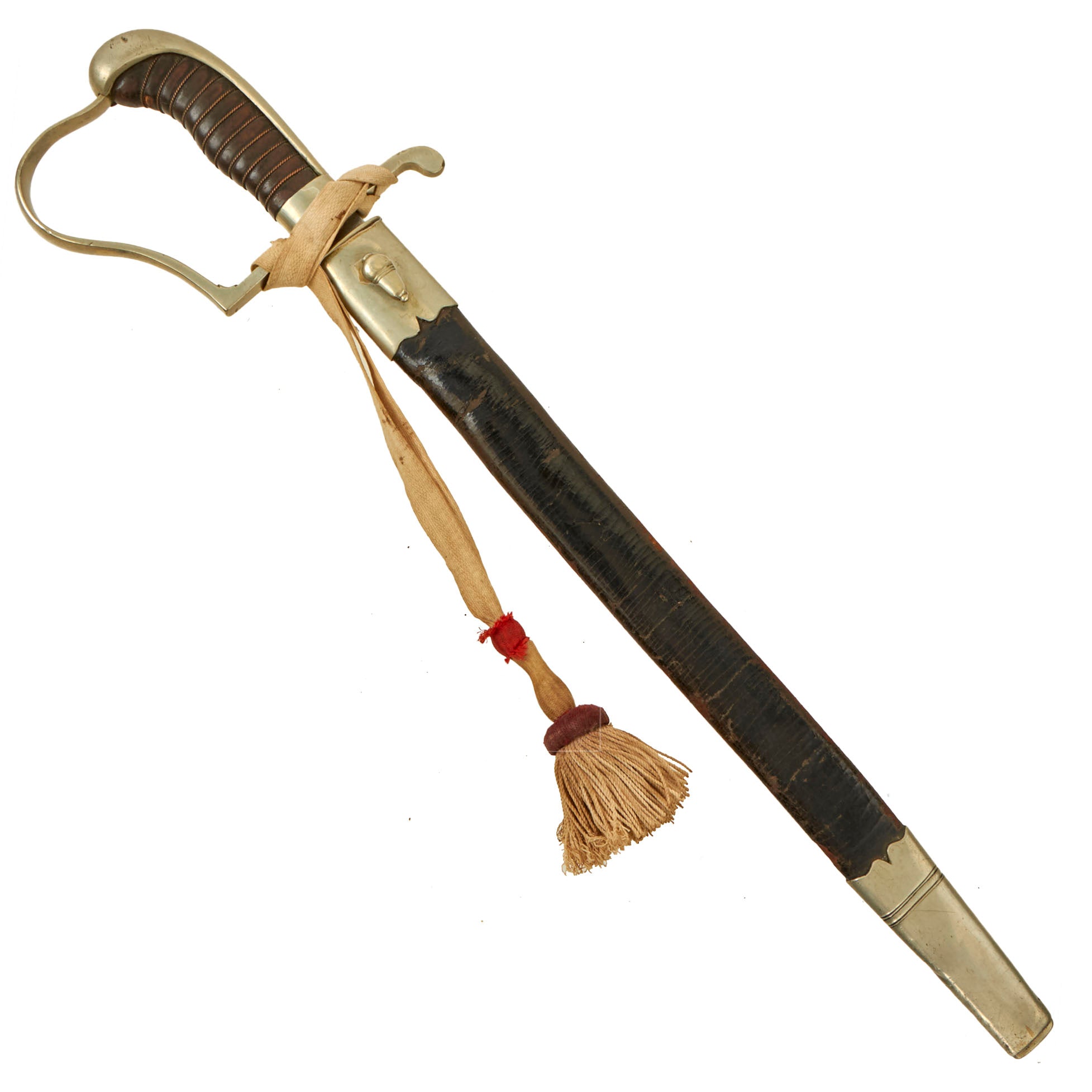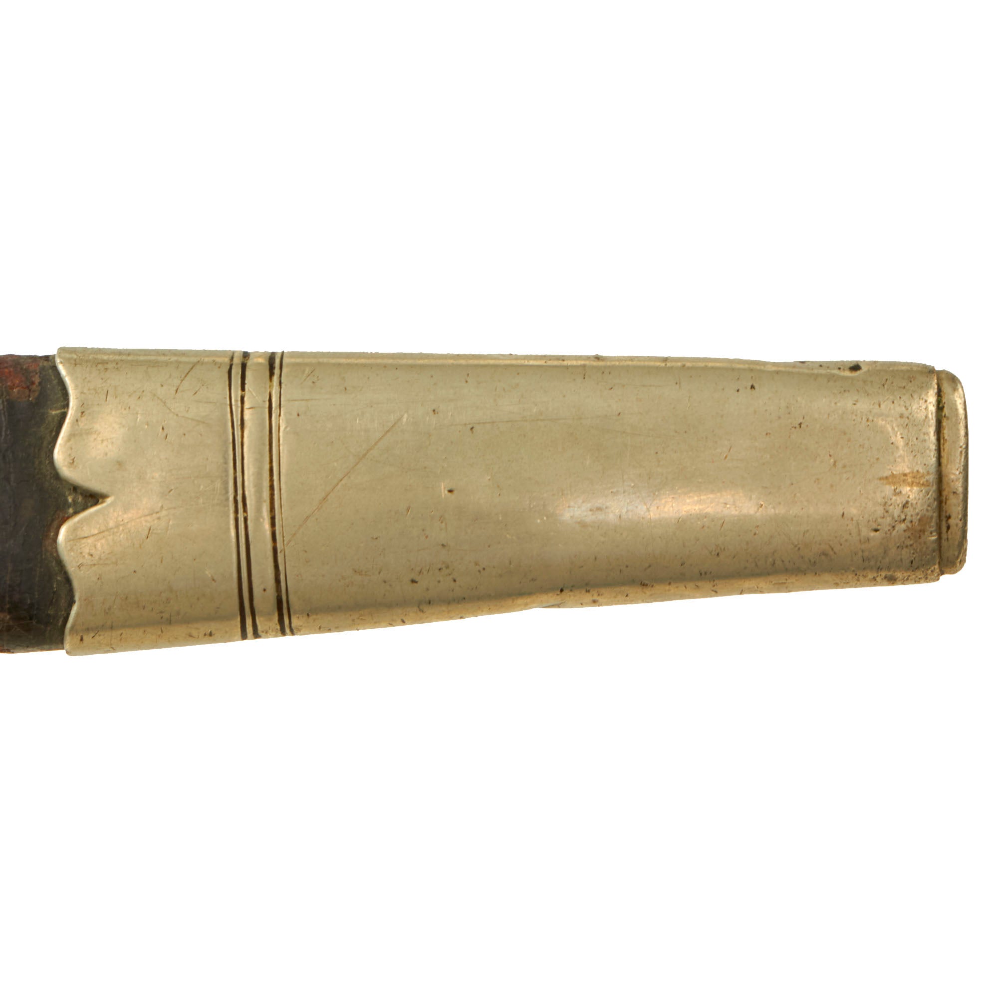 The 17¾” scabbard is actually smaller than the blade, but this could be due to leather shrinkage. The more likely answer is that the blade and scabbard were cut down at one point. The frog knot of the scabbard is acorn-shaped, and the leather shows heavy damage with loss of stitching.