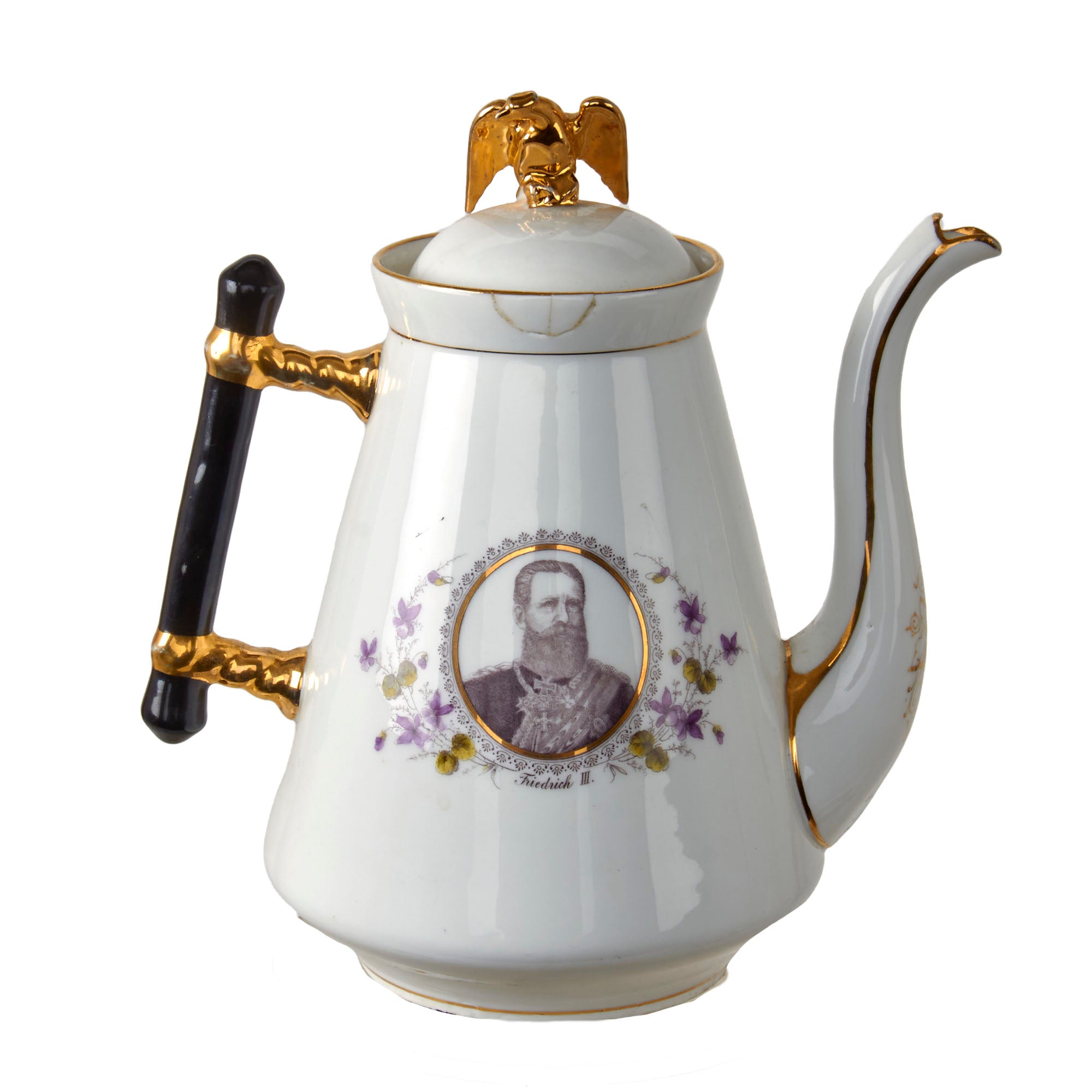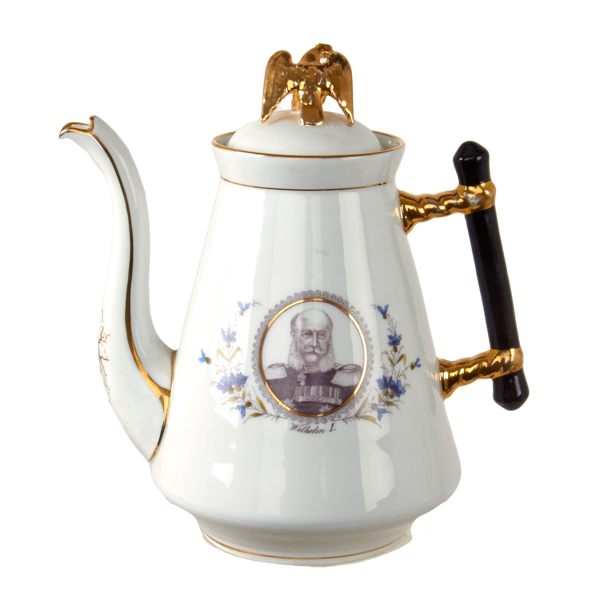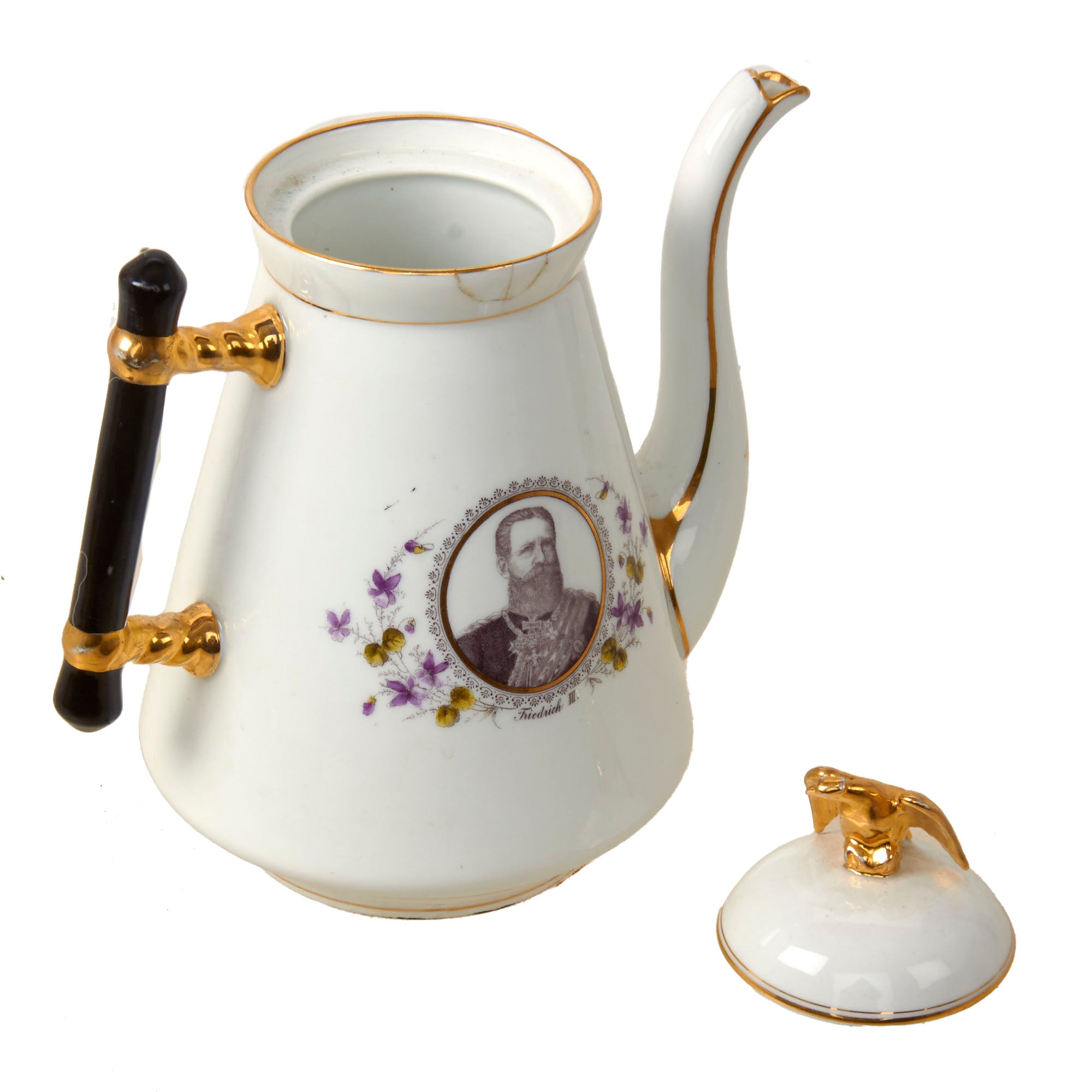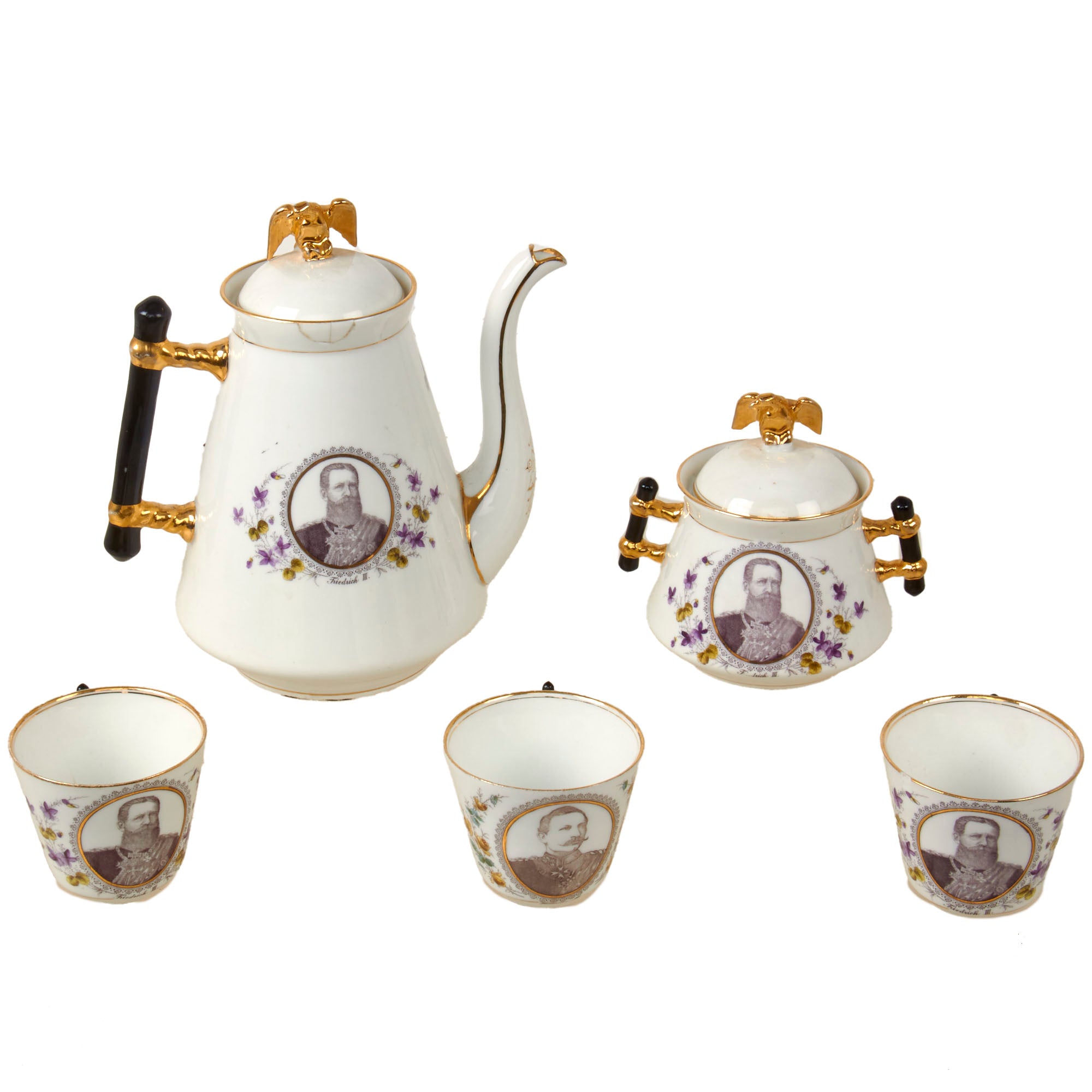 Original Items. Only One Set Available. This is an outstanding Imperial German tea set consisting of a porcelain teapot, sugar bowl, and three teacups depicting Wilhelm I, Friedrich III, and Wilhelm II. There are some minor chips and a repair in the teapot, but for a set that dates to the late 1890s - early 1900s, it has held up incredibly well. Both the lid of the teapot and sugar bowl have a gorgeous gold-painted Imperial Eagle at the top.