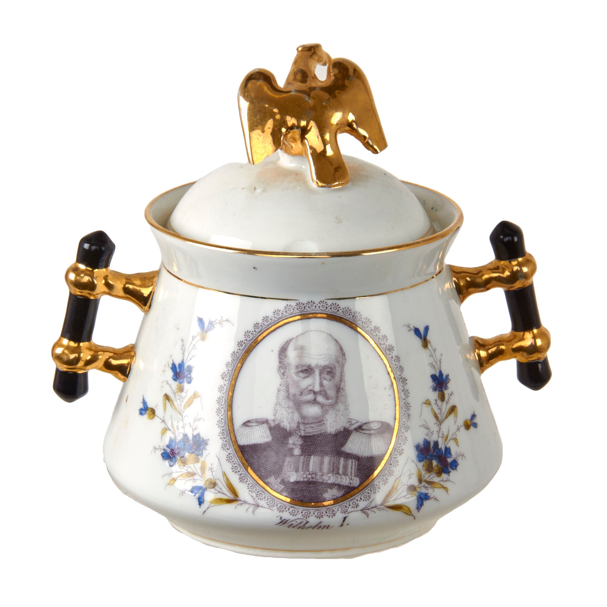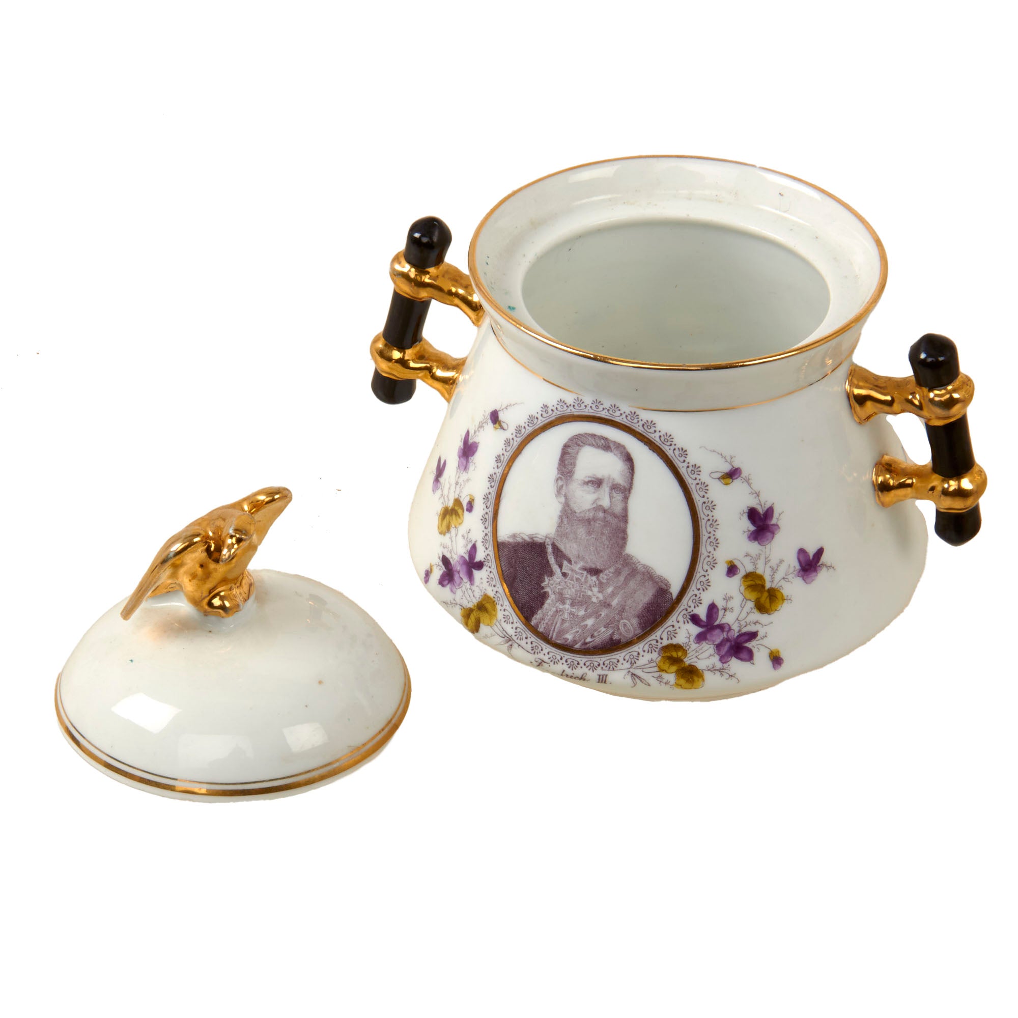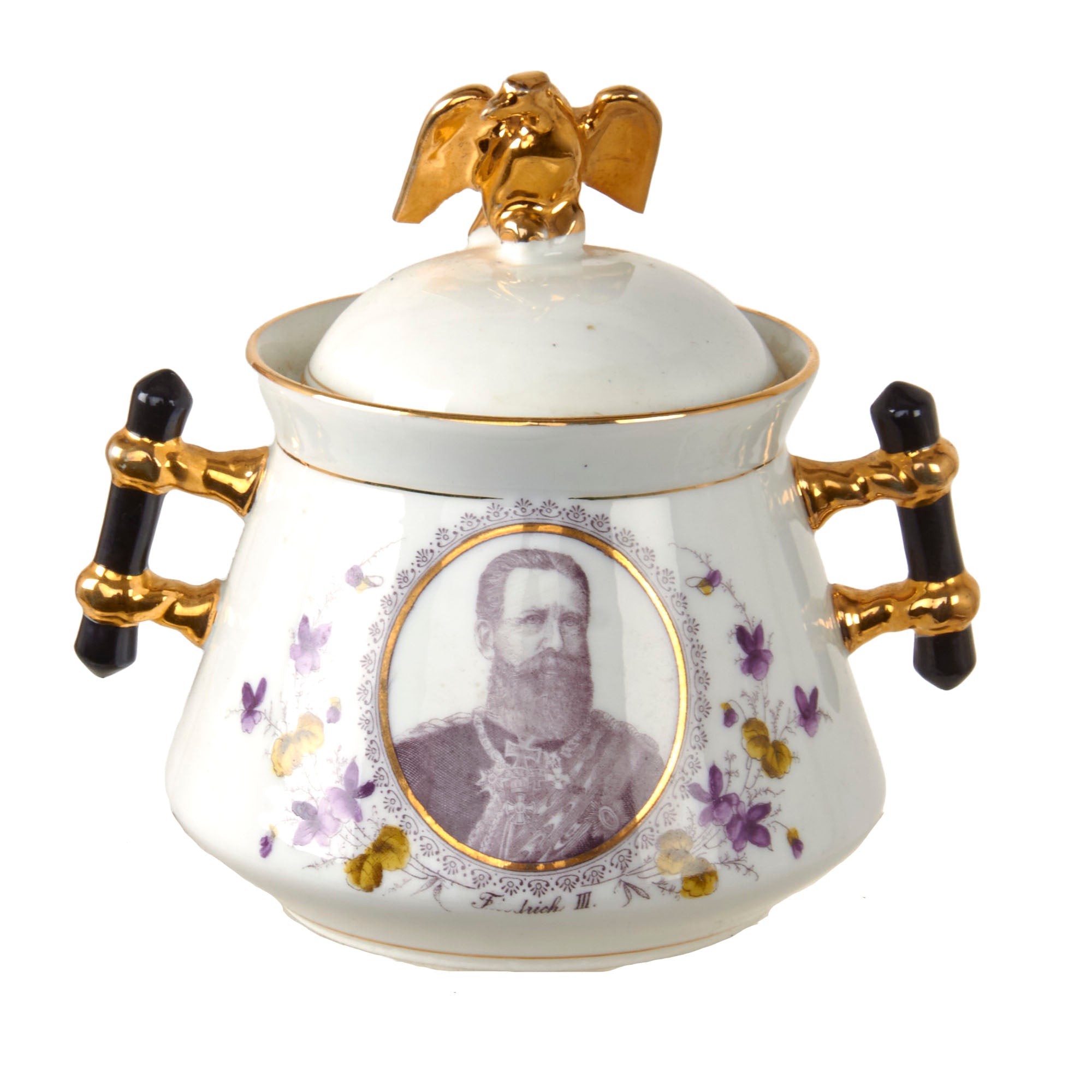 Original Items. Only One Set Available. This is an outstanding Imperial German tea set consisting of a porcelain teapot, sugar bowl, and three teacups depicting Wilhelm I, Friedrich III, and Wilhelm II. There are some minor chips and a repair in the teapot, but for a set that dates to the late 1890s - early 1900s, it has held up incredibly well. Both the lid of the teapot and sugar bowl have a gorgeous gold-painted Imperial Eagle at the top.