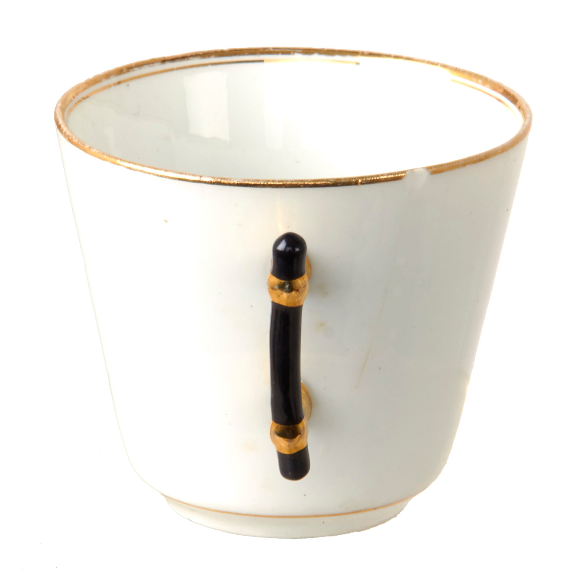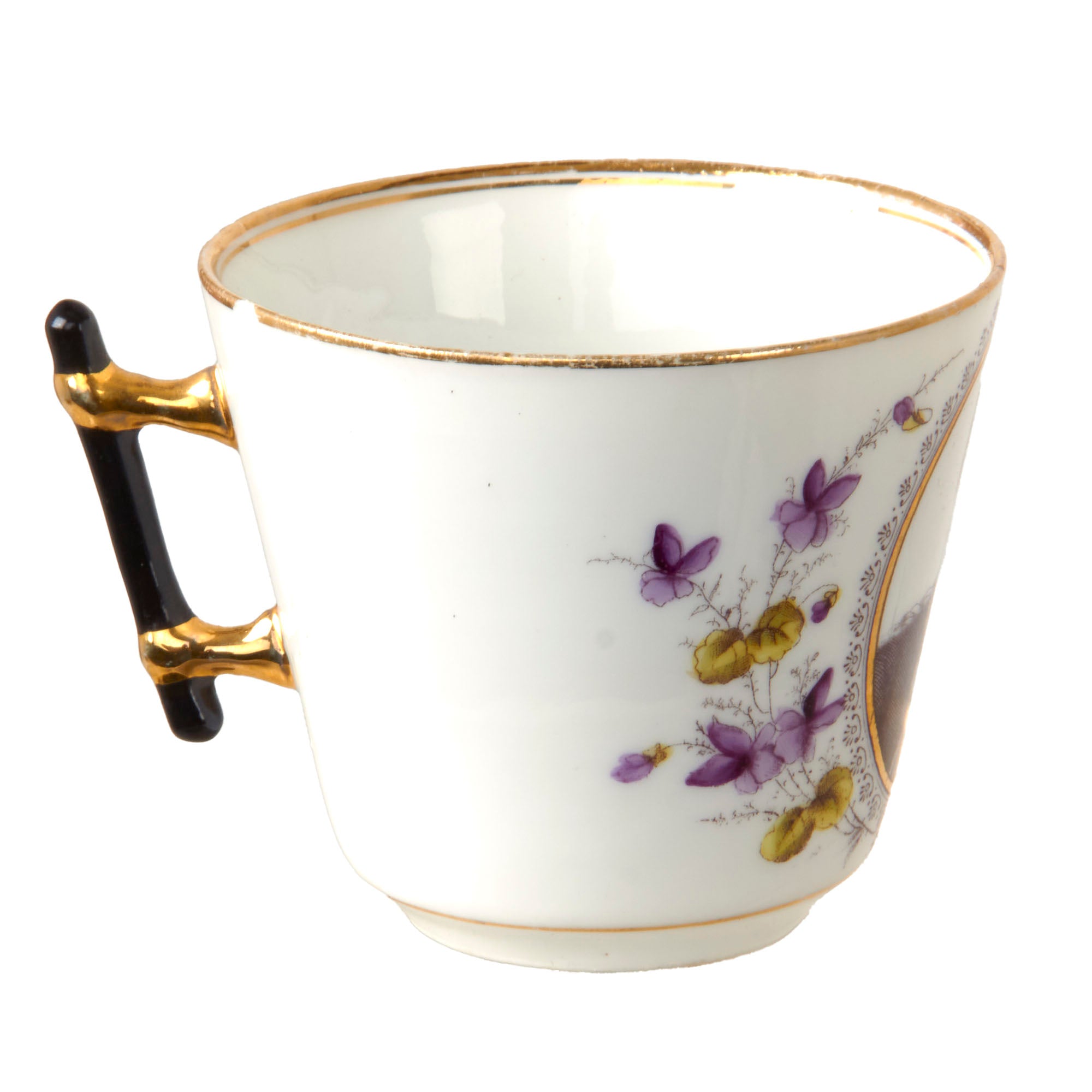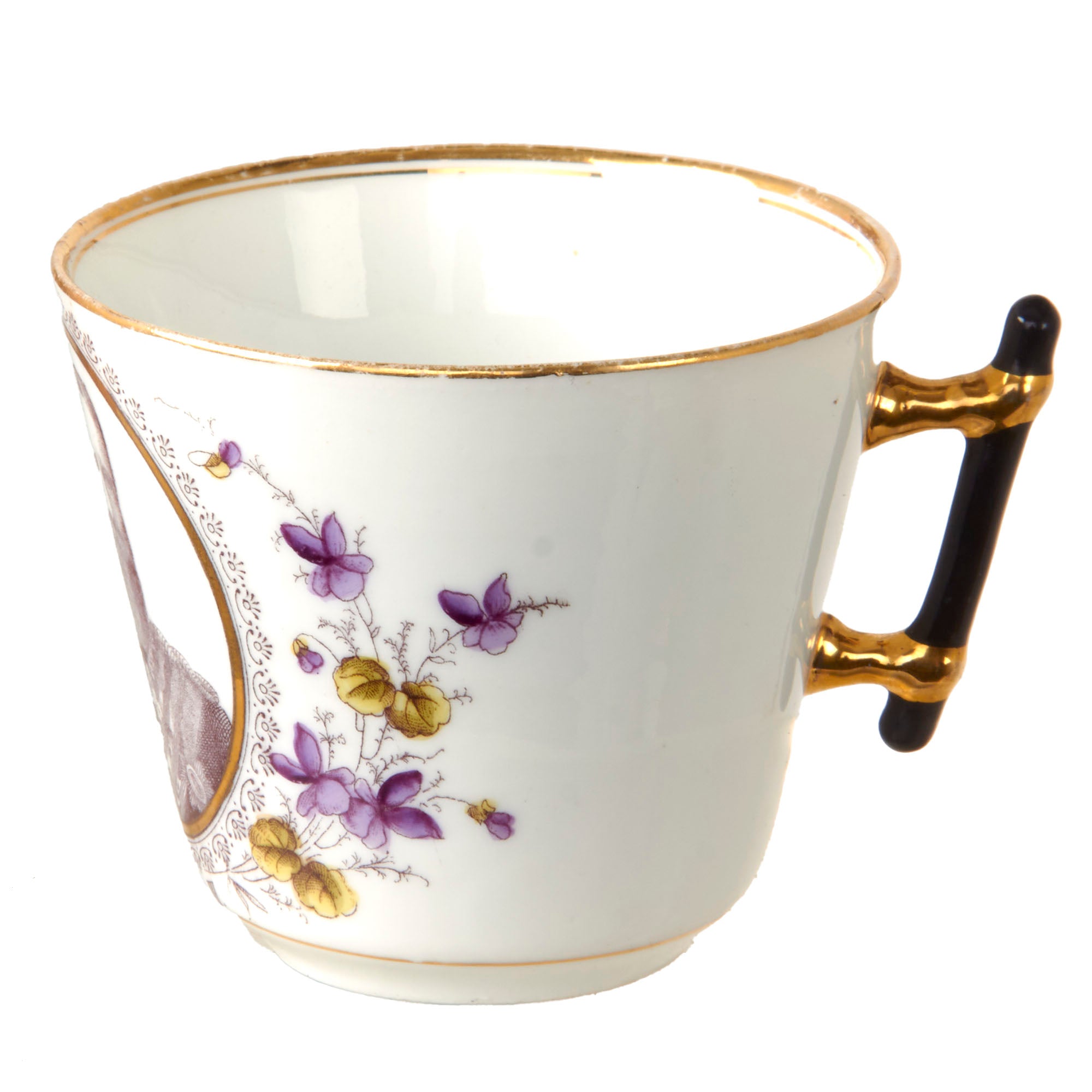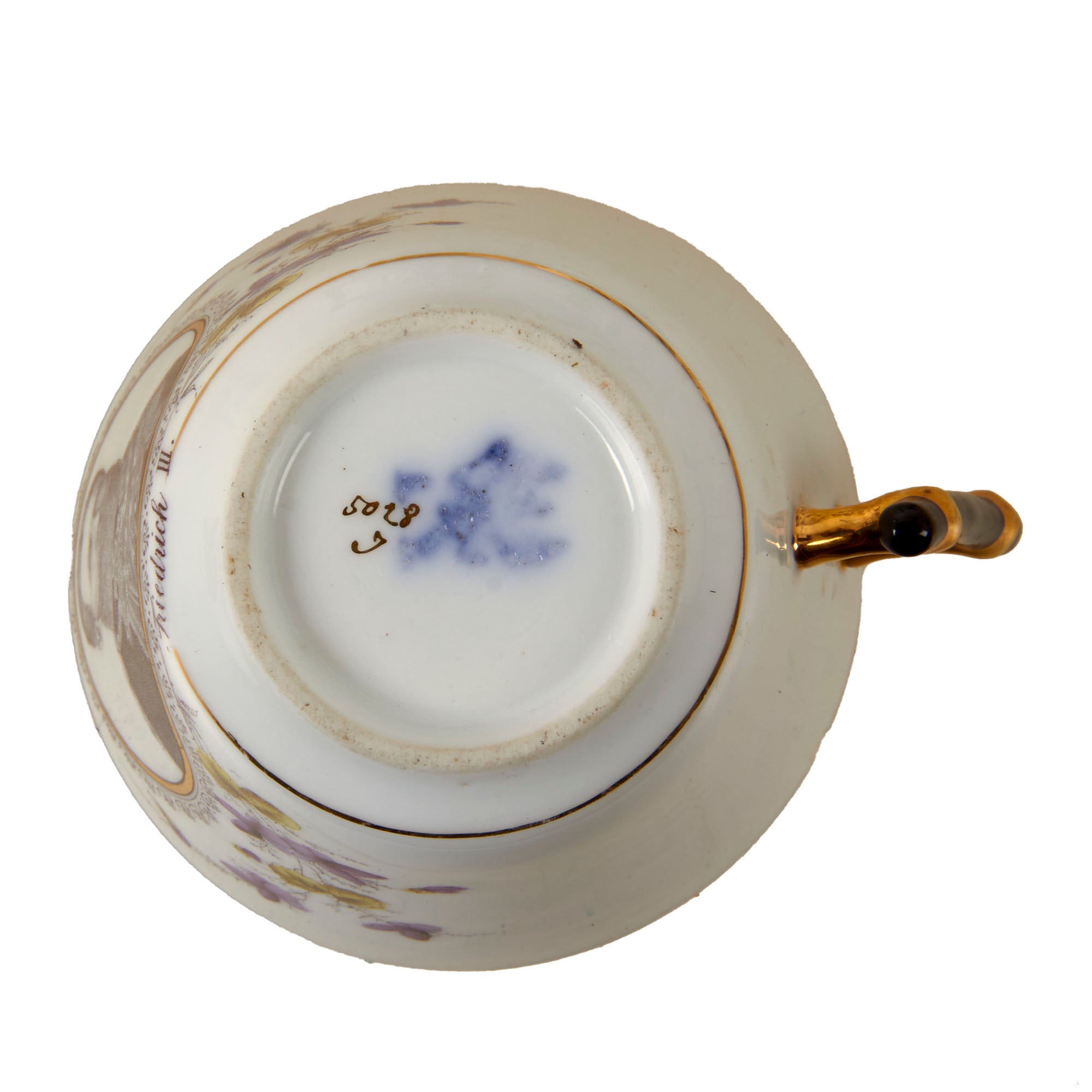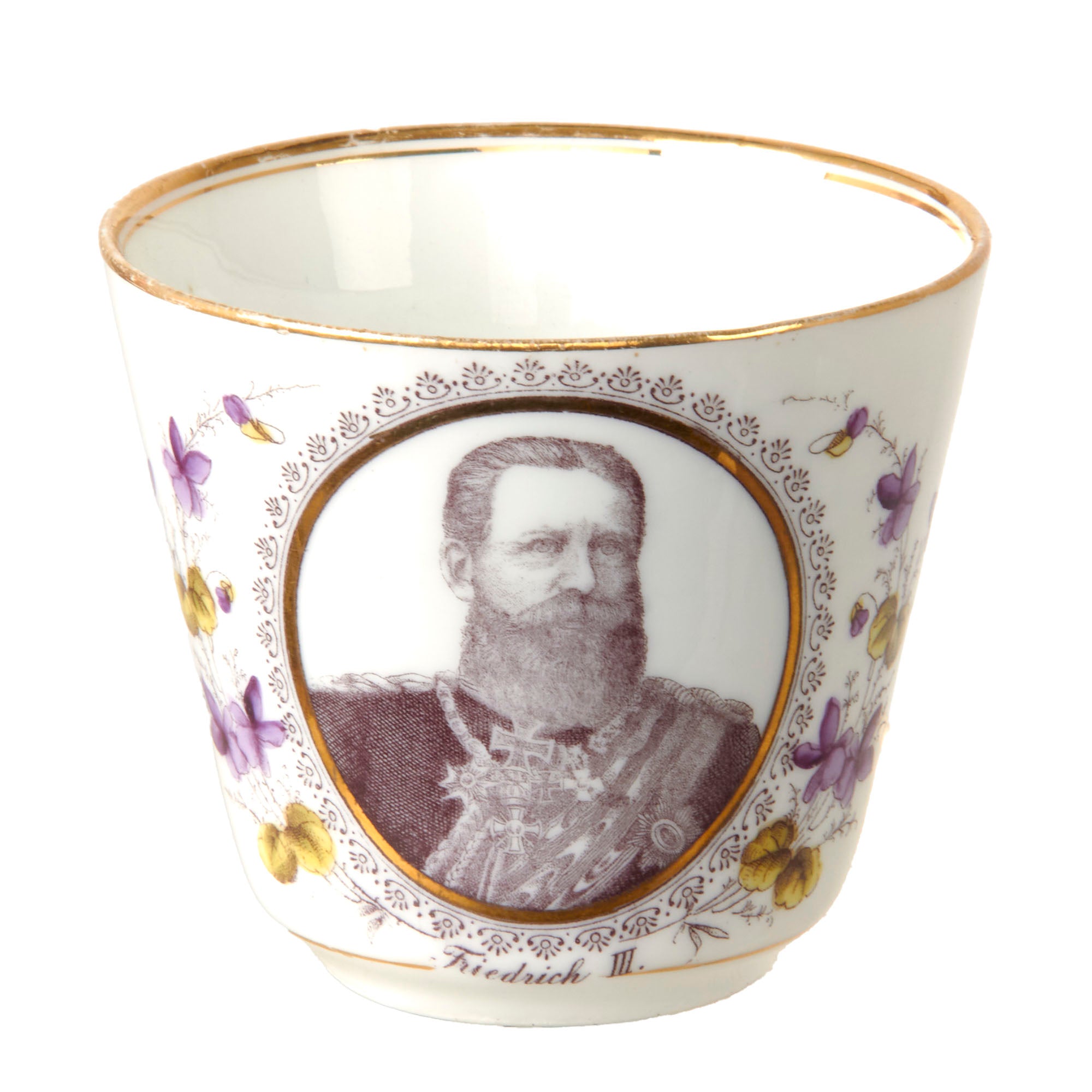 The sugar bowl measures 5 ½” tall with a 3” base diameter. They also feature the same two men. The teacups each measure 3” tall with a 1 3/4” base diameter. There are two of Friedrich III and one of a young Wilhelm II.