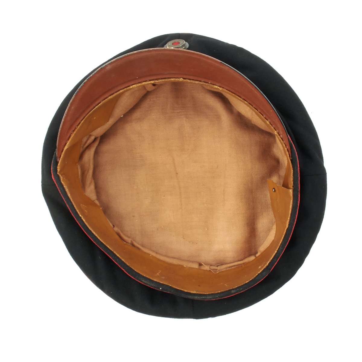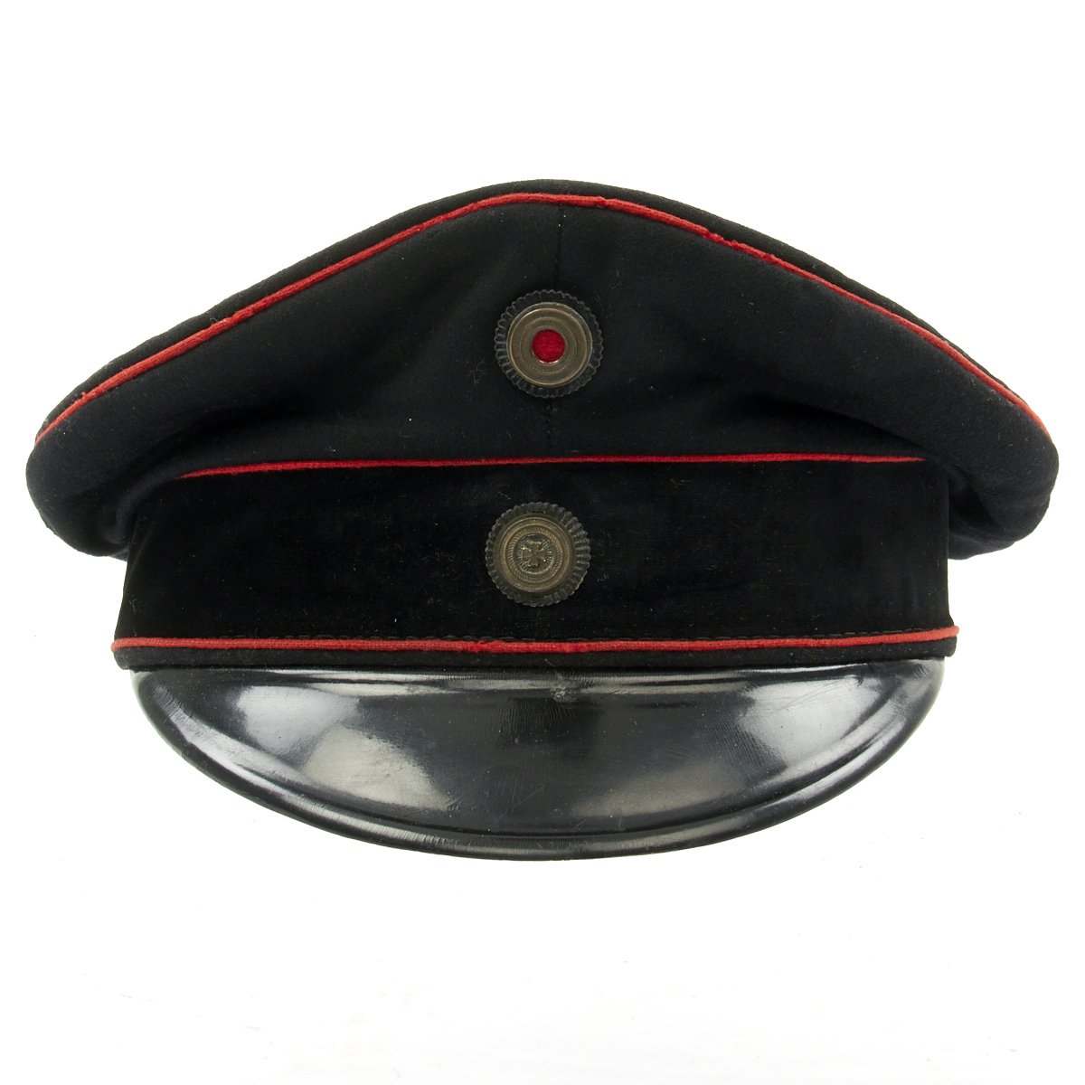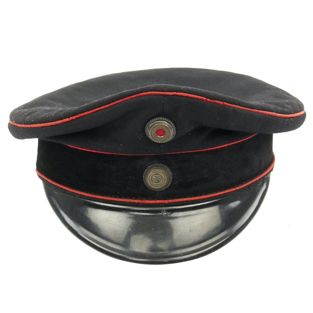 Original Item: Only one available. Imperial German officer's schirmmütze (visor cap) of the Prussian Versuchskompanie (Motorized), (later Kraftfahr Battalion). Constructed of dark blue wool with black cap band and red piping along with metal cockade and interior lining. Size is approximately US 7 (56cm). A wonderful text book genuine example!