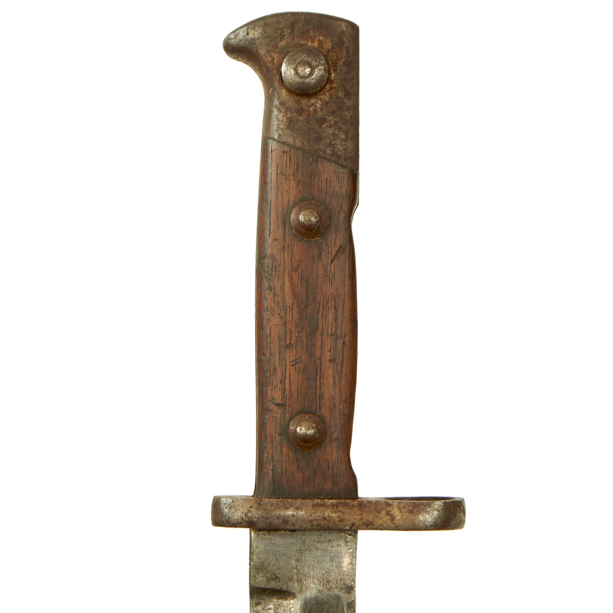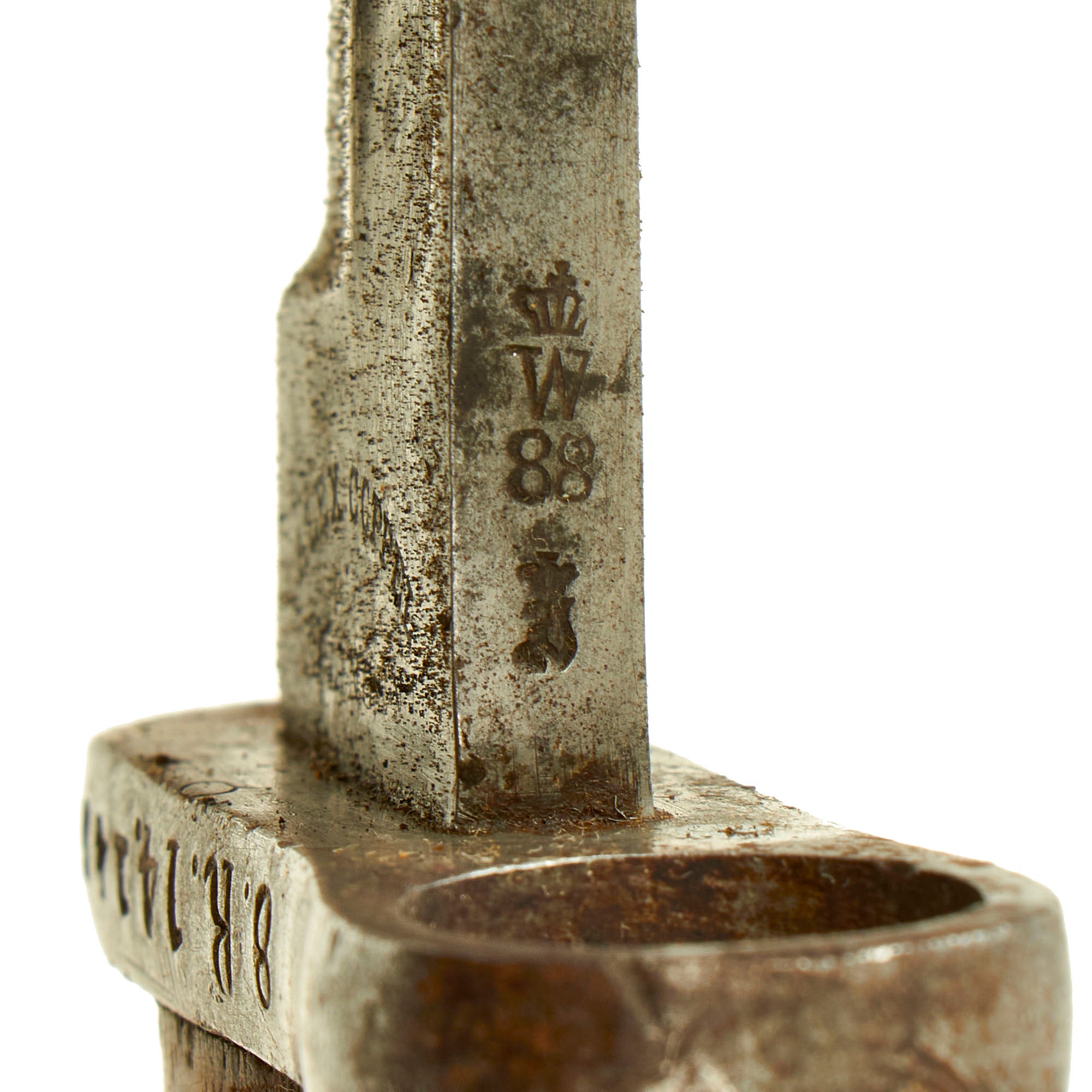 The Spine of this bayonet is marked (CROWN) / W / 88, indicating acceptance in 1888 by Kaiser Wilhelm II, and the year the bayonet was accepted (1915). There is also an inspector proof under the date marking.
