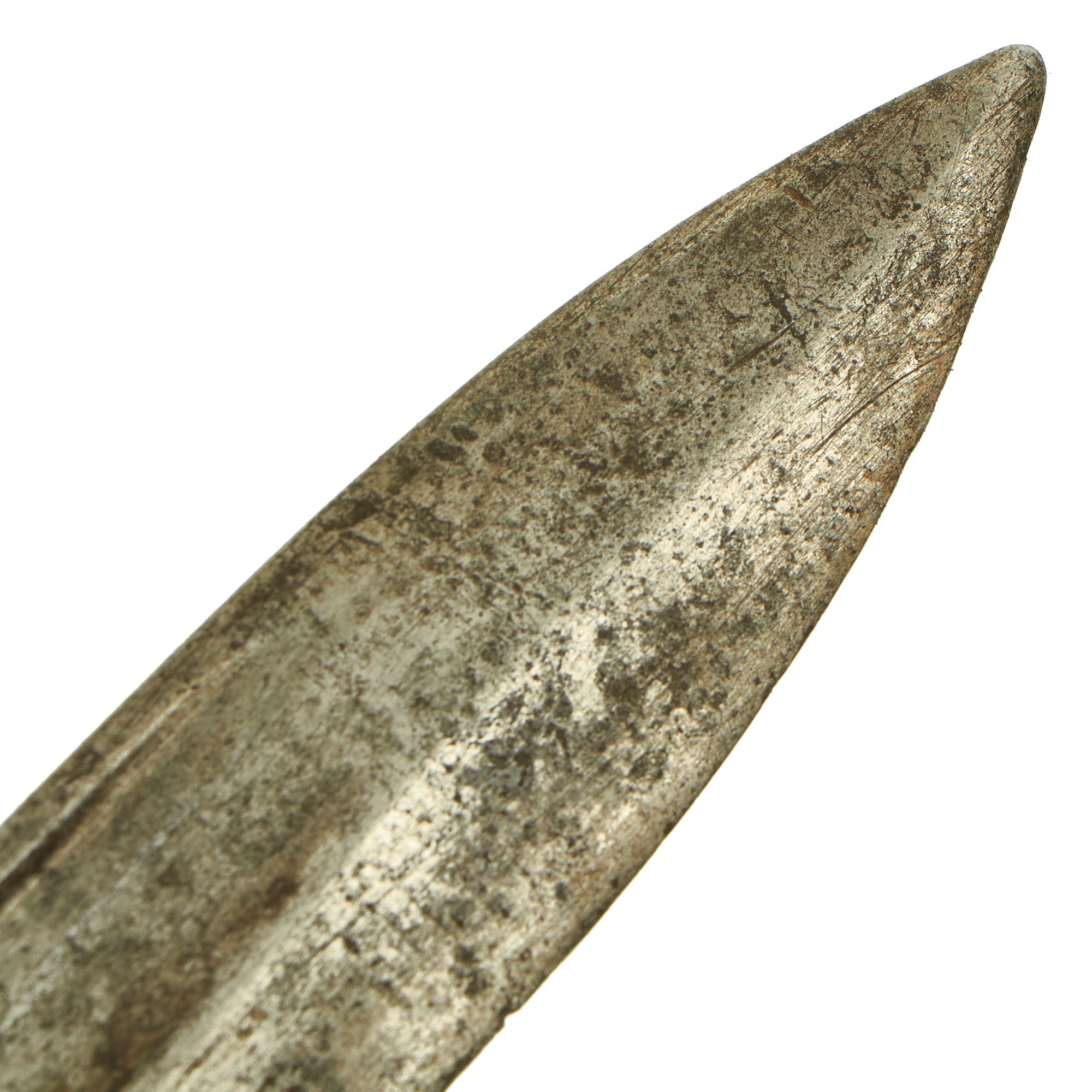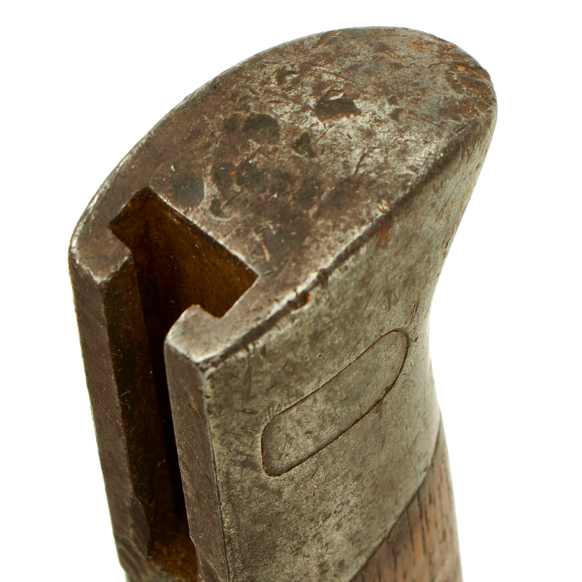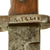 The steel blade is 10" long and is in very good condition, with just a few small areas of pitting on the spine and other areas. It has been sharpened a bit, but still has a lot of the original factory machining marks. The blade ricasso bears the maker marking: