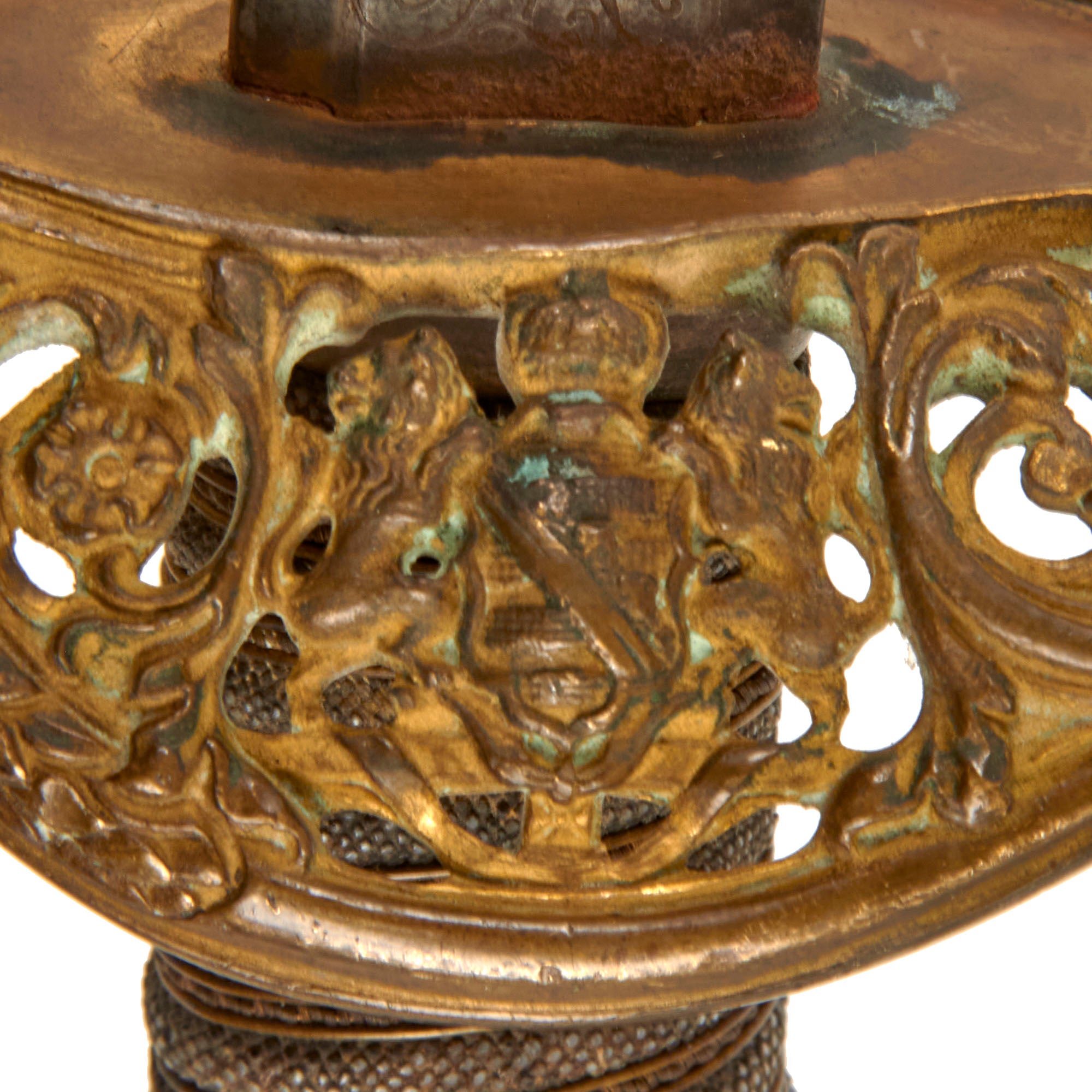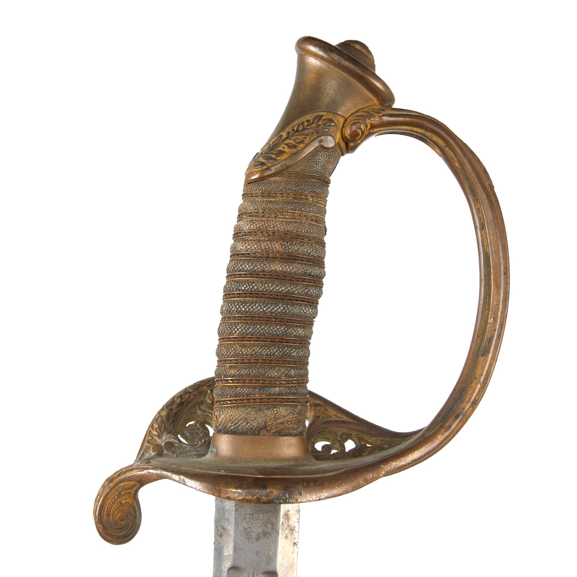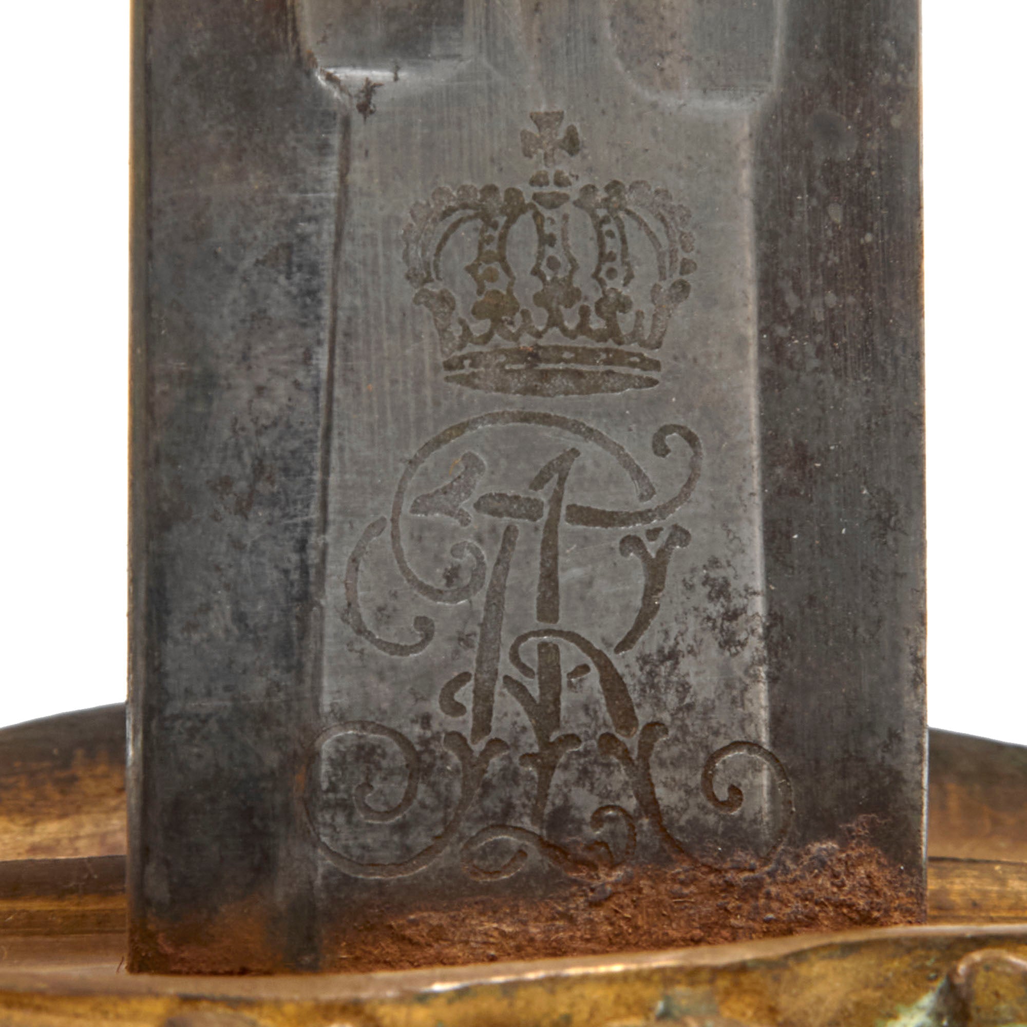 The 31 ⅝” blade is triple-fullered on both sides, with the etching EISENHAUER GARANTIRT / HAST & UHTHOFF. DRESDEN on one side in the center. This means “Iron Cutting Guarantee”. One side of the ricasso bears the Royal Cypher of Saxony, and the other side bears the double trademark "Knight's Helmet" (Ritter-helm) alongside a "Kings's Head" (königskopf) over W.K.C. logo of legendary German maker Weyersberg Kirschbaum & Cie of Solingen. This company is a famous manufacturer of military swords and cutlery in Solingen, Germany - a city famous since the middle ages for its metal-working and craftsmanship in sword making.