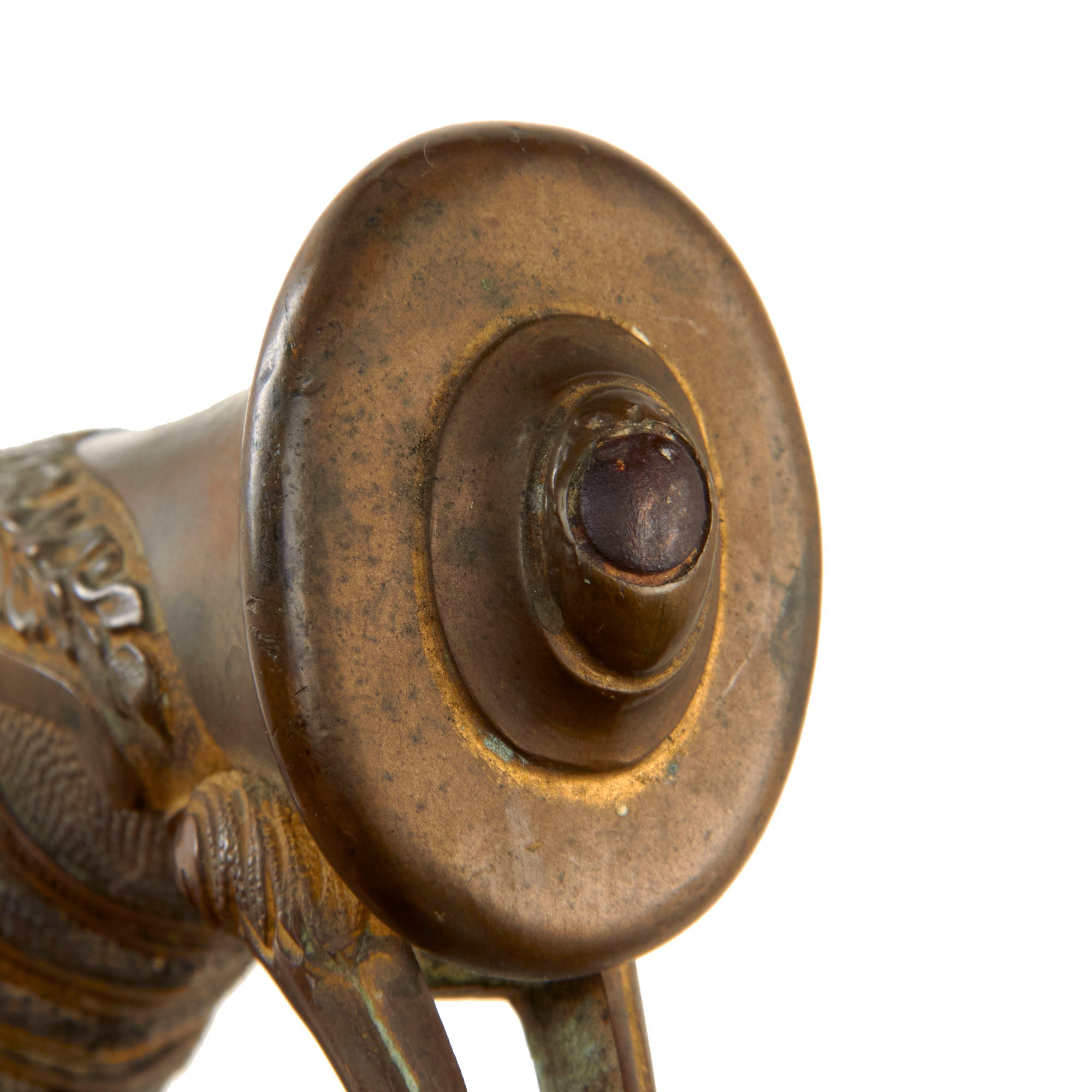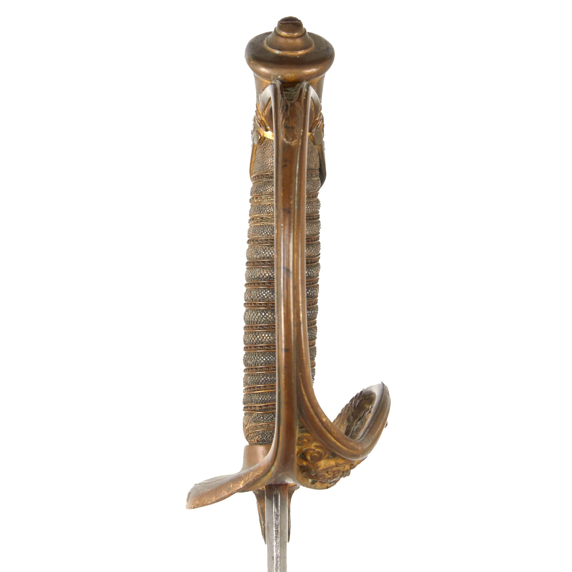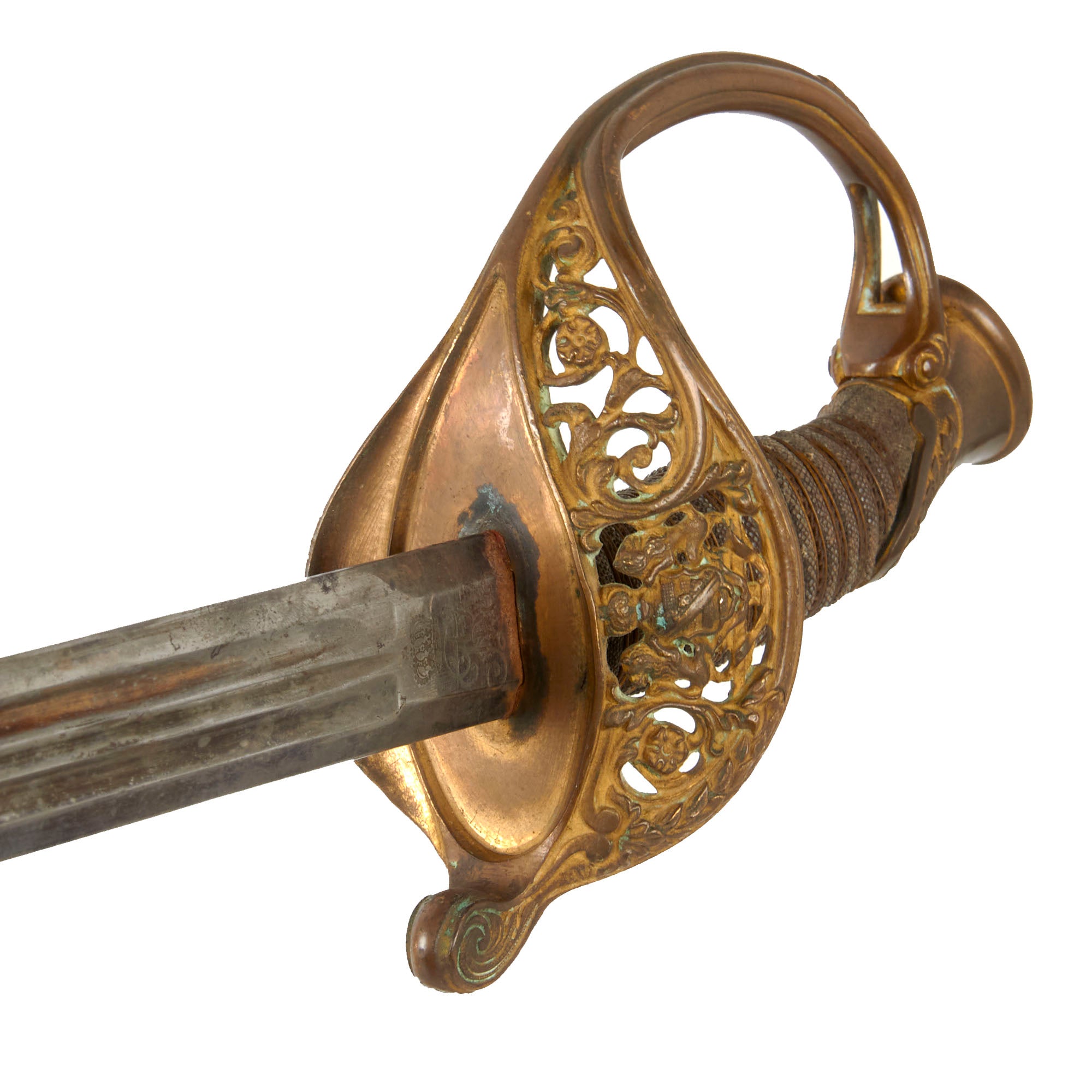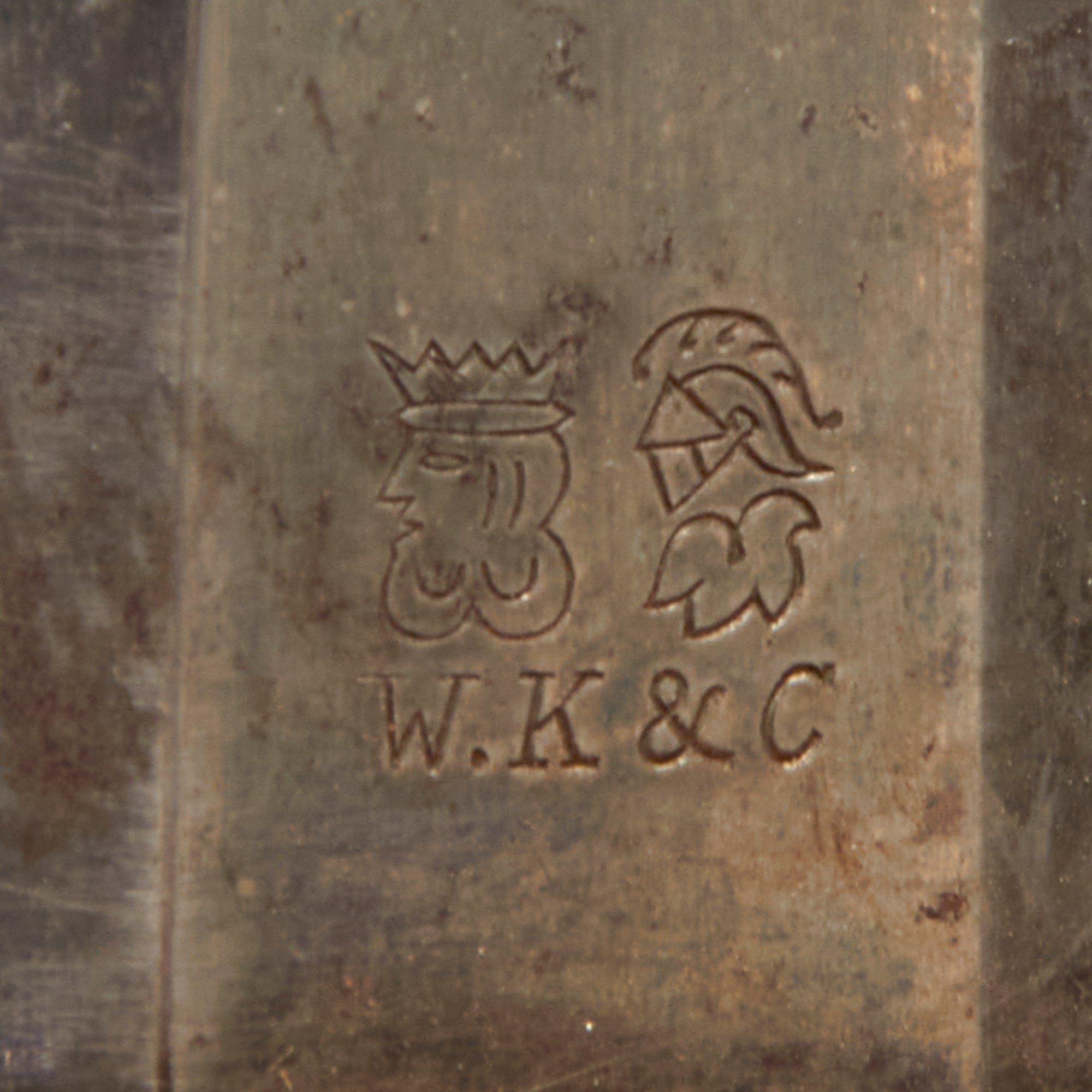 The 31 ⅝” blade is triple-fullered on both sides, with the etching EISENHAUER GARANTIRT / HAST & UHTHOFF. DRESDEN on one side in the center. This means “Iron Cutting Guarantee”. One side of the ricasso bears the Royal Cypher of Saxony, and the other side bears the double trademark "Knight's Helmet" (Ritter-helm) alongside a "Kings's Head" (königskopf) over W.K.C. logo of legendary German maker Weyersberg Kirschbaum & Cie of Solingen. This company is a famous manufacturer of military swords and cutlery in Solingen, Germany - a city famous since the middle ages for its metal-working and craftsmanship in sword making.