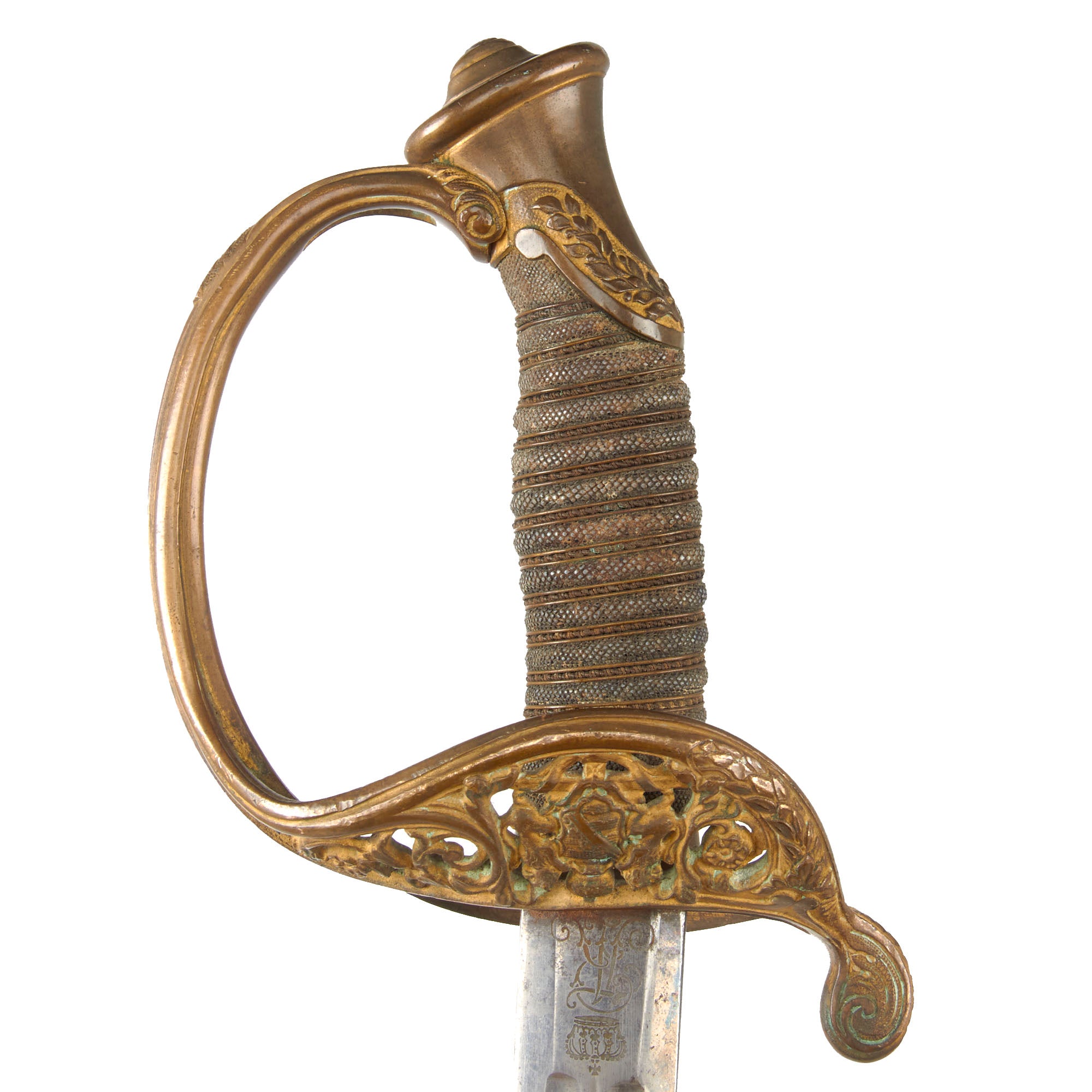 Original Item. Only One Available. This is an original German Saxony Model 1867 Infantry Officer’s Sword with typical decorated brass hilt comprising the royal coat of arms of the State of Saxony to the guard. Most examples of this model have a folding guard, so this is likely an earlier example. The grip is wire-wrapped sharkskin, and the blade has a deeply engraved royal cypher.